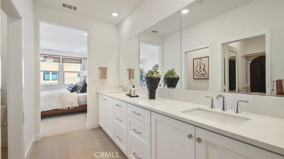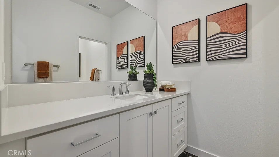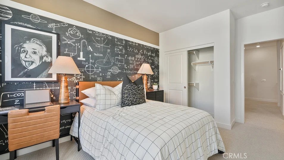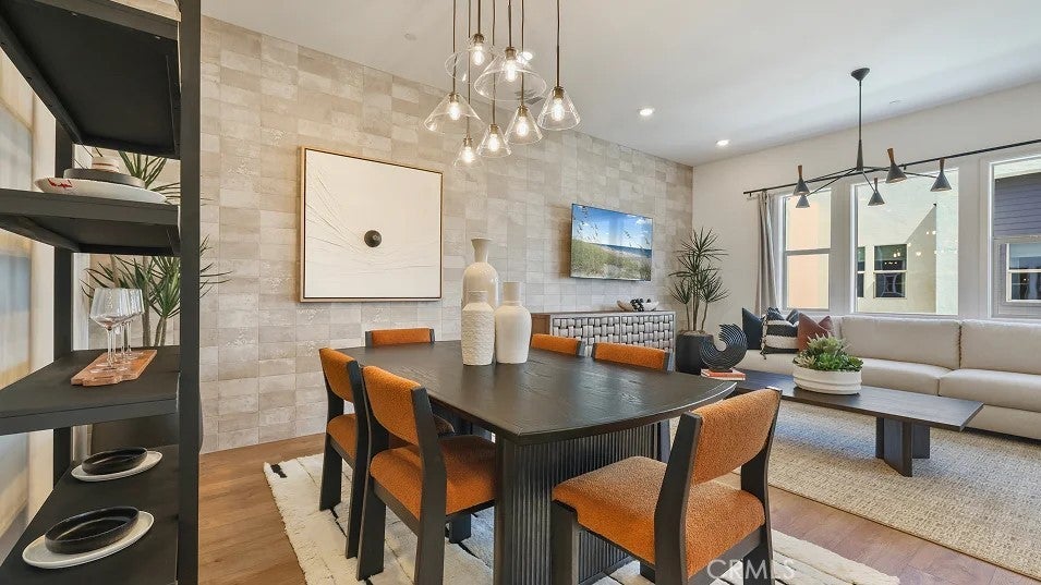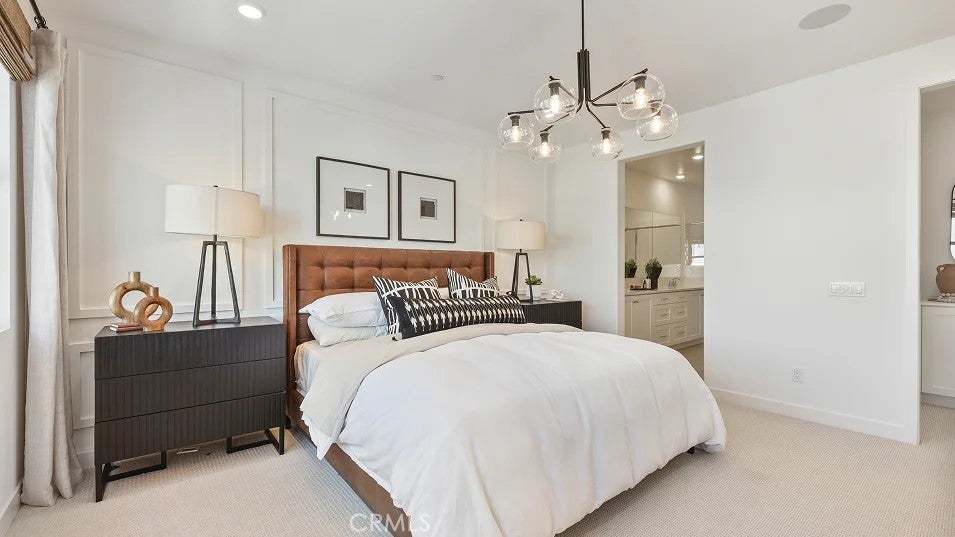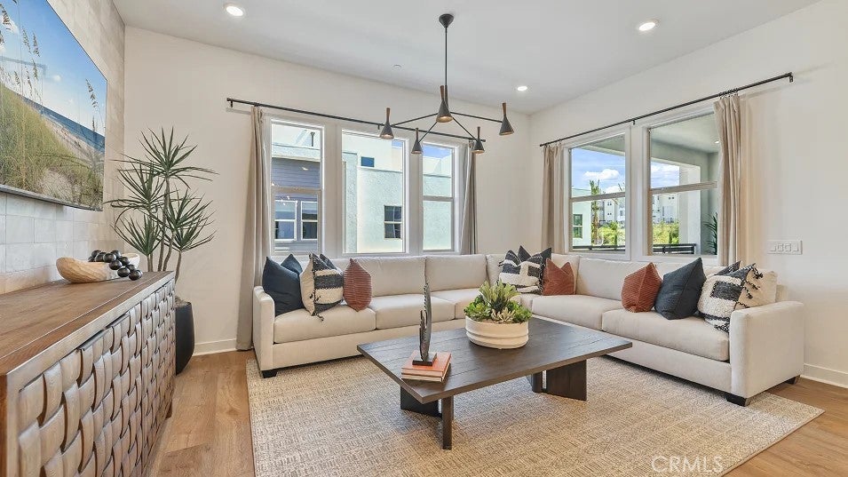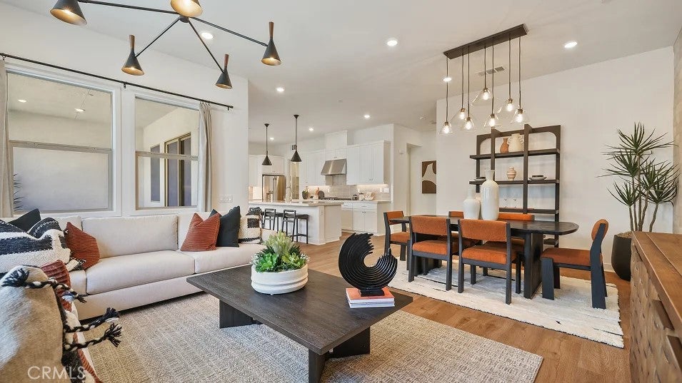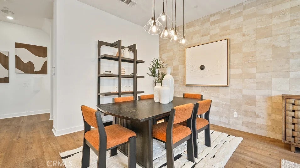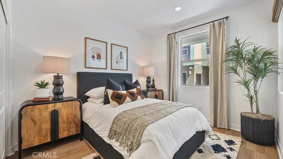 This townhome was designed with family living in mind. The first floor features a versatile secondary bedroom and full bathroom, while the Great Room, kitchen and dining room are arranged among an open floorplan on the second level. A deck is accessed through sliding glass doors off the kitchen. Three more bedrooms, including the luxe owner’s suite, are found on the third floor. A rooftop deck is ideal for entertaining and outdoor living. Designer upgraded flooring included as well. Metro Heights is a luxury gated masterplan community of new homes on the hills above Montebello, CA.