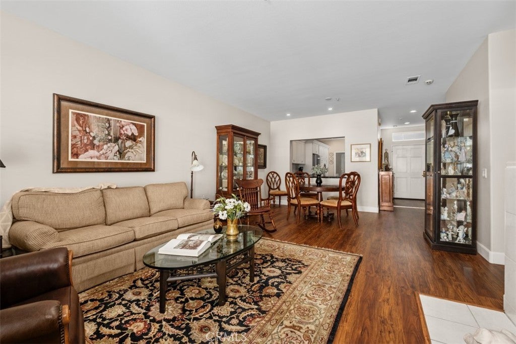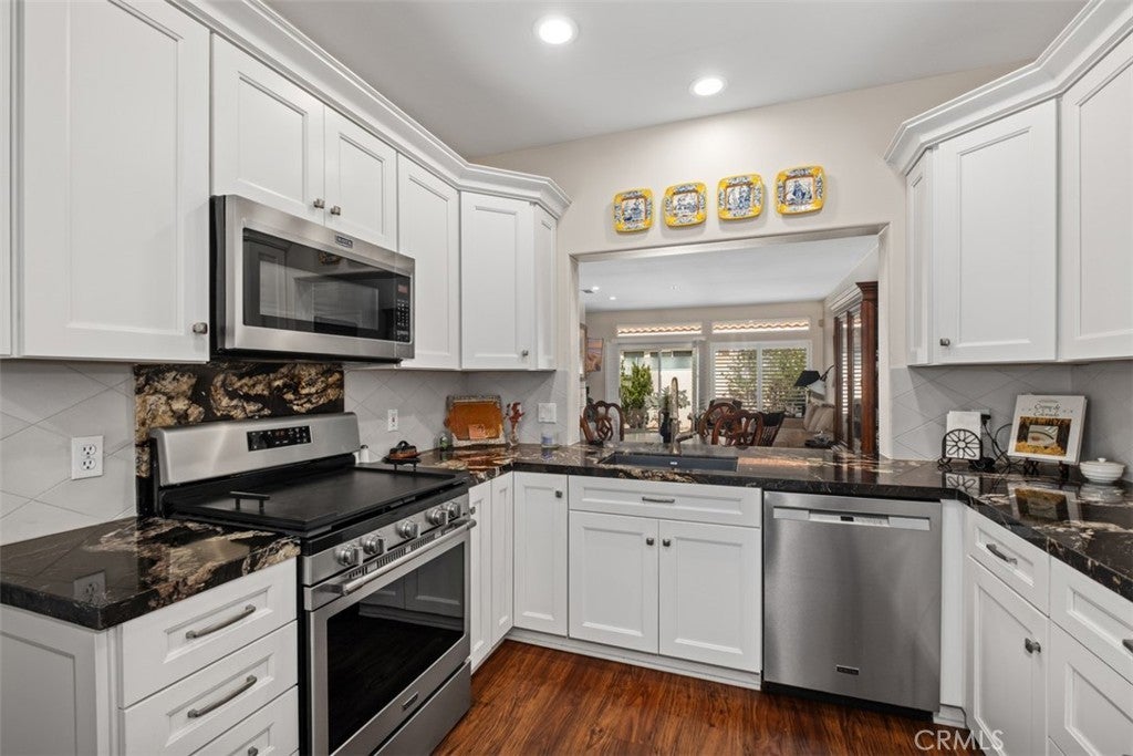 Welcome to resort-style living in the highly sought-after 55+ Palmia senior community. This beautifully maintained 2-bedroom, 2-bath condominium is truly move-in ready and offers comfort, style, and an exceptional active-adult lifestyle. The home features luxury vinyl wood flooring throughout and a totally remodeled kitchen with custom cabinetry, granite countertops, stainless steel appliances, a granite sink, and a charming breakfast nook. From the formal entry, you’ll find a guest bedroom and a remodeled full bathroom. The inviting living room boasts vaulted ceilings, a cozy fireplace, plantation shutters, and direct access to the private back patio, perfectly positioned next to the formal dining area for easy entertaining. The spacious primary suite is located at the rear of the home for added privacy and includes plantation shutters and direct patio access. The remodeled primary bathroom features custom cabinets, with dual sinks and granite counters, a large walk-in shower, a separate water closet, and a generous walk-in closet. Additional highlights include full PEX re-piping and a highly desirable two-car driveway. Residents of Palmia enjoy an unparalleled array of amenities, including an 18-hole putting green, tennis, paddle tennis, pickleball, bocce courts, a fitness center, billiards room, elegant clubhouse, library, card room, numerous clubs, social events, and more. Ownership also includes membership to Lake Mission Viejo, offering boating, sandy beaches, and popular summer concerts. A wonderful opportunity to enjoy vibrant, active living in Mission Viejo’s premier gated communities.