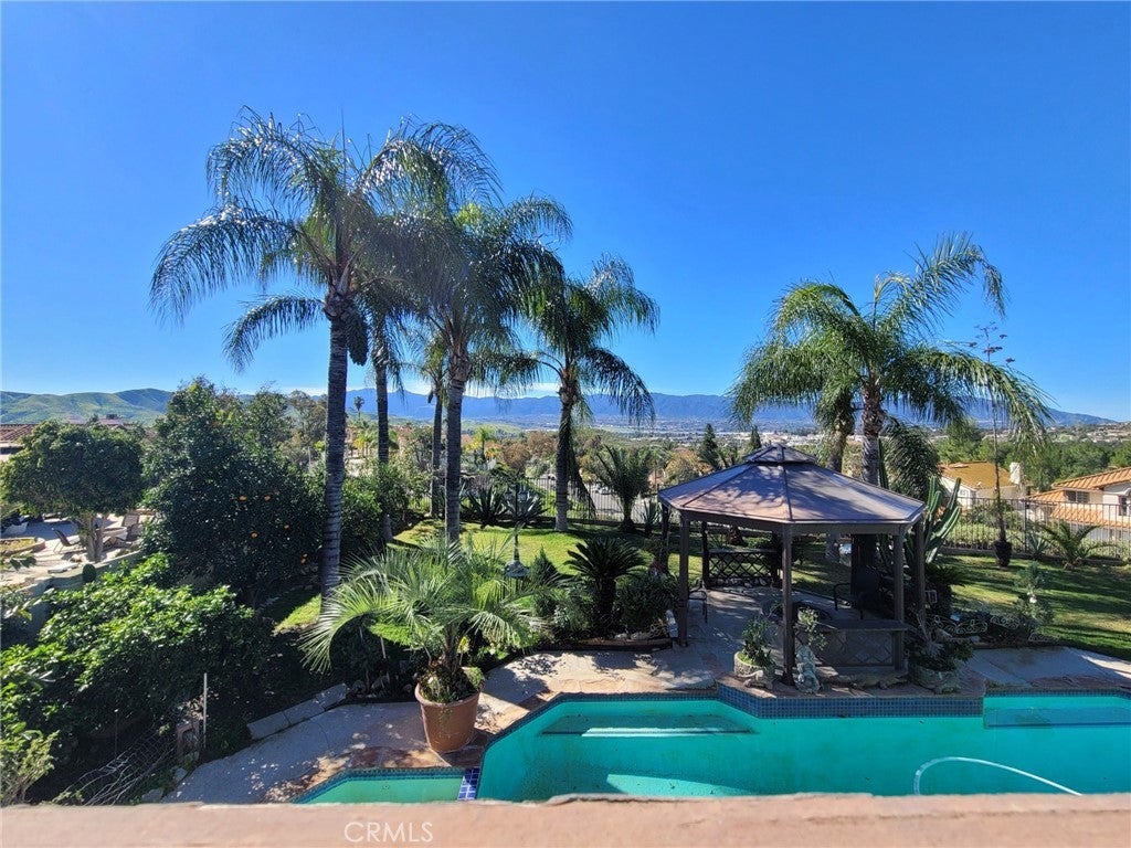 Stunning Corona Hills home with breathtaking panoramic views of hills, mountains, and city lights. This beautifully maintained property features a private backyard retreat with pool, spa, gazebo, fire pit, and an expansive lot with mature fruit trees including mango, citrus, nectarine, and grapefruit. Elegant entry with landscaped garden, formal living and dining areas, upgraded kitchen, remodeled downstairs bath, and custom iron staircase handrail. Main-level laundry room with sink. All bedrooms upstairs. Spacious primary suite with walk-in closets and wraparound balcony to enjoy the incredible views. Three-car garage. Excellent condition and move-in ready.