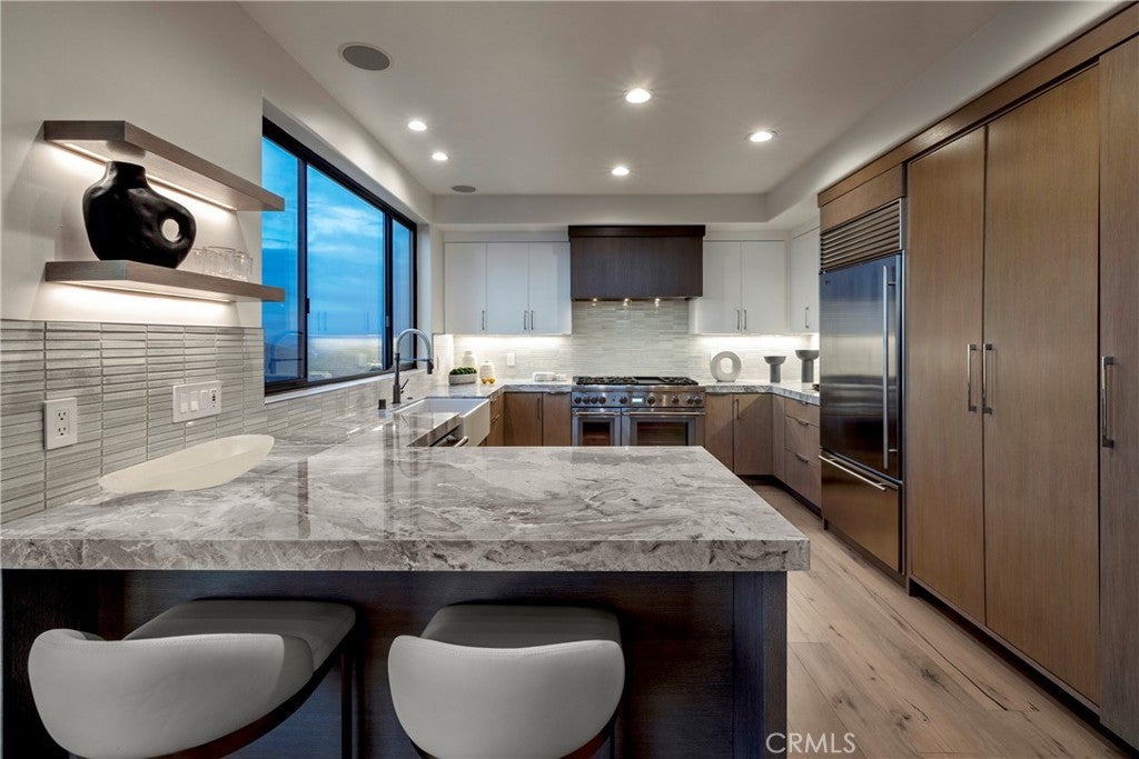 Skyline Drive - an iconic address earning its name every evening when the sun drops behind Catalina and sets the Pacific on fire. Captivating views, layers of scenic canyons, Catalina Island suspended at the edge of the Pacific beyond your own terraces.At the crest of Mystic Hills, on just over a quarter acre overlooking Laguna Beach, this Contemporary-style residence was built in 1994 and comprehensively reimagined in 2023. The 2,780-square-foot home, with four bedrooms and four baths, presents an ideal floor plan that enhances modern living and entertaining while accommodating evolving lifestyles. The principal living spaces and primary suite open directly onto ocean and canyon-facing terraces, where first light moves quietly across the interiors and sunsets command ambience. A dedicated lower level provides private guest accommodations or ancillary bedrooms with independent terrace access — separate, composed, quietly self-contained. Provenza hardwood floors, Onyx Glass windows, volume ceilings, custom millwork, and Sonos whole-home audio shape interiors that feel curated yet effortless. New HVAC and earthquake-resistant structural engineering ensure performance keeps pace with presentation. The kitchen and dining area form the gravitational center of the home — Bardiglio Versilis marble countertops, Raku rift oak cabinetry, Thermador and Sub-Zero appliances, and a waterfall bar elevate everyday living experiences. Beyond the interiors, the lot and exterior descend with uncommon depth, creating opportunity for terraced gardens, expanded outdoor living, or simply the quiet luxury of space at elevation. Further complementing this exceptional property – a picturesque ‘walkable’ enclave, a short distance from the Village, galleries, beaches, and the benefits of a coastal lifestyle, along with the accessibility of Coastal Orange County’s finest amenities, beaches, recreation, and resources.