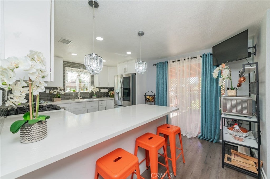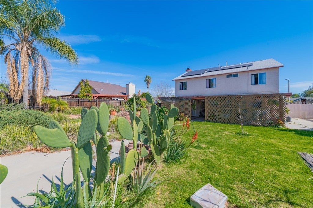 Beautifully spacious 4-bedroom, 2.5-bath home featuring a functional layout designed for comfortable living. The inviting living room offers high ceilings and a cozy fireplace, creating a bright and welcoming space for relaxing or entertaining. The remodeled kitchen showcases white cabinetry, quartz countertops, stainless steel appliances, and a walk-in pantry for added storage and convenience. A guest bathroom is conveniently located on the first floor. The primary suite includes a dual-sink vanity and a walk-in shower. Situated on an expansive 8,275 sq ft lot, this property offers generous front and rear yards. The backyard is designed for enjoyment, featuring a full-length covered patio, beautiful landscaping, a tranquil pond, and several fruit trees. A spacious side yard provides potential RV parking, and the house has solar, buyer to assume. Additional highlights include a two-car attached garage, no HOA, and low property taxes, making this a fantastic opportunity you won’t want to miss.