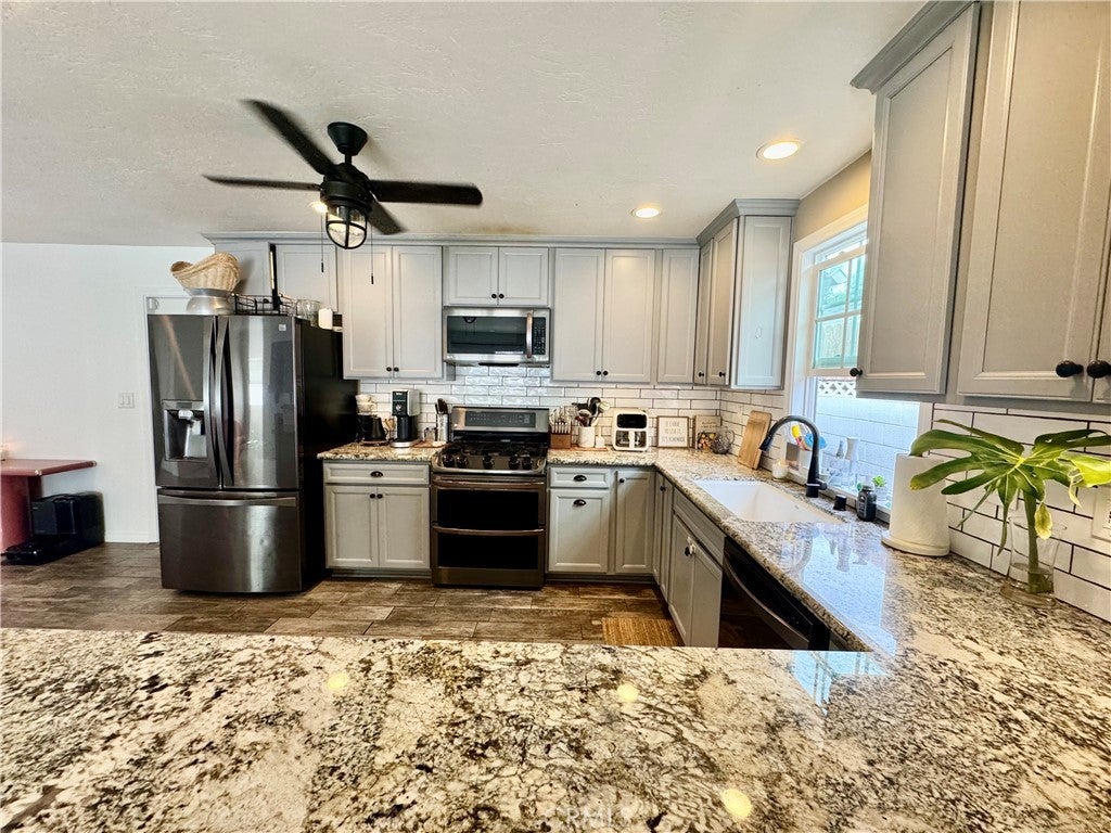 • Interior FeaturesBreakfast Bar, Ceiling Fan(s), Eat-in Kitchen, Granite Counters, Open Floorplan, Stone Counters, Recessed Lighting, All Bedrooms Down, Bedroom on Main Level, Main Level Primary, Primary Suite