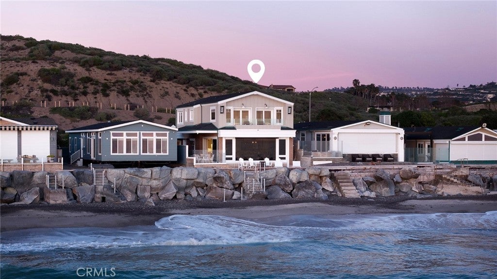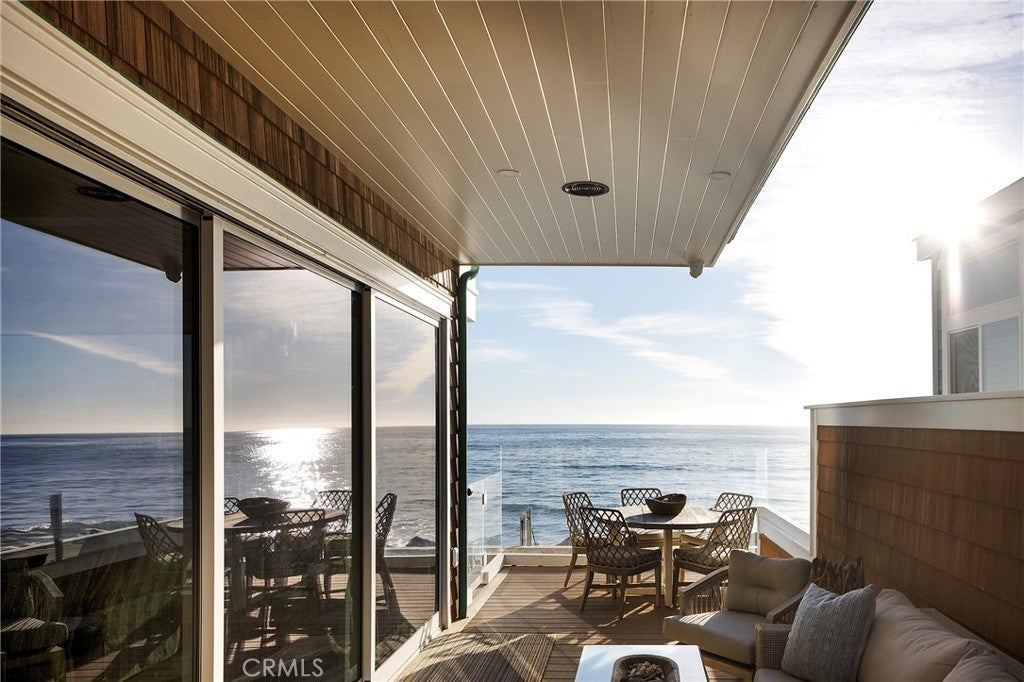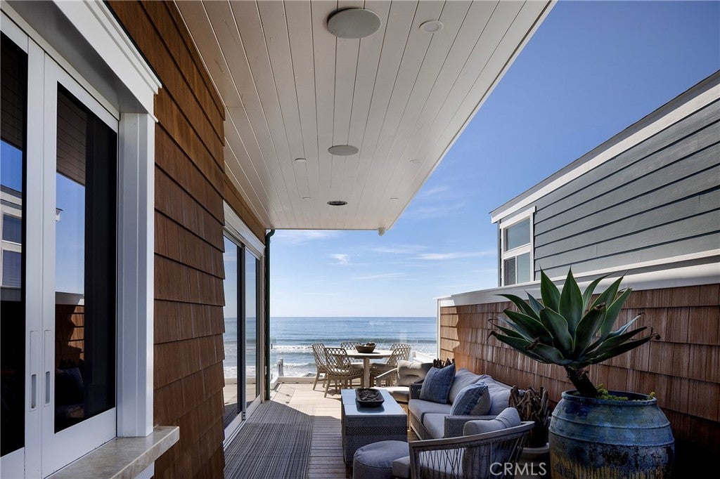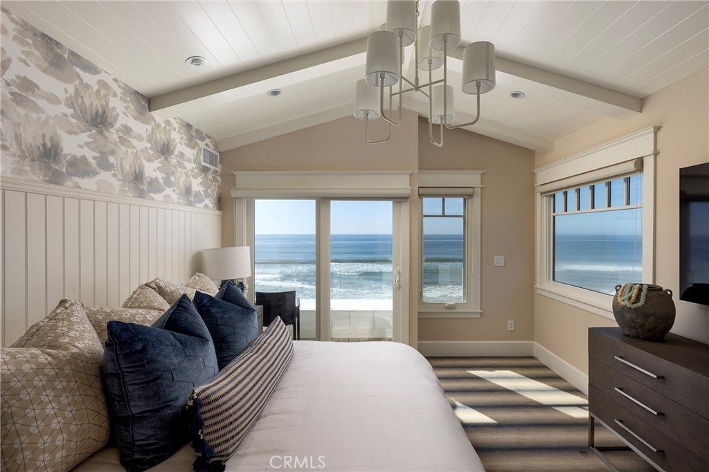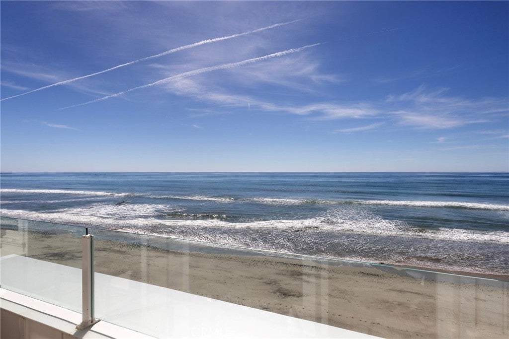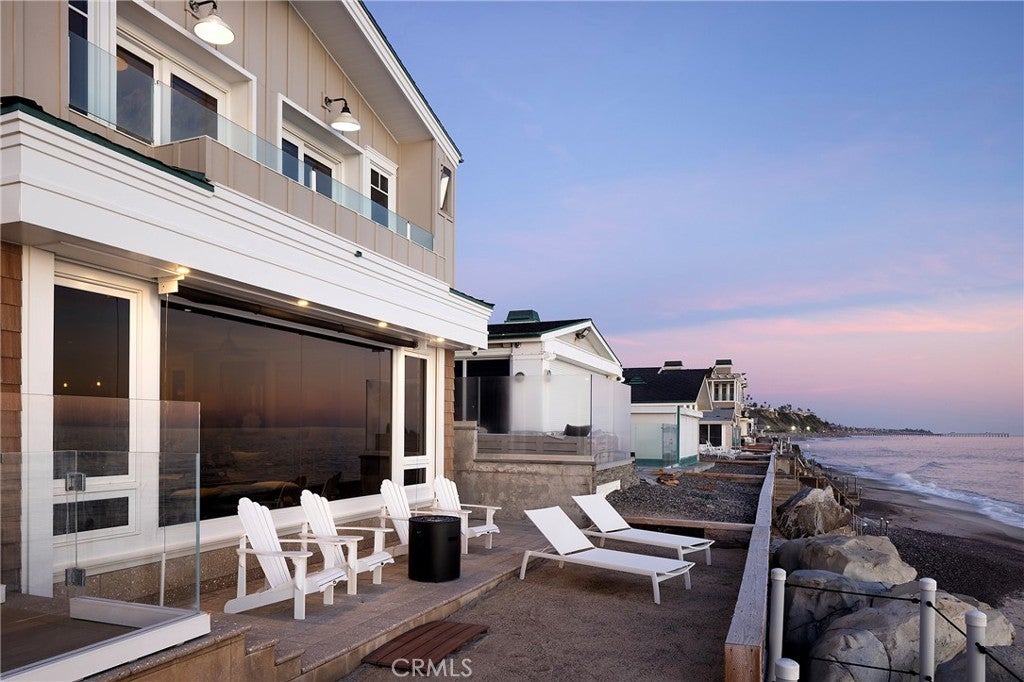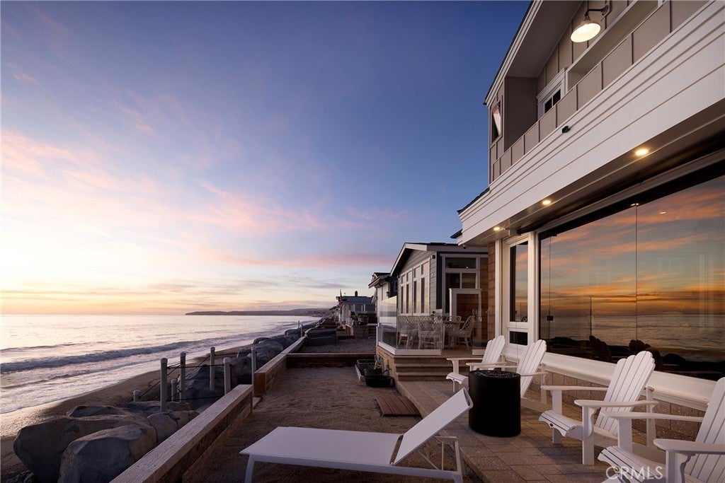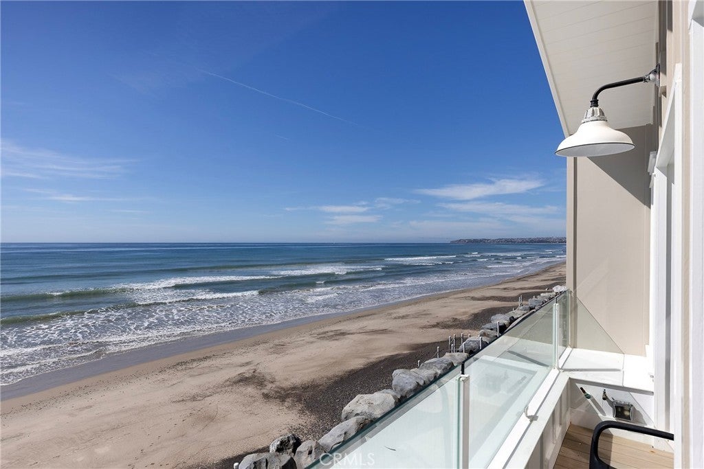 Drawing inspiration from the great shingled estates of Cape Cod yet firmly rooted on the sands of San Clemente, this oceanfront residence in Capistrano Shores is a study in craftsmanship, proportion, and restraint. Set directly at the water’s edge, both levels command sweeping views of the Pacific, Catalina Island, the harbor, pier, and coastline stretching north and south. Spanning nearly 3,000 square feet with six bedrooms and five baths, the home is composed for legacy living, generous in scale and intentional in every line. Arrival unfolds along a gated side approach, creating a refined transition to the interior, while the rear oceanfront terrace becomes the true centerpiece with honed travertine underfoot, a private sandy lounge area, and dedicated stairs descending directly to the beach. A pass-through kitchen window, outdoor shower, and convenient bath access create a seamless exchange between sea and interior. Inside, a Dutch door opens to light-filled living spaces defined by coffered ceilings, tailored millwork, and a commanding picture window that frames the Pacific as living artwork. The kitchen has been thoughtfully reimagined with satin Taj Mahal quartzite, custom cabinetry, integrated beverage drawers and ice maker, an Ann Sacks tile backsplash, and an apron-front sink, refined and understated, designed for gathering. Whitewater Oak LVP flooring unifies the home. Brazilian quartzite defines the butler’s bar and laundry, while labradorite granite lends depth to the upstairs guest bath. Of the two oceanfront primary suites, one bath is appointed in satin Taj Mahal quartzite and a Toto toilet, while the other features crema marfil marble countertop with dual sinks. Each primary suite opens to its own private balcony suspended above the horizon. Vaulted ceilings crown the upper level, where a bonus lounge and custom bunk rooms provide flexible accommodations without sacrificing architectural cohesion. Plantation shutters, curated stone selections, and bespoke built-ins reinforce the home’s sense of permanence. Automatic exterior shades and storm shutters integrate protection discreetly into the architecture, preserving clean lines and uninterrupted views. Capistrano Shores remains one of San Clemente’s most iconic oceanfront enclaves, moments from surf breaks, coastal trails, and downtown, yet wonderfully removed. A legacy residence at the edge of the Pacific, where architecture and horizon exist in deliberate balance.