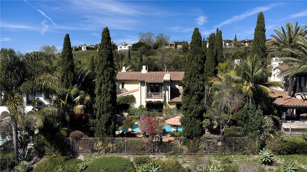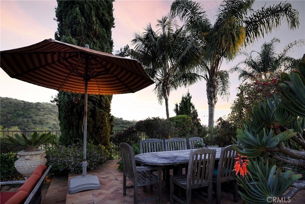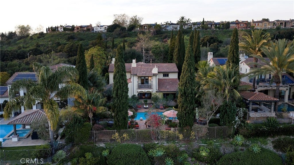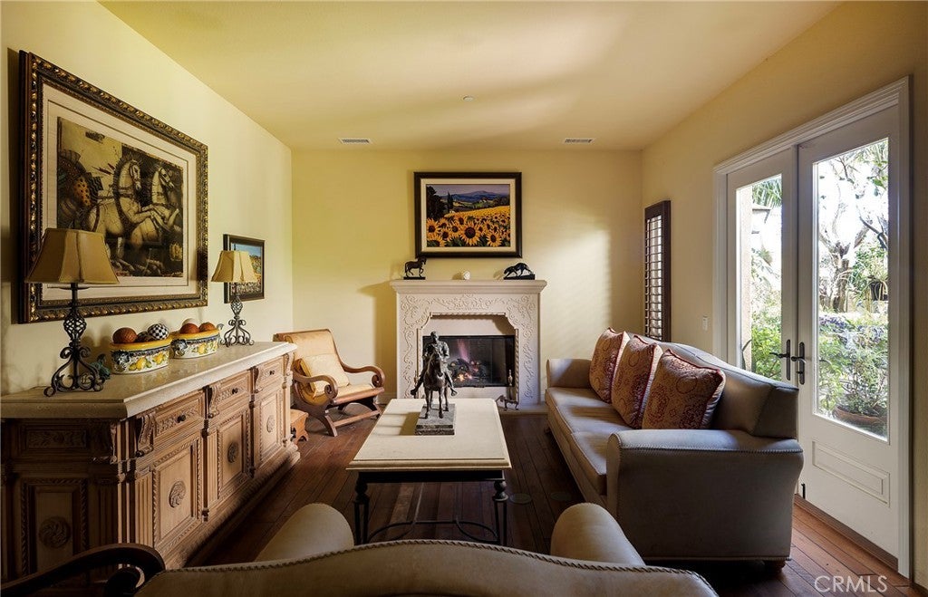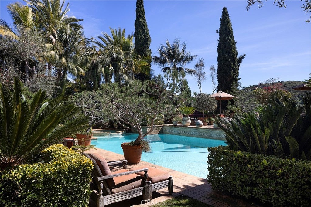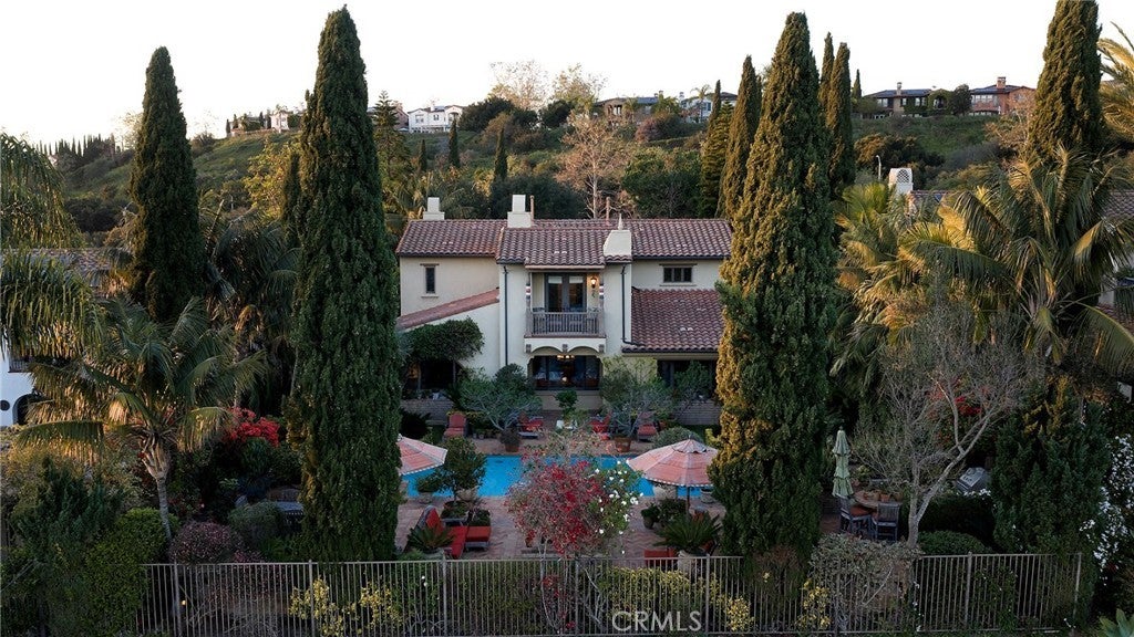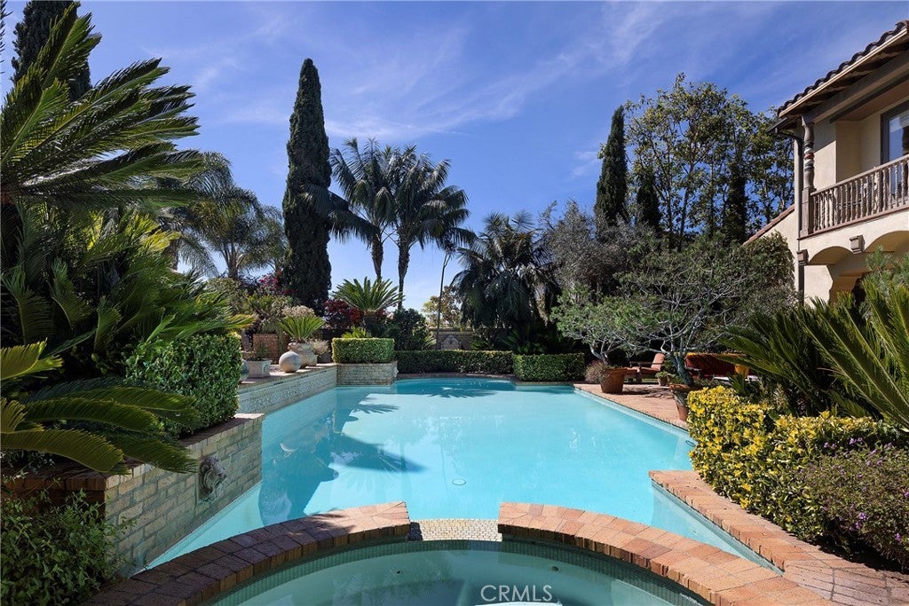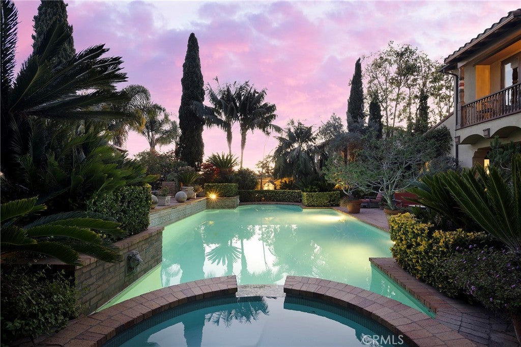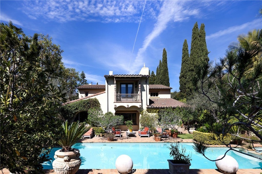 Set behind the gates of Careyes on one of its largest and most coveted 1/3-acre lots, this Italian Riviera–inspired estate unfolds like a private European retreat tucked quietly into the hills of San Clemente. From the moment you arrive, there is a shift. The architecture feels storied and intentional, rooted in another era. Soaring wood-beamed ceilings rise above Richard Marshall hardwood floors with intricate mosaic inlays, while wrought iron detailing, arched passages, and precast stone fireplaces create depth and romance throughout. The expansive floor plan offers six bedrooms, five full baths and two half baths, including two detached casitas. The downstairs casita is appointed with a high-end TV surround sound system, ideal for theater-style entertaining, while the upper casita offers its own private living space for guests or multigenerational flexibility. Formal and informal spaces flow into a gourmet kitchen with professional-grade appliances and granite countertops, allowing the home to live as beautifully as it entertains. Interior rooms and garden areas were pre-wired for high-end sound, creating a seamless indoor-outdoor experience. Upstairs, the primary suite serves as a private sanctuary, opening to a double-doored balcony with peek-a-boo ocean views beyond the rolling fairways of the Fred Couples–designed championship golf course and adjacent natural preserve. Yet it is the grounds that truly set this property apart. The backyard unfolds in terraces of aged brick, a rare architectural landscape that evokes the romance of the Italian coast. Imported Italian planters frame the estate, while mature landscaping forms a living wall of privacy, enclosing the property in quiet seclusion. Strategically placed water features provide a constant, soothing soundtrack as birds move through the trees throughout the day. At the heart of the garden, a resort-caliber pool shimmers with imported Walker Zanger Italian tile, paired with a heated spa that spills gently into the pool in a continuous cascade. Sunlight moves across brick and water as the day unfolds, creating an atmosphere that is immersive, transportive, and remarkably serene. Every pathway, hedge, and terrace has been considered with intention. The outdoor experience is not an accessory to the home. It is its soul.
