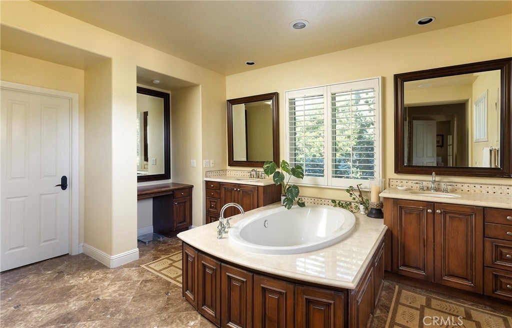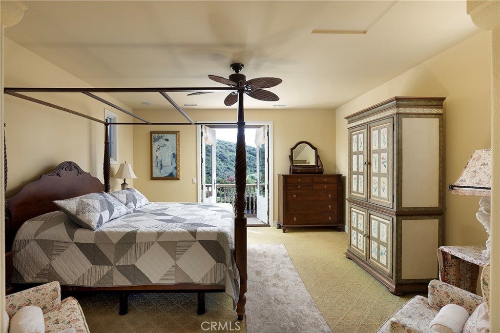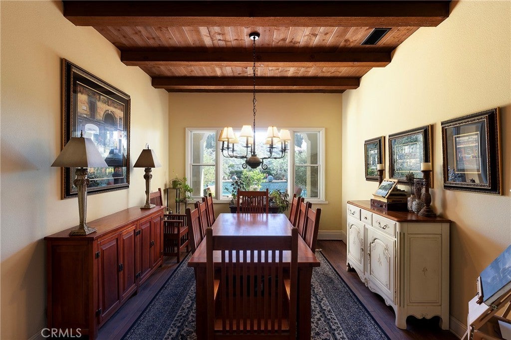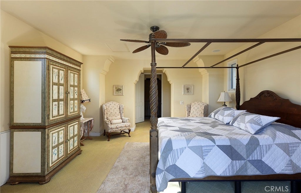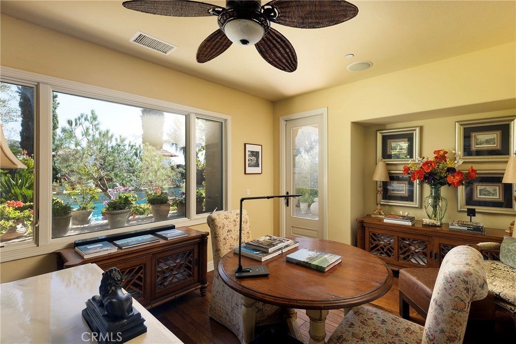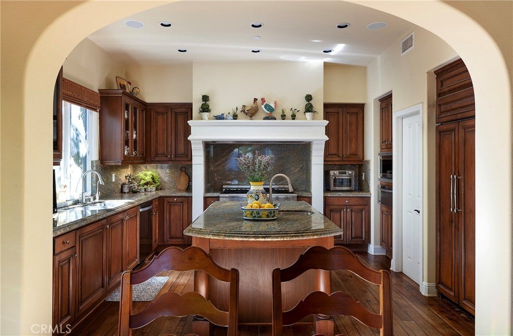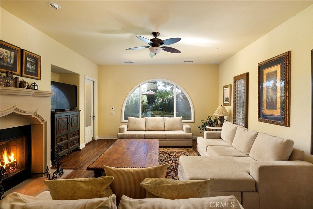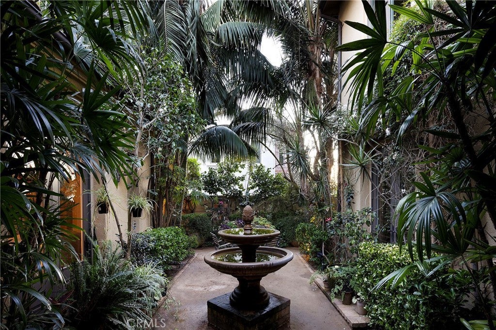 Set behind the gates of Careyes on one of its largest and most coveted 1/3-acre lots, this Italian Riviera–inspired estate unfolds like a private European retreat tucked quietly into the hills of San Clemente. From the moment you arrive, there is a shift. The architecture feels storied and intentional, rooted in another era. Soaring wood-beamed ceilings rise above Richard Marshall hardwood floors with intricate mosaic inlays, while wrought iron detailing, arched passages, and precast stone fireplaces create depth and romance throughout. The expansive floor plan offers six bedrooms, five full baths and two half baths, including two detached casitas. The downstairs casita is appointed with a high-end TV surround sound system, ideal for theater-style entertaining, while the upper casita offers its own private living space for guests or multigenerational flexibility. Formal and informal spaces flow into a gourmet kitchen with professional-grade appliances and granite countertops, allowing the home to live as beautifully as it entertains. Interior rooms and garden areas were pre-wired for high-end sound, creating a seamless indoor-outdoor experience. Upstairs, the primary suite serves as a private sanctuary, opening to a double-doored balcony with peek-a-boo ocean views beyond the rolling fairways of the Fred Couples–designed championship golf course and adjacent natural preserve. Yet it is the grounds that truly set this property apart. The backyard unfolds in terraces of aged brick, a rare architectural landscape that evokes the romance of the Italian coast. Imported Italian planters frame the estate, while mature landscaping forms a living wall of privacy, enclosing the property in quiet seclusion. Strategically placed water features provide a constant, soothing soundtrack as birds move through the trees throughout the day. At the heart of the garden, a resort-caliber pool shimmers with imported Walker Zanger Italian tile, paired with a heated spa that spills gently into the pool in a continuous cascade. Sunlight moves across brick and water as the day unfolds, creating an atmosphere that is immersive, transportive, and remarkably serene. Every pathway, hedge, and terrace has been considered with intention. The outdoor experience is not an accessory to the home. It is its soul.