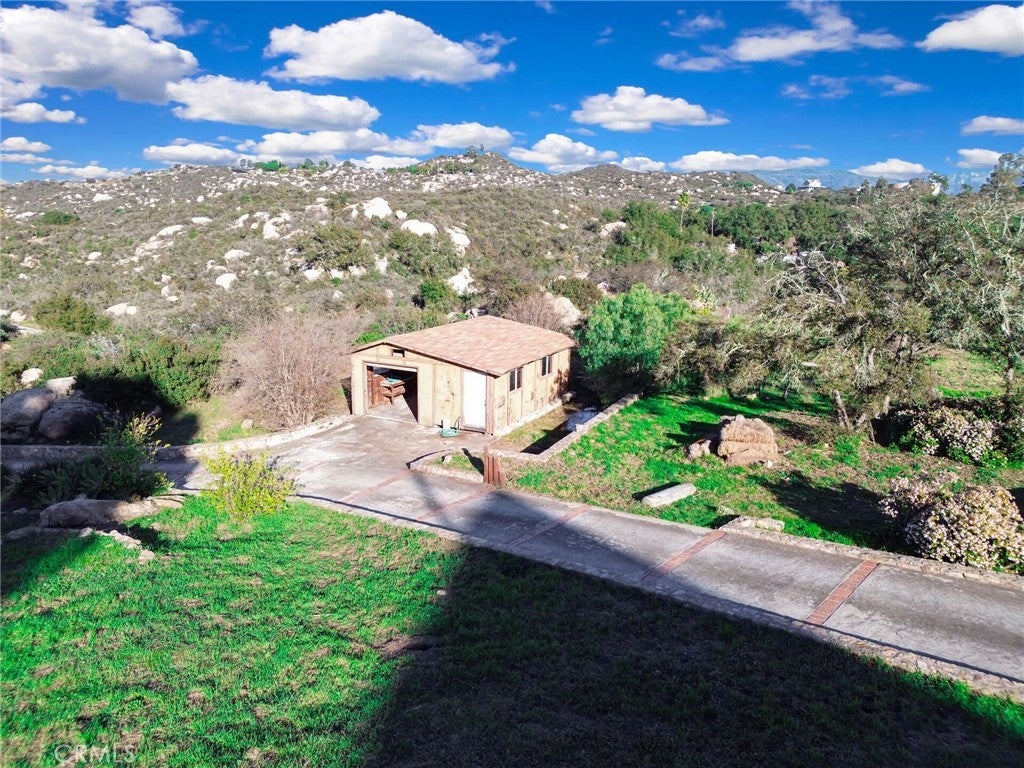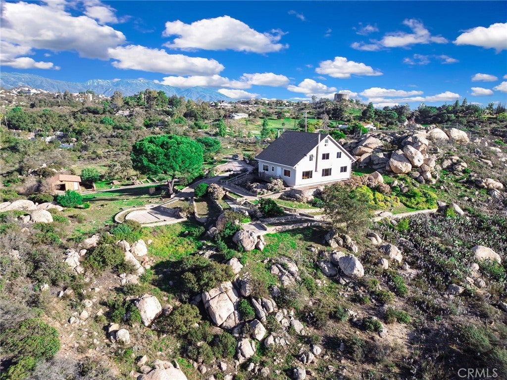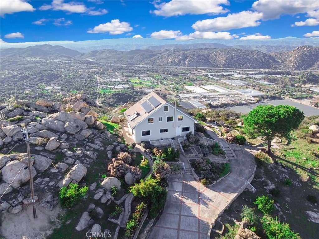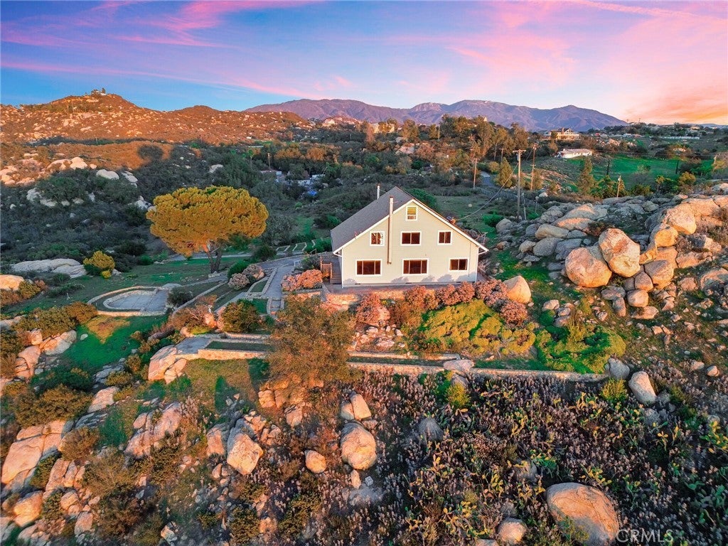 With an eagle-eye view across North San Diego County all the way out to Catalina Island and 360 degrees back along the ridgeline and mountain views, this home tops a prime 40+ acres. Whether the existing hilltop residence is maintained as an exclusive residence or the next owner takes advantage of the A70 zoning just south of Temecula’s wine country, the opportunities are almost as endless as the views. Imagine the events, whether intimate or grand, that could be hosted at each glorious sunset. Nestled at the end of a private road but with convenient access to the 15 freeway, you’ll feel instantly far away from it all while within minutes of all major amenities. Lovingly maintained, this home boasts all new dual pane windows, new carpet, and new paint - all without compromising its rustic charm and any further vision its new owner wants to bring forward. Downstairs features a large living room with large windows facing the panoramic vistas and sunset, two bedrooms, and a large hosting kitchen. Upstairs you'll find a bonus large family room, a dedicated workspace, and two generous bedrooms that each span the width of the home and in so doing offer two separate sides, one facing the panoramic/ocean view and one facing the mountains, so while linked, they can function as four upstairs bedrooms. And last but not least the attic is finished with carpeted stair access, beautiful shelving, and window ventilation. So many thoughtful details went into the customization of this home that will continue to serve it well, including solar on grid, a Solahart solar water heater, a roof pitch and direction designed to optimize insulation, and a raised foundation with a generous crawlspace. The land, which was maintained using organic farming techniques (no pesticide or compost contaminants), has boasted orchards and vineyards and sits ripe to bloom again, with numerous water lines to all cleared areas of the property. The soil is sandy loam in composition, drains well and is excellent for horticulture. Extensive terracing and stone masonry was cultivated over the years and affords thoughtful outdoor spaces and ample parking. A 24x24 shed below the house boasts a 7’ roll up door and a second 36” door to accommodate a tractor and other equipment. Unparalleled opportunity awaits - it's time to make your move.