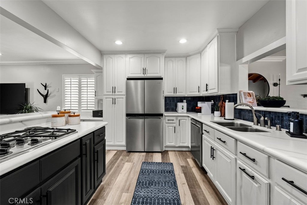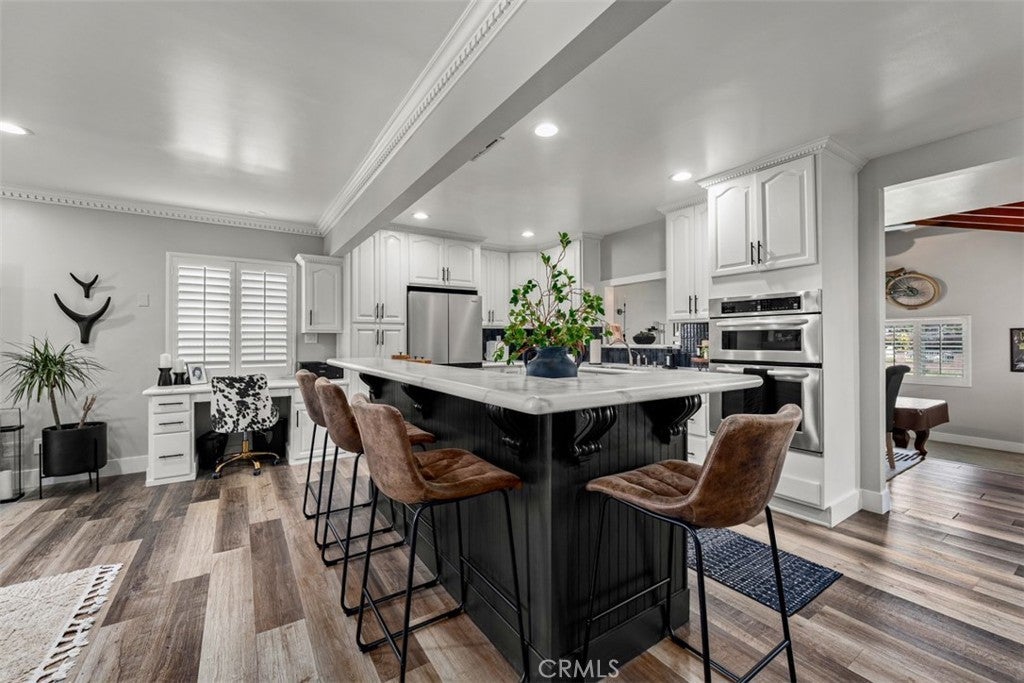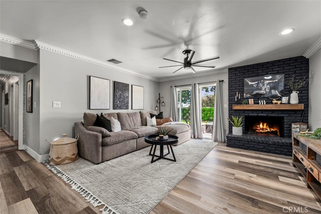 Remodeled four bedroom home in the heart of La Mirada. Beautifully updated four bedroom, two bathroom single-family home located in a desirable La Mirada neighborhood. This move-in-ready property features extensive interior upgrades and well-maintained outdoor living space. The home offers remodeled kitchen and bathrooms with modern finishes, crown molding throughout, and durable luxury vinyl plank (LVP) flooring. Dual-pane windows provide energy efficiency and natural light throughout the home. The spacious living area includes a gas fireplace, great room with vaulted ceilings and exposed wood beams creating a comfortable and inviting atmosphere. Additional features include a generous garage with pull-down attic access and expansive attic storage. The backyard is designed for both relaxation and functionality, featuring an electric-operated awning with wind sensor, beautiful landscaping, an above-ground mini pool, and a large storage shed offering substantial additional storage space. Conveniently located near shopping, dining, parks, and local schools, this property combines comfort, style, and practicality in a prime location.