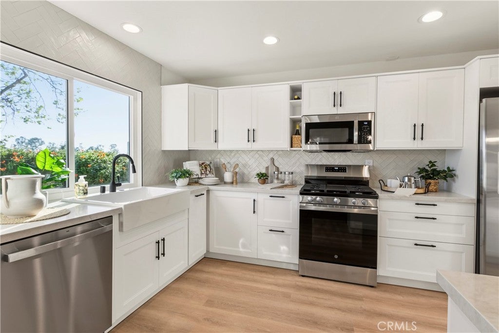 Fully renovated Maya floor plan located on a private corner lot in the guard-gated 55+ community of Casta Del Sol. This single-level home offers 2 bedrooms, 2 bathrooms, an office, and an inside laundry room with additional cabinetry. Recent upgrades include a large kitchen island, new cabinetry with black accents, SoliTaj MSI countertops, Zest Sand MSI tile backsplash, a Sinkology Josephine fireclay sink, and new GE stainless steel appliances including a microwave, counter-depth refrigerator, 5-burner gas range, and dishwasher. Additional improvements include LED recessed lighting throughout, new switches and plate covers, GFCI outlets, Dollie pendant lights, a rattan pendant chandelier, and Lifeproof Dusk Cherry waterproof luxury vinyl plank flooring with new baseboards. Both bathrooms have been fully renovated with tile showers, glass enclosures, new toilets, lighting, mirrors, fixtures, and new vanities. Bedrooms feature new mirrored closet doors and 48" Nicola ceiling fans with remotes. The enclosed laundry area offers added cabinetry and new skylights, and the office includes two doors for privacy and its own skylight. The living room features a gas fireplace with new tile surround and a Midwood hand-carved mantel. Additional upgrades include new windows, new doors and hardware. Exterior improvements include new Barrette Outdoor Living Anderson white lattice-top vinyl fencing and gate, new backyard decking, updated landscaping, a Citlali dusk-to-dawn exterior wall light, a Ring wired video doorbell, and a Genie universal garage remote and a modern floating address plaque. The AC unit was installed approximately 2 years ago. Community amenities include two pools and spas, a fitness center, tennis and pickleball courts, shuffleboard, bocce ball, lawn bowling, billiards, a putting green, walking trails, a vegetable garden, Heritage Gardens, and a variety of social activities. Nearby Oso Creek Trail and Lake Mission Viejo membership provide additional recreational opportunities, with close proximity to shopping, dining, Oso Creek Golf Course, and freeway access.