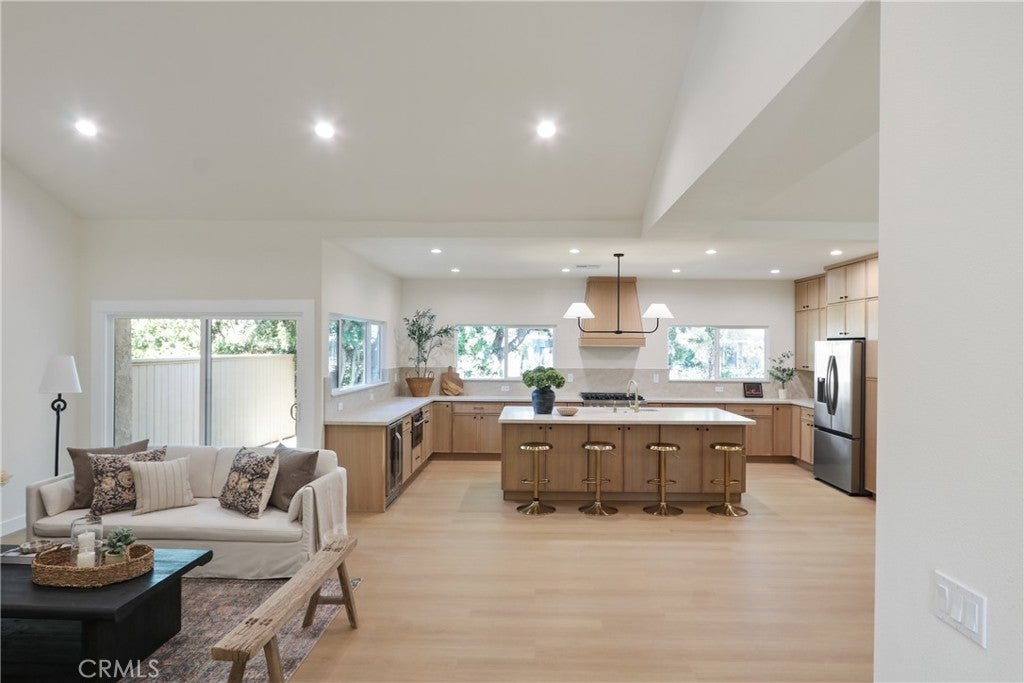 Step into this stunningly reimagined single-level home located on a quiet cul-de-sac within the gated community of Broadmoor in Orange. Just five homes away from the community’s private equestrian facility and barn, this property blends modern design with the unique lifestyle Broadmoor is known for. From the moment you arrive, a spacious private courtyard creates a warm and inviting entrance. Inside, the home has been completely redesigned with an open-concept floor plan and soaring vaulted ceilings, while the kitchen ceilings have been raised to 9 feet—creating a bright, airy space that feels like a brand-new model home. The fully remodeled interior showcases luxury vinyl plank flooring, white oak shaker cabinetry, designer hardware, and Taj Mahal quartz countertops with a full-height backsplash. The kitchen is equipped with high-end Zline stainless steel appliances and upgraded lighting that complements the home’s clean, modern aesthetic. Major system upgrades include a brand-new HVAC system, new ductwork, new PEX plumbing, new insulation and new dual-pane windows and sliding patio doors, ensuring both comfort and energy efficiency throughout the home. Outside, the home offers beautiful indoor-outdoor flow with ample space to relax and entertain. Residents of Broadmoor enjoy exclusive community amenities including a pool, tennis and pickleball courts, and a private equestrian facility, all within a secure gated setting. This rare opportunity combines modern luxury, thoughtful upgrades, and a truly special community lifestyle in one of Orange’s most desirable neighborhoods.