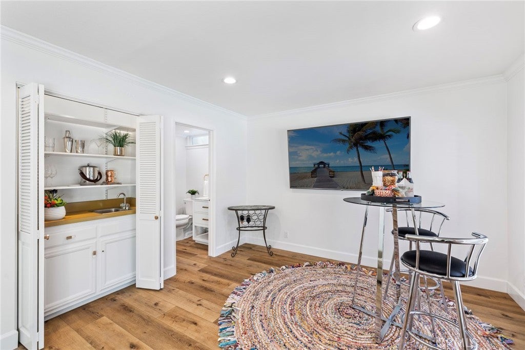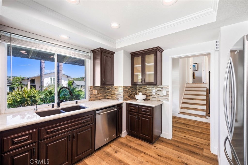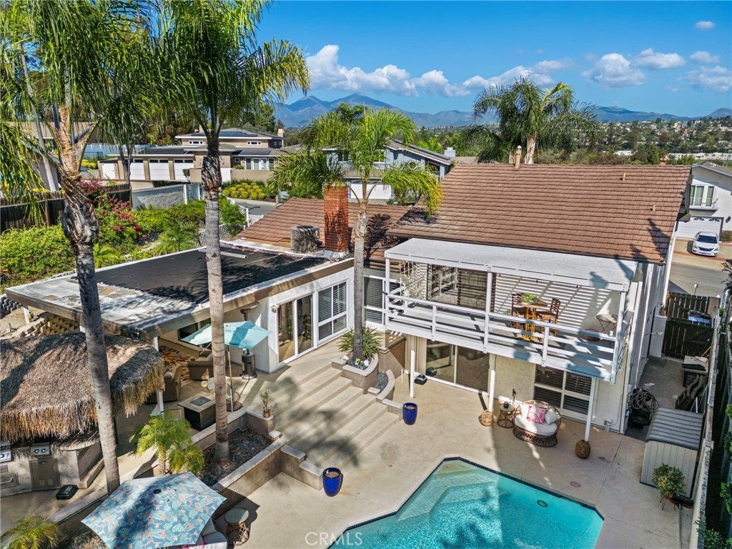 Nestled on a large lot in one of Mission Viejo's most desirable neighborhoods, this beautifully appointed 4-bedroom, 3-bath home offers a lifestyle that is hard to find and even harder to leave. From the moment you arrive, the soaring vaulted ceilings with exposed wood beams make a dramatic architectural statement that sets this home apart from anything else in the area. The sun-filled living room anchors the main level with a cozy gas fireplace, creating the kind of warm, inviting space that makes every day feel like a retreat. Throughout the entire home, luxury vinyl plank flooring and custom window coverings deliver a polished, cohesive look that feels both elevated and move-in ready. Every bathroom has been thoughtfully updated with modern finishes, and the primary bedroom features custom built-in closets designed to maximize both function and style. Upstairs, the bedrooms offer sweeping panoramic views that greet you each morning and invite you to unwind each evening. These are the kinds of views that remind you exactly why you chose Mission Viejo. Step outside and discover your own private multilevel backyard oasis, a designer outdoor living space crafted for both grand entertaining and quiet everyday enjoyment. The large sparkling pool serves as the centerpiece, surrounded by beautifully layered outdoor spaces, a built-in BBQ, and lush landscaping that provides both beauty and privacy. Tucked just off the pool is one of the home's most versatile features, a ground-level ensuite bedroom complete with a wet bar that opens directly to the outdoor living area. Whether you envision it as a private guest retreat, an in-law suite, or a game room, the flexibility this space offers is a rare find in this market. No HOA. No Mello-Roos. Optional Lake Mission Viejo membership available. Zoned for top-rated Saddleback Valley Unified schools including Mission Viejo High School, La Paz Intermediate, and Linda Vista IB Magnet Elementary.