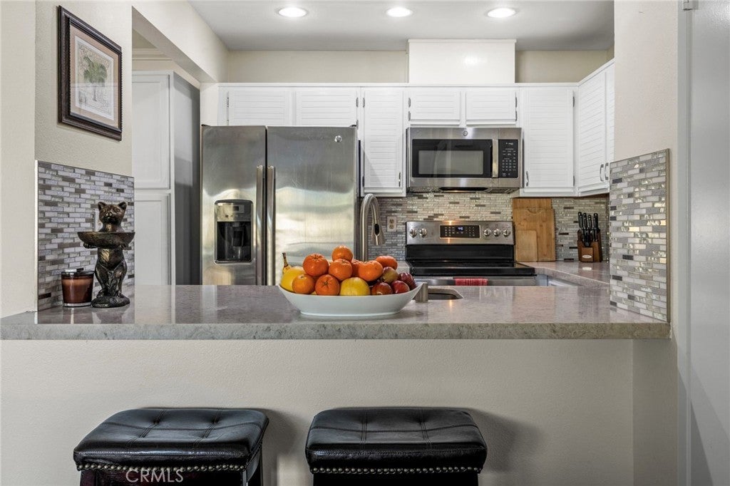 Welcome home to this adorable end-unit highly upgraded condo featuring sun-drenched rooms, added privacy, and a highly convenient location near the entrance to the Community. The spacious main living level, just one flight up, offers two bedrooms, both with upgraded bathrooms, along with a bright and inviting living room complete with a cozy fireplace. Step outside to your private balcony, perfect for enjoying fresh air and outdoor relaxation. The dining area sits adjacent to the redesigned kitchen, which features stainless steel appliances, Quartz countertops, gorgeous backsplash tiles, abundant cabinetry, and generous storage options. Upstairs, the versatile loft provides flexible living space that can easily function as a third bedroom, guest room, or a comfortable home office. It also opens to an amazing second private deck with privacy walls—ideal for pets, sunbathing, or creating your own outdoor oasis. There are ceiling fans in all rooms for maximum air flow, and the HVAC unit is only two years old. An oversized two-car garage is just steps away, adding convenience to this quiet and desirable setting. The HOA includes water and trash, and residents enjoy wonderful community amenities including multiple pools and beautifully maintained grounds. Located near Irvine Spectrum, scenic walking and hiking trails, and just minutes from many of Orange County’s beautiful beaches, this home also offers quick freeway access, making it easy to reach destinations throughout Orange County.