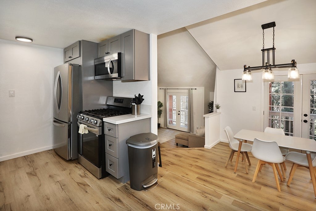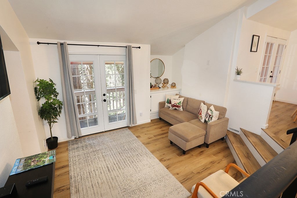 Beautifully Remodeled 4-Bedroom, 2.5-Bathroom Mountain Retreat. Nestled in the charming Arrowhead Villas area, this stunning remodeled home offers the perfect mountain escape. The main floor boasts a spacious kitchen and dining area with durable vinyl flooring, a convenient guest half-bath, and a cozy step-down living room featuring an electric fireplace and balconies with serene woodland views. One bedroom on this level opens to a front deck through elegant French doors. The second level includes a guest bedroom and a full bath, while the third level features the master suite, a laundry room, and a third guest bedroom with its own deck and breathtaking views of the woods. The front deck also provides parking for two cars. Located just minutes from Arrowhead Village, this property offers convenience and tranquility. Please note that it does not include lake rights. The quarterly $245 HOA fee, paid to Arrowhead Villas Mutual Company, covers road maintenance, snowplowing, trash service, and up to 200 gallons of water per day. Fully furnished and move-in ready, this home is a rare opportunity to own a slice of mountain paradise. Schedule your showing today and start enjoying the beauty of Lake Arrowhead!