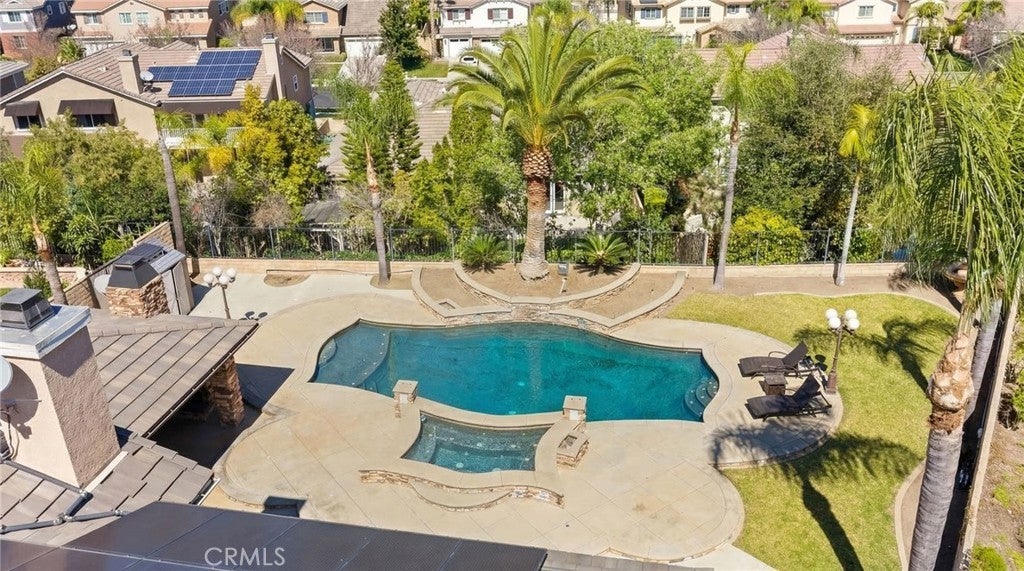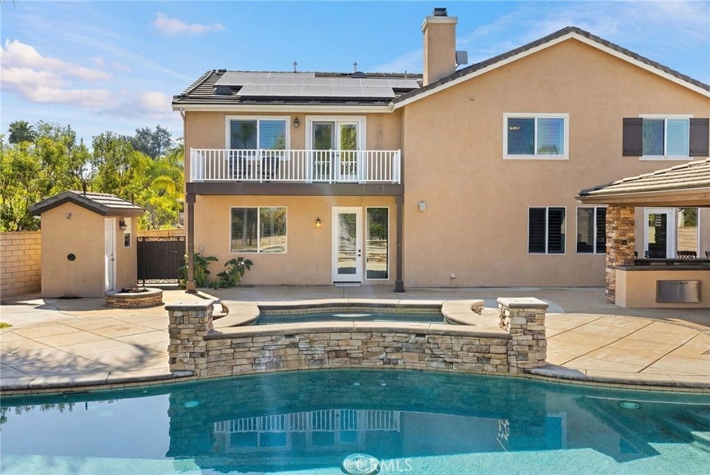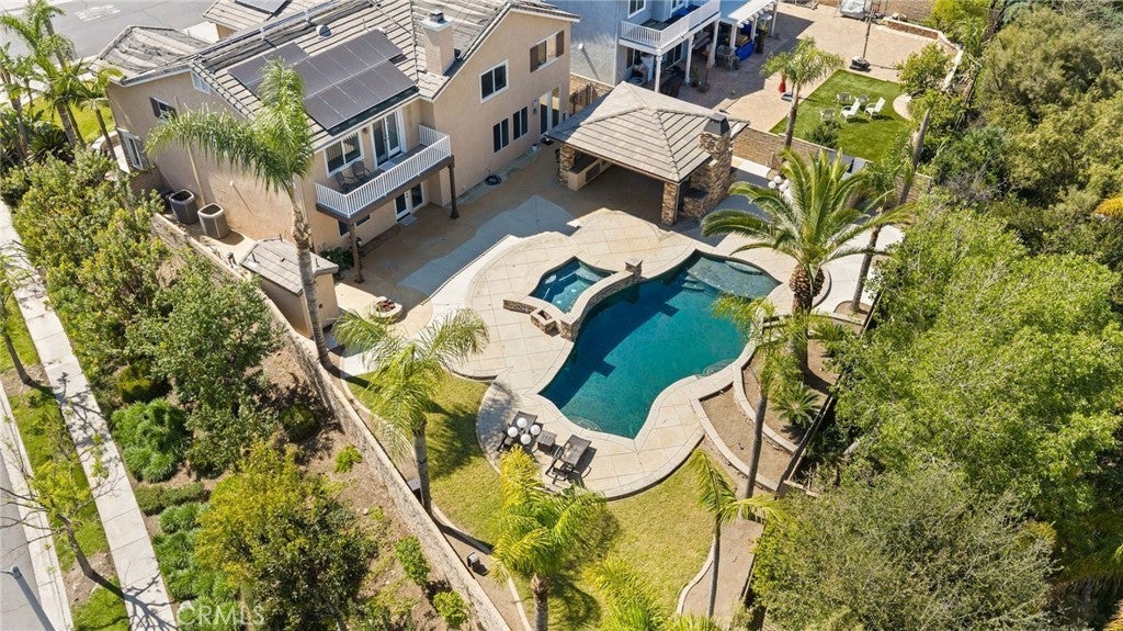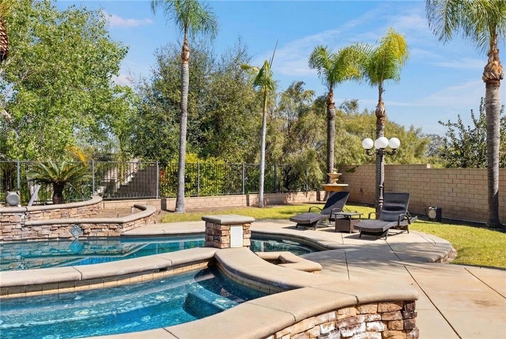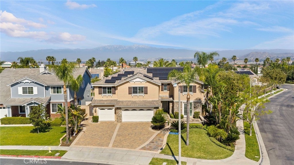 Located within the gated Fieldstone community, this expansive residence offers over 4,000 square feet of thoughtfully designed living space with 6 bedrooms and 6 bathrooms, combining refined interiors with resort-inspired outdoor amenities. Positioned on an elevated corner lot, the home enjoys added privacy along with beautiful mountain views on clear days. Designed for both everyday comfort and elevated entertaining, this home creates a seamless connection between indoor living and the outdoor entertaining spaces. The backyard is a true highlight of the property, designed as a private retreat for hosting and relaxation. A sparkling solar-heated pool anchors the space, complemented by a fully equipped outdoor cabana-style kitchen with built-in BBQ, bar seating, fire pit, and outdoor fireplace. No less than 16 palm trees surround the property, with a magnificent Sago as its centerpiece, creating resort-like vibes all year round. An outdoor bathroom adds convenience for guests enjoying the pool and entertaining areas. The flexible floor plan includes a private downstairs suite with its own entrance and patio, offering an ideal setup for extended family, guests, or a private office retreat. The first floor great room combines a fully equiped kitchen with a large living and dining space, with easy access to your incredible yard. Upstairs, the primary suite serves as a spacious sanctuary with an adjoining private balcony, featuring a large en-suite bath with a walk-in shower, soaking tub, and walk-in closet. Additional features include PAID-OFF SOLAR PANELS, upstairs laundry, a three-car garage, dual condenser units, and a tankless water heater, providing both efficiency and modern convenience. Combining generous living spaces, thoughtful upgrades, and exceptional outdoor amenities, this home offers a rare opportunity to enjoy privacy, comfort, and resort-style living within one of the area’s most desirable gated neighborhoods.