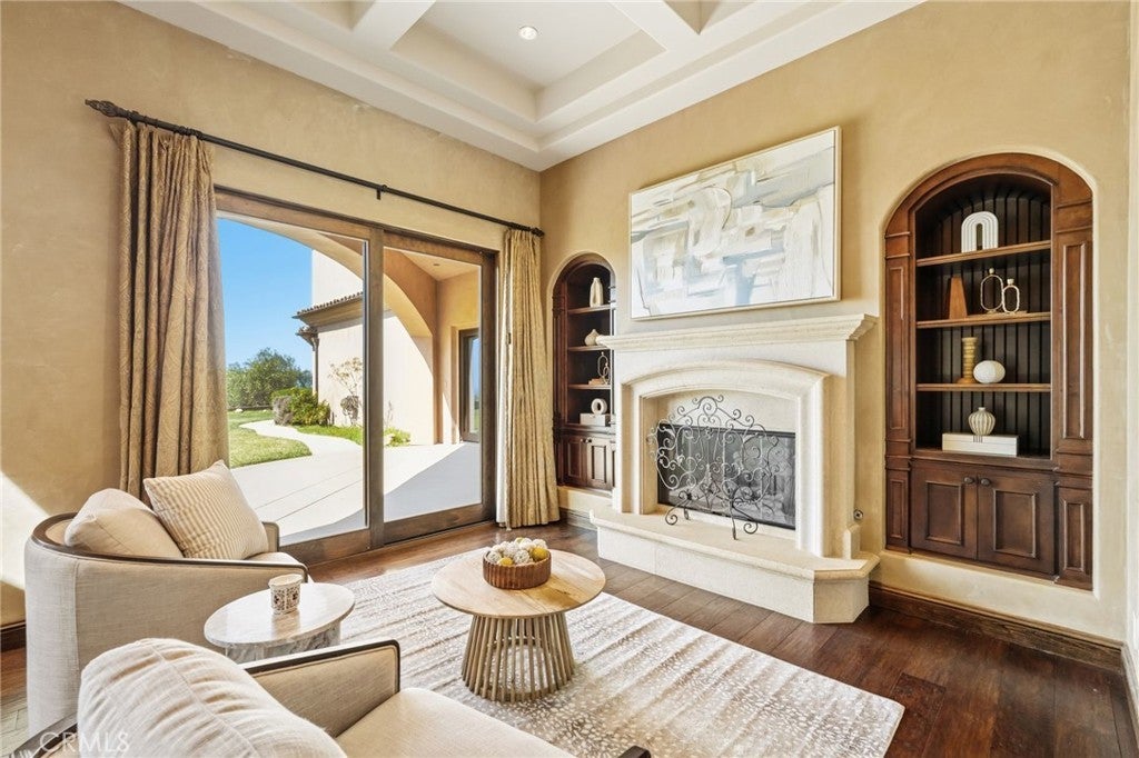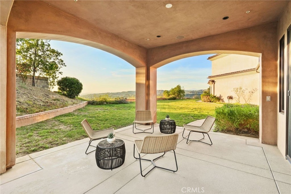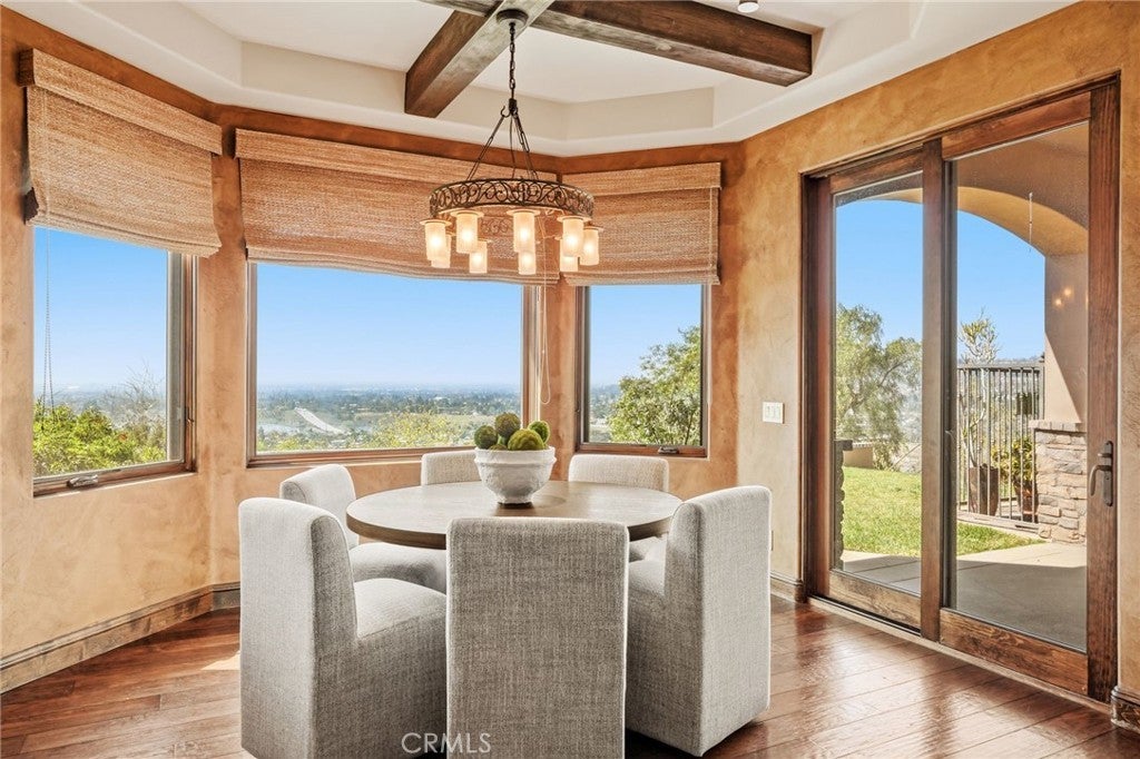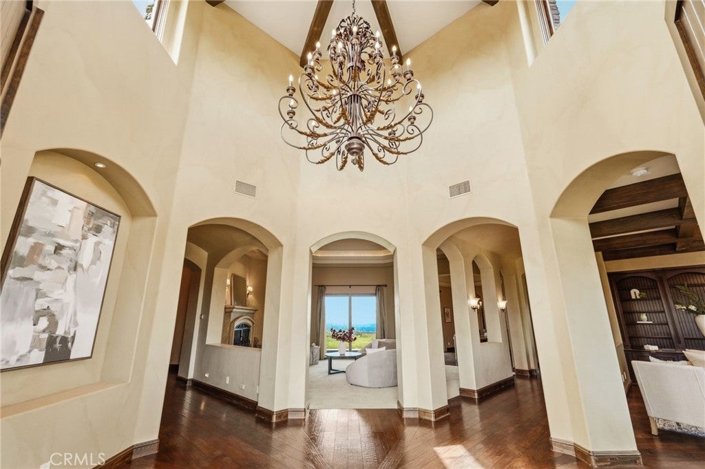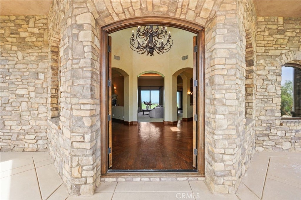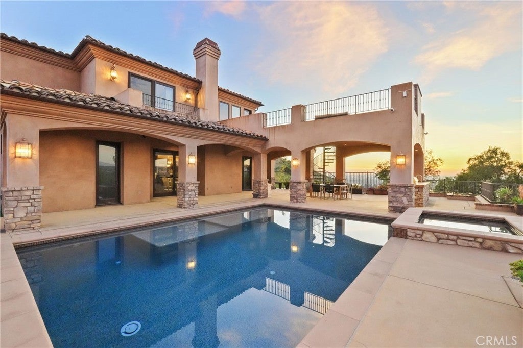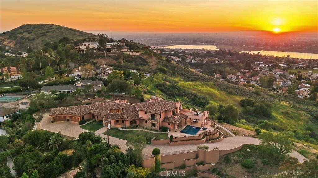 Set behind private gates on a secluded one-acre lot, this exceptional custom estate offers breathtaking 270-degree city light and sunset views with unmatched privacy. The double-door entry opens to a soaring 21-foot foyer, leading to elegant living spaces with 14-foot custom lighted ceilings designed to showcase the spectacular vistas. The chef’s kitchen features a large center island, granite countertops, premium appliances, and butler’s pantry, flowing seamlessly into the breakfast area and inviting family room—perfect for effortless entertaining. The main-level primary suite is a private retreat with dual custom walk-in closets, dual walk-in showers, separate vanity areas, and a soaking tub with beautiful tilework. Two additional en-suite bedrooms are located on the first floor, along with a private office featuring custom built-ins and large windows overlooking the scenic views of Orange Park Acres. Upstairs offers two additional en-suite bedrooms, a second laundry room, and a spacious bonus room with game table niche, large wet bar, and rooftop deck capturing sweeping views. A state-of-the-art home theater with leather seating, floated walls, enclosed equipment, large screen, and immersive sound system completes the home’s impressive entertainment offerings. Resort-style grounds feature a pool, spa, built-in BBQ, and expansive seating areas—all perfectly positioned to take in the panoramic views.
