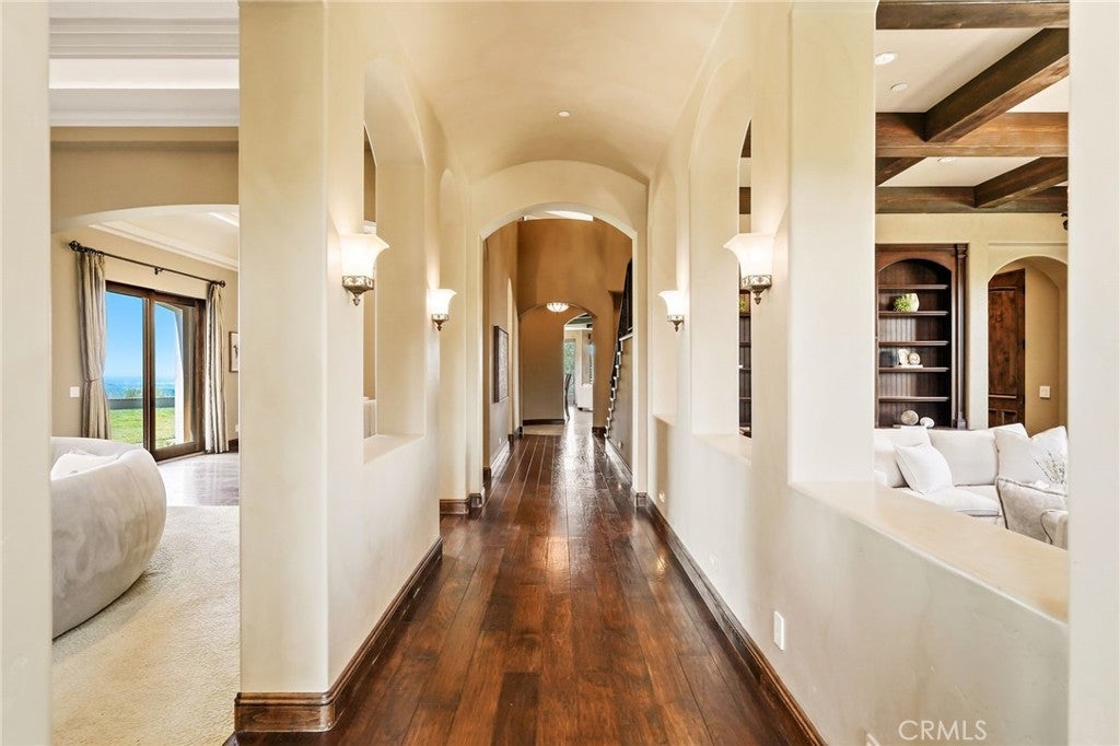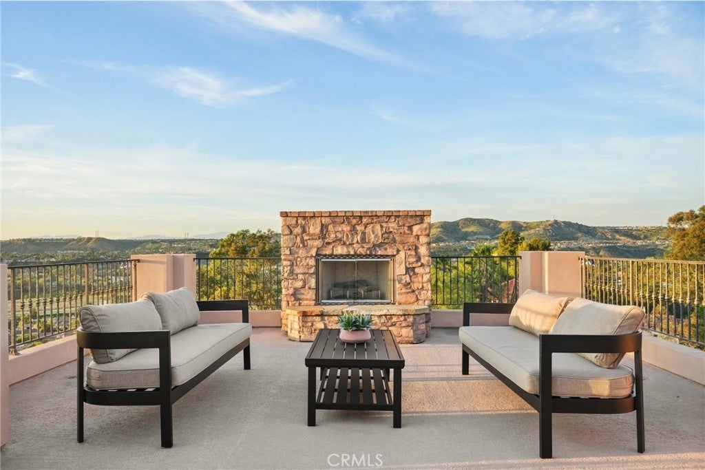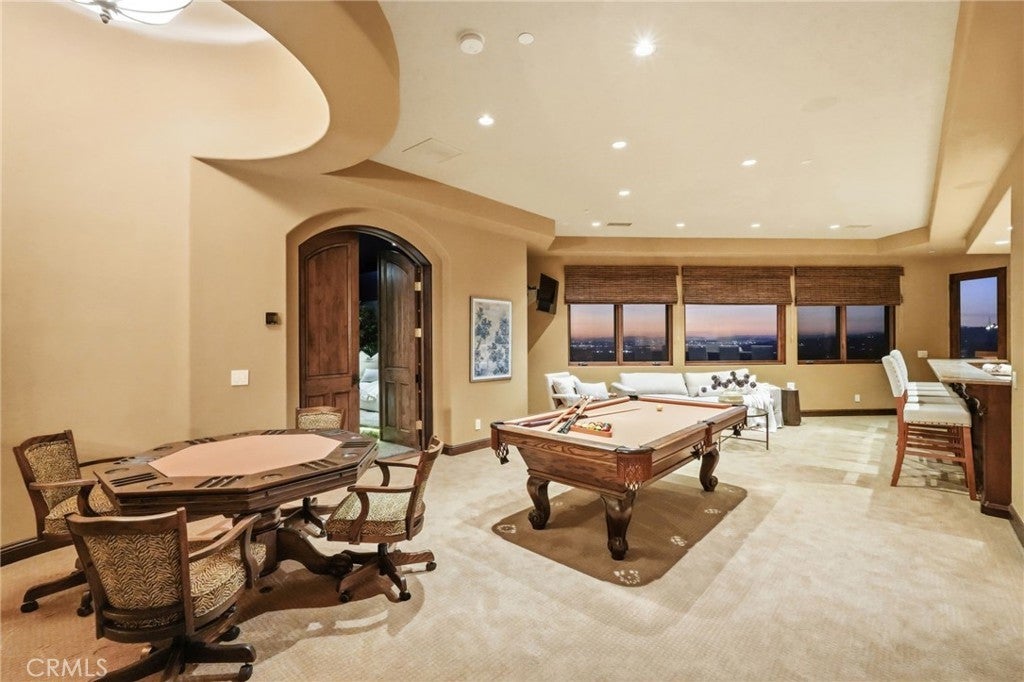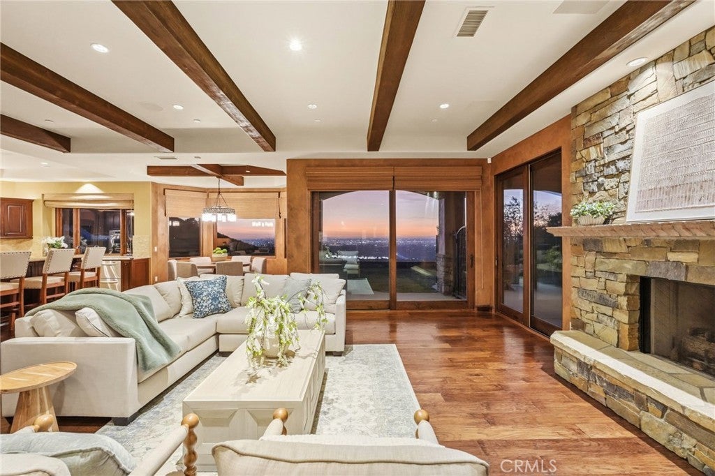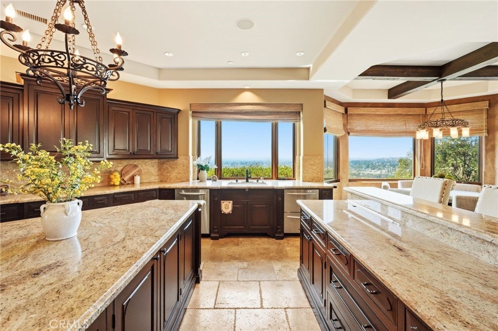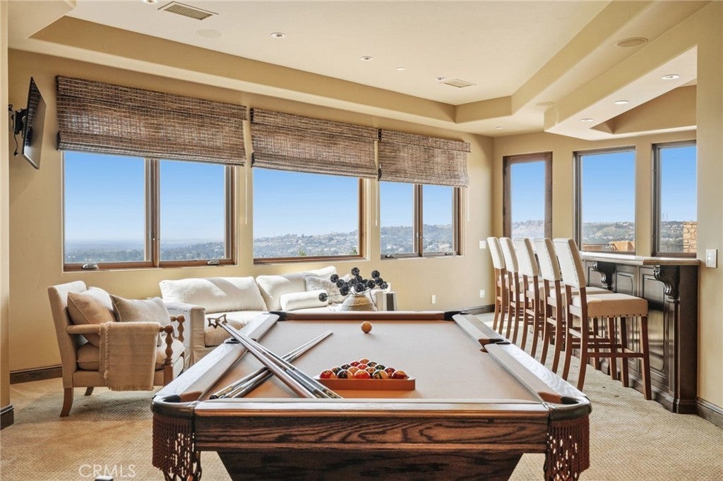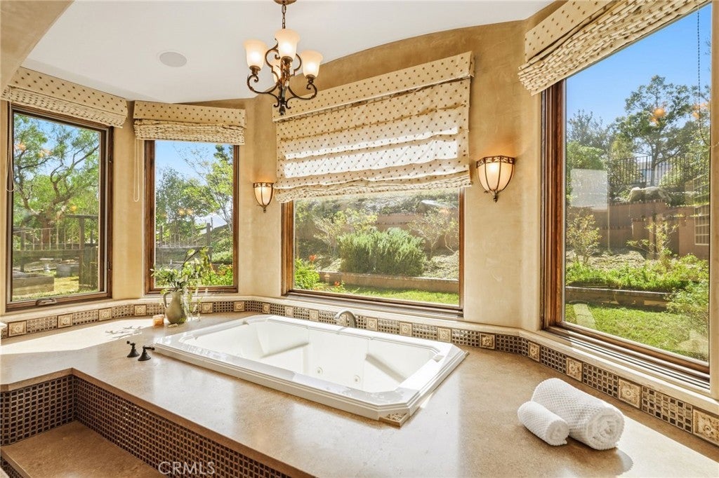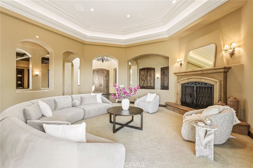 Set behind private gates on a secluded one-acre lot, this exceptional custom estate offers breathtaking 270-degree city light and sunset views with unmatched privacy. The double-door entry opens to a soaring 21-foot foyer, leading to elegant living spaces with 14-foot custom lighted ceilings designed to showcase the spectacular vistas. The chef’s kitchen features a large center island, granite countertops, premium appliances, and butler’s pantry, flowing seamlessly into the breakfast area and inviting family room—perfect for effortless entertaining. The main-level primary suite is a private retreat with dual custom walk-in closets, dual walk-in showers, separate vanity areas, and a soaking tub with beautiful tilework. Two additional en-suite bedrooms are located on the first floor, along with a private office featuring custom built-ins and large windows overlooking the scenic views of Orange Park Acres. Upstairs offers two additional en-suite bedrooms, a second laundry room, and a spacious bonus room with game table niche, large wet bar, and rooftop deck capturing sweeping views. A state-of-the-art home theater with leather seating, floated walls, enclosed equipment, large screen, and immersive sound system completes the home’s impressive entertainment offerings. Resort-style grounds feature a pool, spa, built-in BBQ, and expansive seating areas—all perfectly positioned to take in the panoramic views.