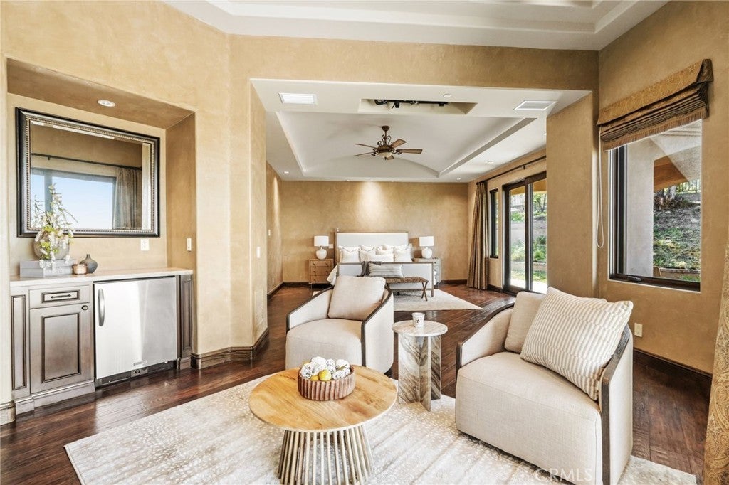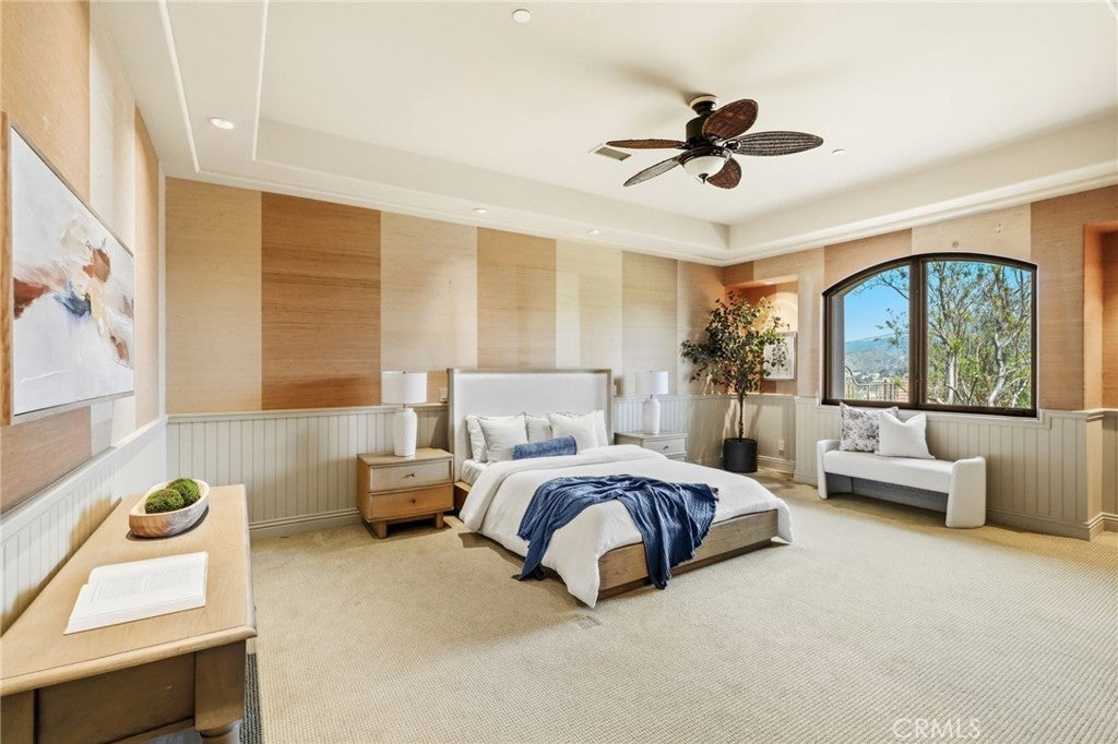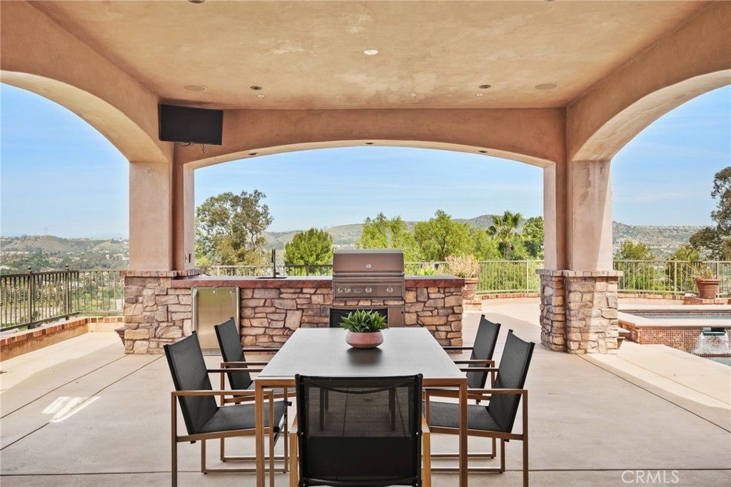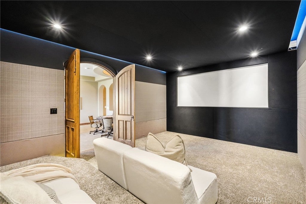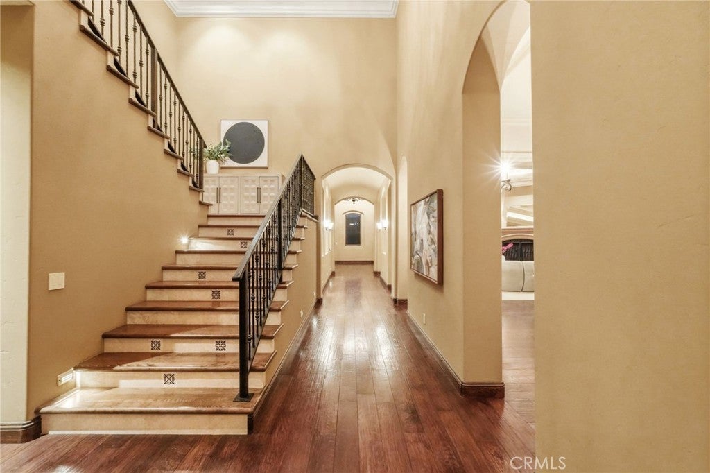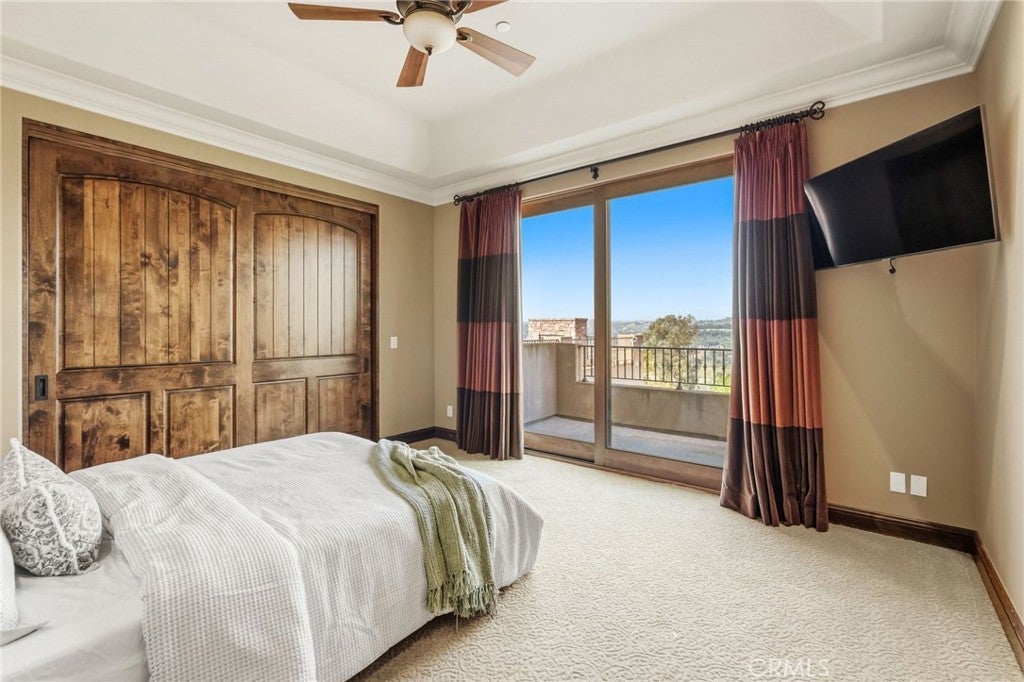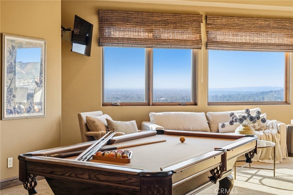 Set behind private gates on a secluded one-acre lot, this exceptional custom estate offers breathtaking 270-degree city light and sunset views with unmatched privacy. The double-door entry opens to a soaring 21-foot foyer, leading to elegant living spaces with 14-foot custom lighted ceilings designed to showcase the spectacular vistas. The chef’s kitchen features a large center island, granite countertops, premium appliances, and butler’s pantry, flowing seamlessly into the breakfast area and inviting family room—perfect for effortless entertaining. The main-level primary suite is a private retreat with dual custom walk-in closets, dual walk-in showers, separate vanity areas, and a soaking tub with beautiful tilework. Two additional en-suite bedrooms are located on the first floor, along with a private office featuring custom built-ins and large windows overlooking the scenic views of Orange Park Acres. Upstairs offers two additional en-suite bedrooms, a second laundry room, and a spacious bonus room with game table niche, large wet bar, and rooftop deck capturing sweeping views. A state-of-the-art home theater with leather seating, floated walls, enclosed equipment, large screen, and immersive sound system completes the home’s impressive entertainment offerings. Resort-style grounds feature a pool, spa, built-in BBQ, and expansive seating areas—all perfectly positioned to take in the panoramic views.