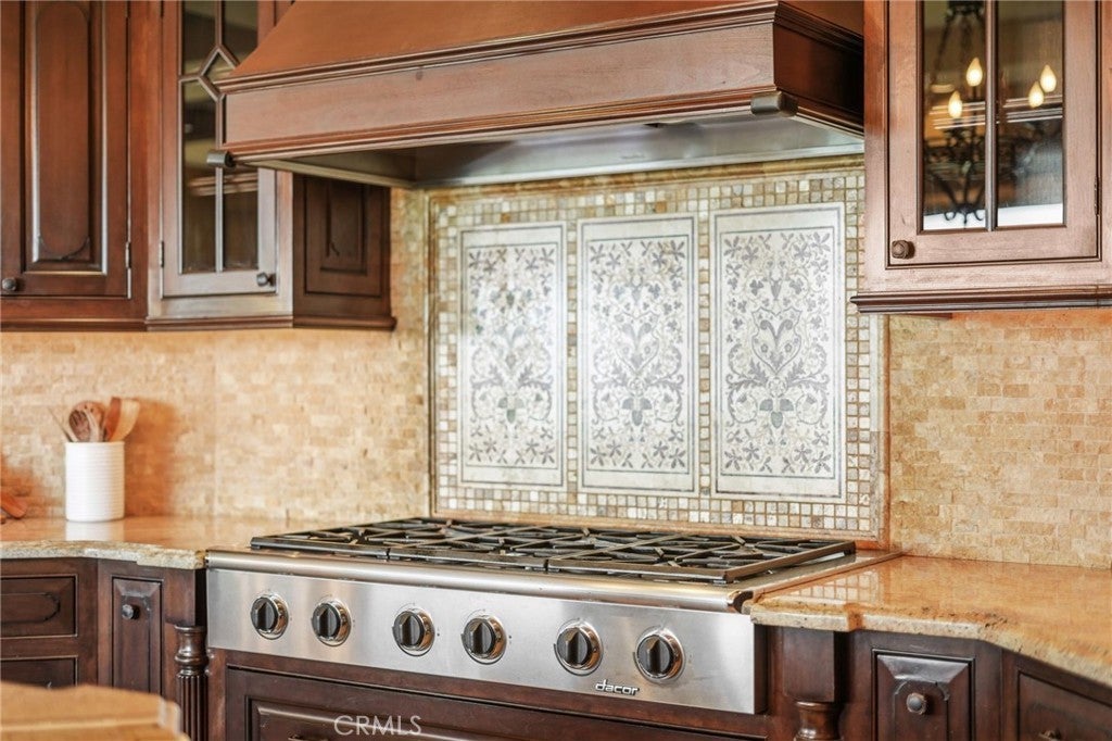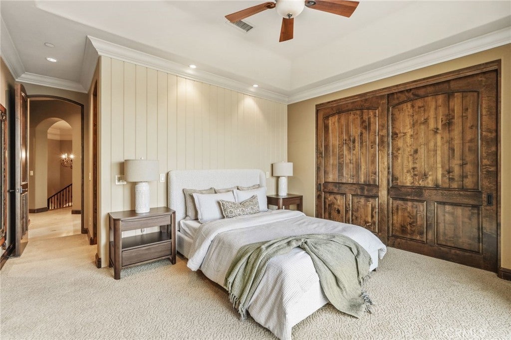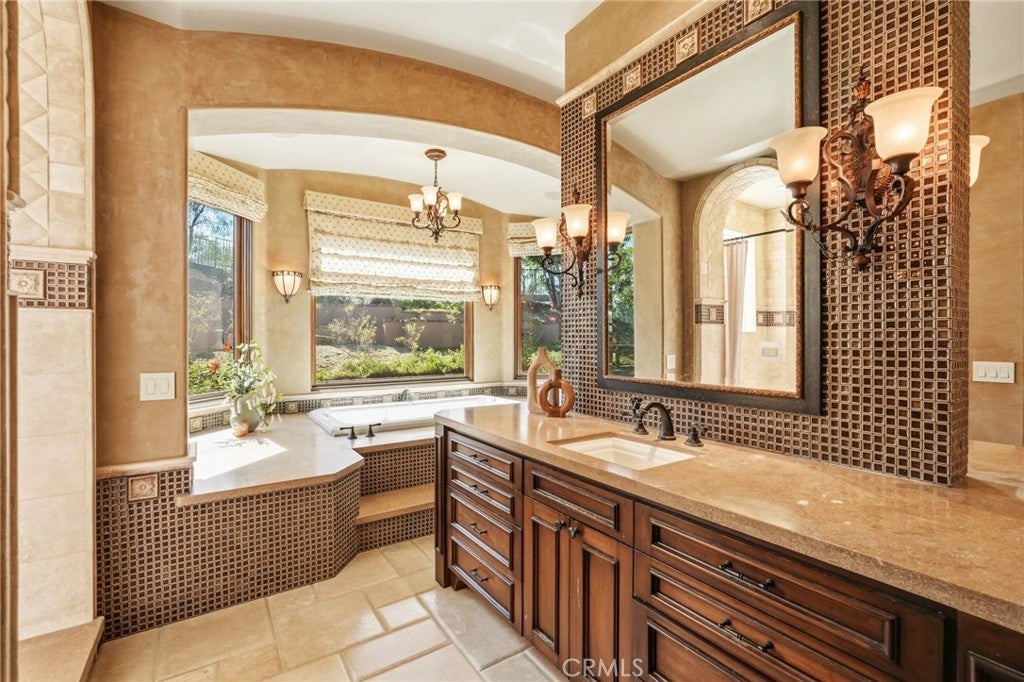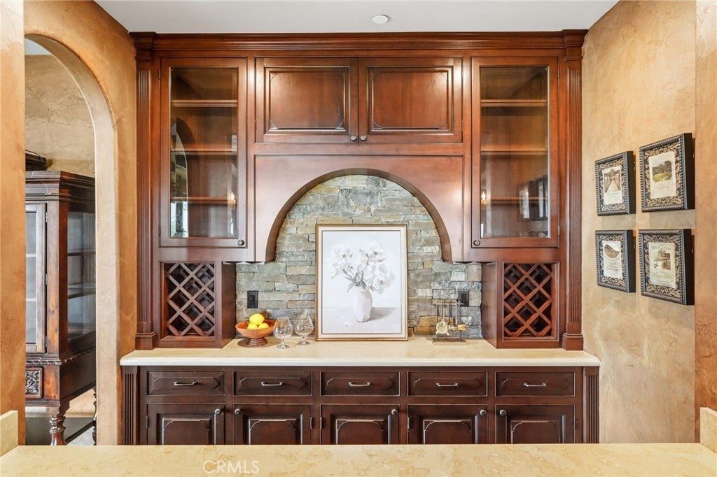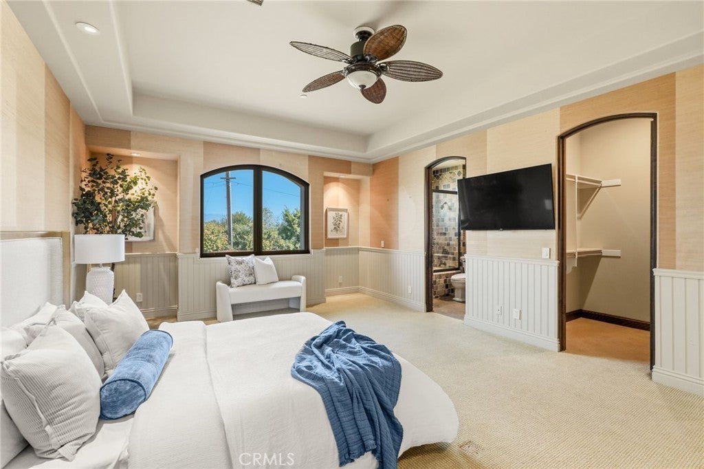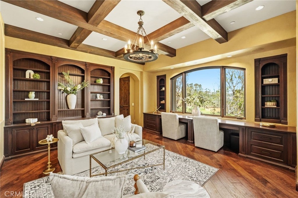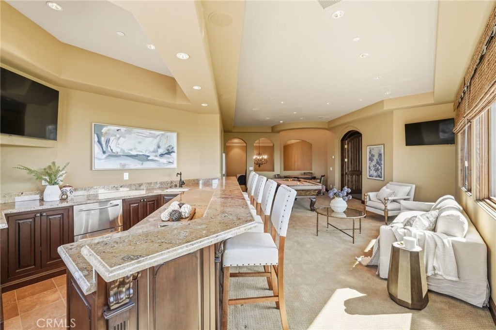 Set behind private gates on a secluded one-acre lot, this exceptional custom estate offers breathtaking 270-degree city light and sunset views with unmatched privacy. The double-door entry opens to a soaring 21-foot foyer, leading to elegant living spaces with 14-foot custom lighted ceilings designed to showcase the spectacular vistas. The chef’s kitchen features a large center island, granite countertops, premium appliances, and butler’s pantry, flowing seamlessly into the breakfast area and inviting family room—perfect for effortless entertaining. The main-level primary suite is a private retreat with dual custom walk-in closets, dual walk-in showers, separate vanity areas, and a soaking tub with beautiful tilework. Two additional en-suite bedrooms are located on the first floor, along with a private office featuring custom built-ins and large windows overlooking the scenic views of Orange Park Acres. Upstairs offers two additional en-suite bedrooms, a second laundry room, and a spacious bonus room with game table niche, large wet bar, and rooftop deck capturing sweeping views. A state-of-the-art home theater with leather seating, floated walls, enclosed equipment, large screen, and immersive sound system completes the home’s impressive entertainment offerings. Resort-style grounds feature a pool, spa, built-in BBQ, and expansive seating areas—all perfectly positioned to take in the panoramic views.