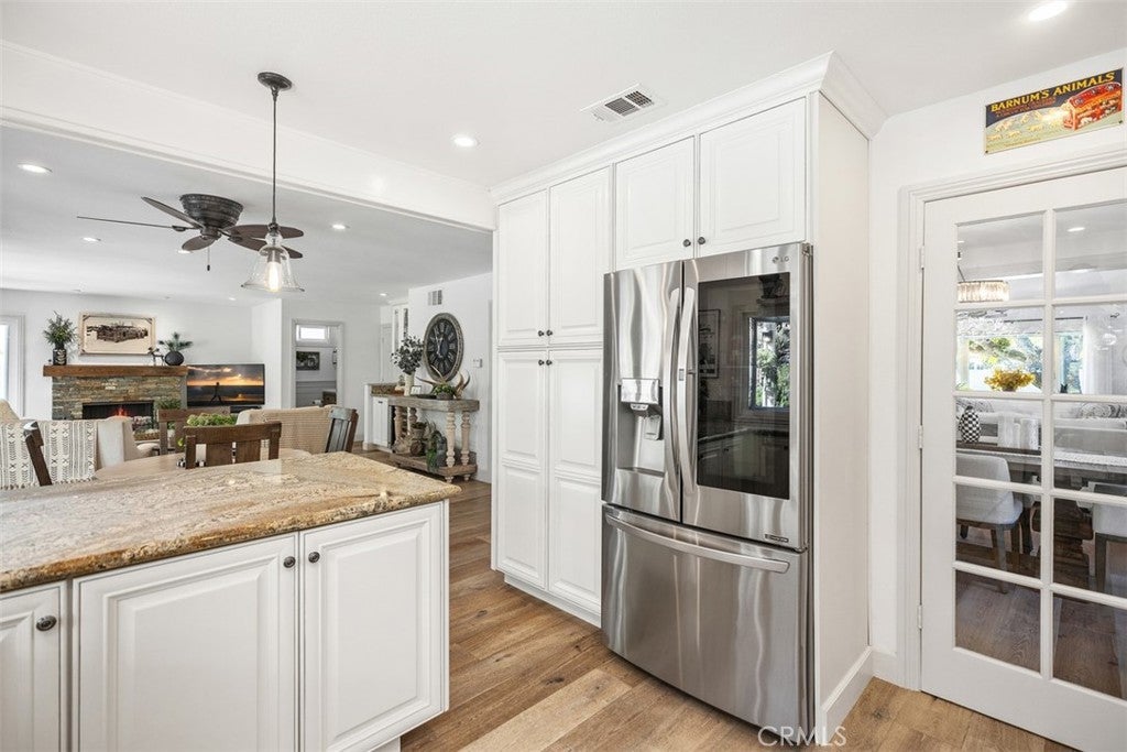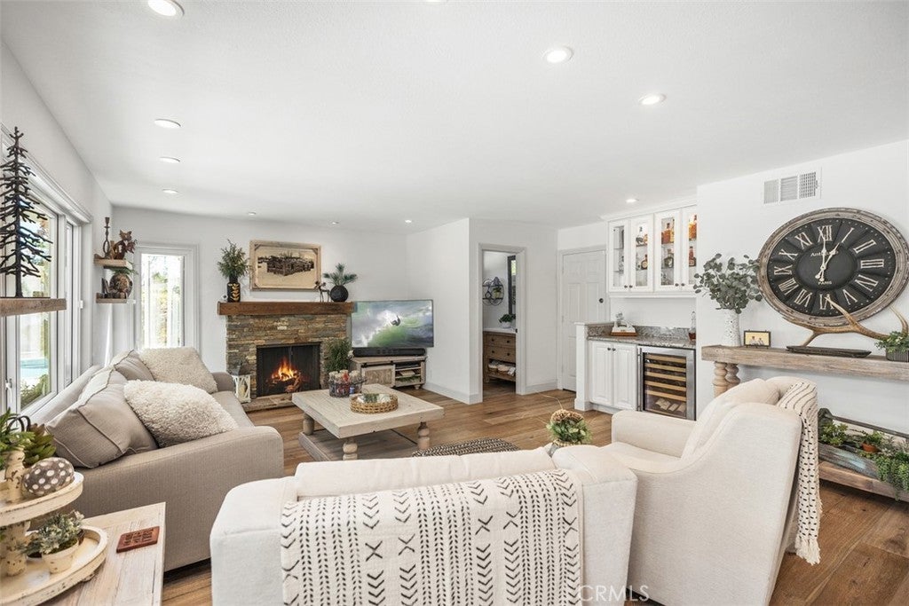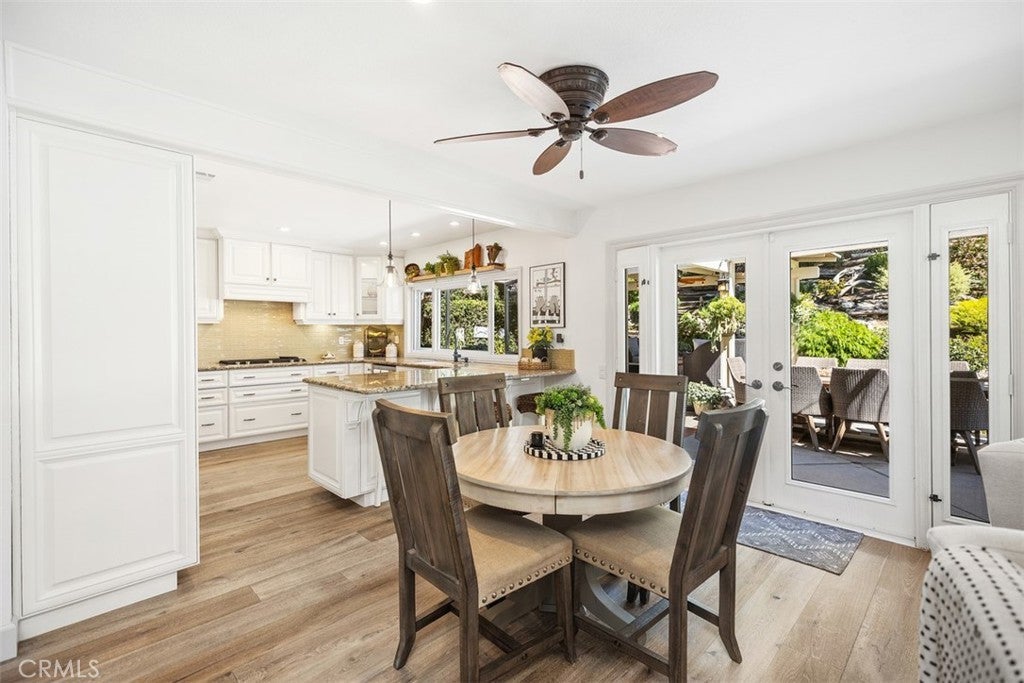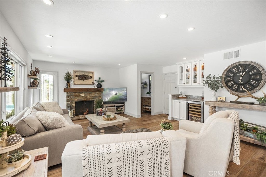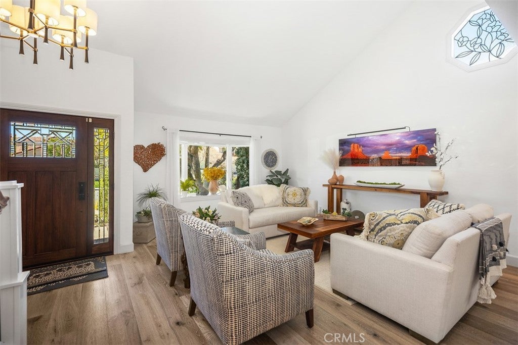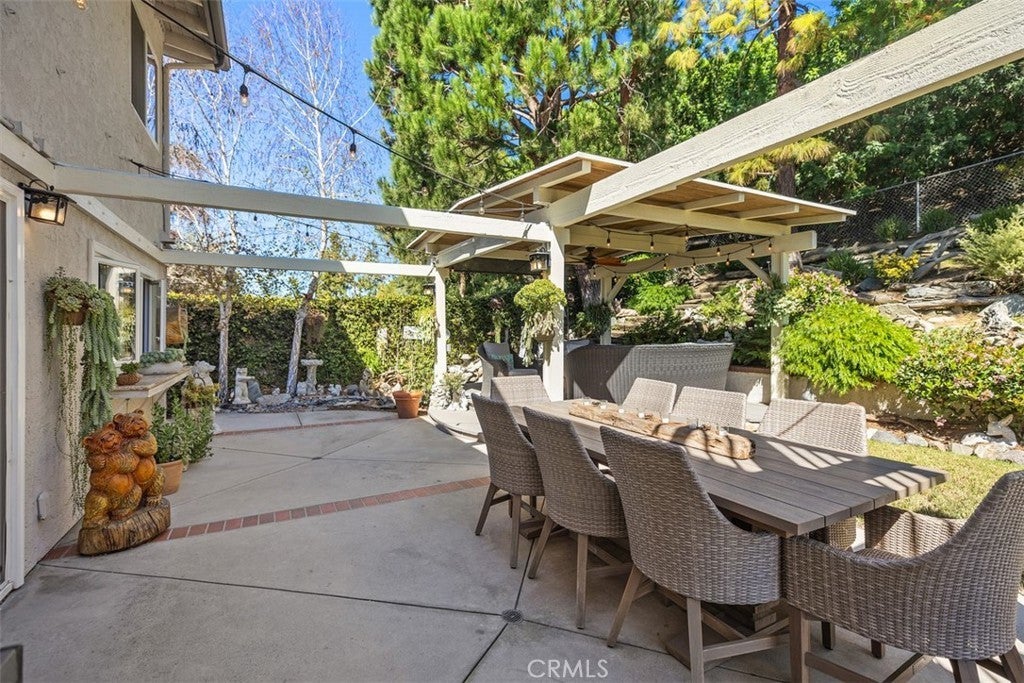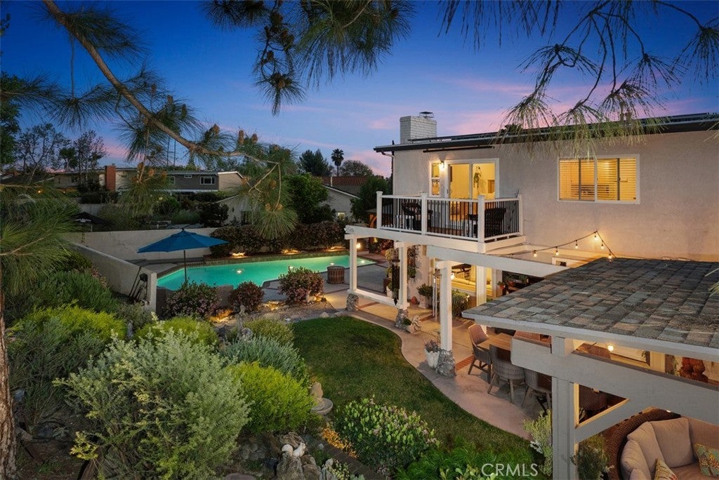 Welcome to this beautifully upgraded and impeccably maintained Casa Sandia model nestled in the desirable Madrid South community of Mission Viejo. This light filled home welcomes you with soaring vaulted ceilings, a neutral color palette, and an abundance of windows that bring in natural light throughout the living spaces. The inviting living room opens to a formal dining room featuring a built-in buffet and French doors that lead to the side yard, perfect for indoor-outdoor entertaining. Wide plank wood flooring runs throughout the home, and the staircase is enhanced with classic wainscoting and a custom stair railing. The kitchen and family room create the open concept great room everyone is looking for. A wall of windows and doors across the back of the home fills the space with natural light and offers beautiful views of the backyard. The kitchen features custom cabinetry with pull-out shelves, pots and pans drawers beneath the built-in 5-burner gas range and hood, microwave & convection oven, recessed lighting, and casement windows with retractable screens. The family room offers a cozy fireplace and a stylish built-in dry bar with wine fridge and glass upper cabinets. A convenient powder room completes the main level. Upstairs, the spacious primary suite is a true retreat with numerous windows and a private balcony overlooking the serene backyard and greenery. The spa-inspired ensuite bath includes a large, crushed granite soaking tub, huge walk-in shower with bench seating and multiple shower heads including a rain shower, walk-in closet, and private water closet. The upper level also includes hallway linen storage, three additional bedrooms, and a secondary bathroom. The backyard is extremely private with single level homes on both sides and features mature landscaping, a saltwater pool, and multiple seating areas including a pavilion with string lights and ceiling fan, a dining area, and a charming gazebo retreat. Additional highlights include a built-in BBQ area, solar panels, and a whole house fan. Inquire about MULTIPLE SCHOOL OPTIONS unique to this desirable neighborhood. Enjoy your Lake Mission Viejo membership with swimming, BBQ's, fishing, boat & paddleboard rentals, concerts & events. LOCATION, LOCATION, LOCATION! Just a short stroll away is Sierra Rec Center with membership options to the pool, spa, water slide, fitness center, & more as well as walking and biking trails, Mission Viejo Country Club, the 5 freeway, shopping & restaurants.