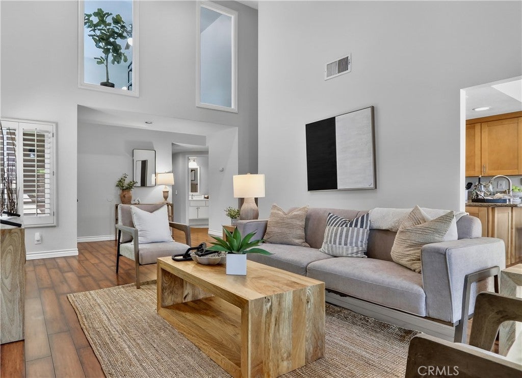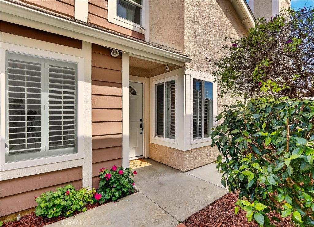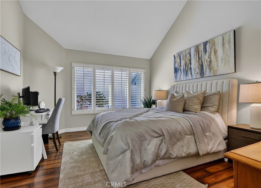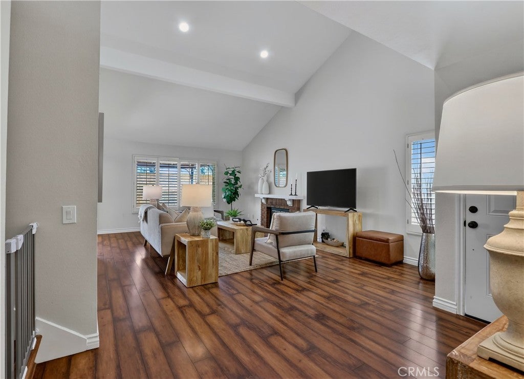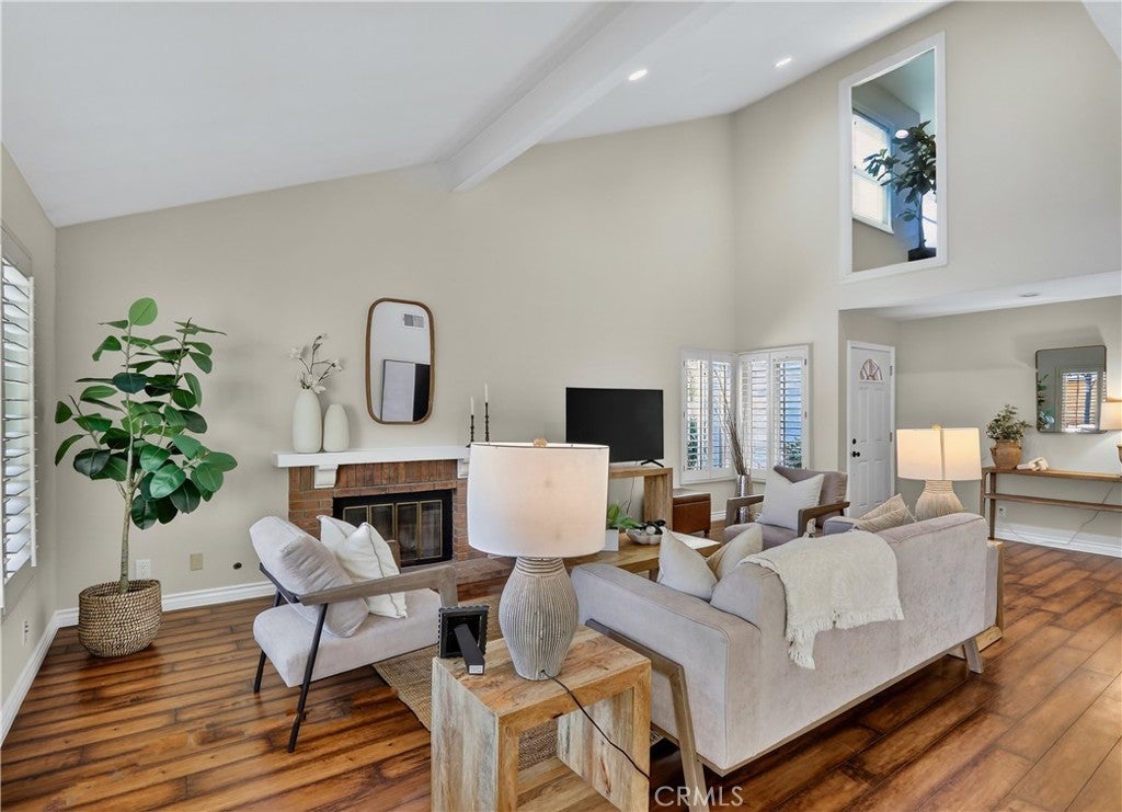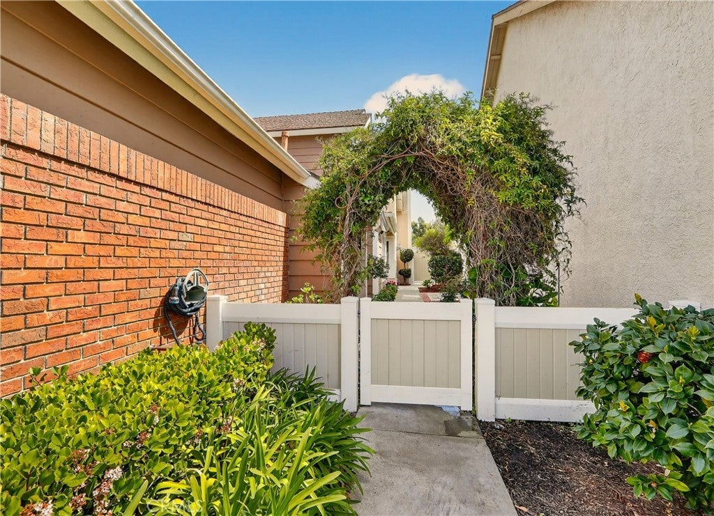 Prepare to fall in love with this charming, updated home, ideally located in the sought-after Carriage Hill community located close to local family friendly parks, shopping, and dining. The manicured landscaping, brick exterior features, and the gated front walkway with arched Jasmine trellis creates a welcoming first impression. The private pathway leading to the front door is framed with vibrant landscaping, fragrant rose bushes, and brick-lined patios providing a serene and private front yard setting. Step inside and soak in the light filled interior, soaring two story cathedral ceilings, plantation shutters, and gorgeous wood floors throughout, all setting the stage for an ideal living environment. This well-designed floor plan has 2 full bedrooms and 2 full bathrooms on the main level, including the primary bedroom suite, a dedicated laundry room with full size washer and dryer hookups, linen closet, plus a spacious upstairs bonus space. Fine features and improvements include New PEX Piping, Recently Upgraded Attic Insulation, New Dual Pane Windows, New Water Heater, and Recently Painted Exterior. The spacious living area is blessed with a cozy brick fireplace providing a gracious space for gatherings with friends and family. The dining area is open to the living room and the kitchen, with sliding doors providing direct access to the back patio, creating a superb indoor-outdoor living space for relaxing and entertaining. The warm and inviting kitchen has Granite countertops, gorgeous cabinetry, Stainless-Steel appliances, upgraded faucets and fixtures, recessed lighting, and a prized breakfast bar. The primary bedroom suite is a peaceful retreat with high vaulted ceilings, and a sparkling primary bathroom with dual vanities, framed vanity mirrors, upgraded faucets and fixtures, and a desirable walk-in closet. The spacious and flexible upstairs bonus room is perfect for a 3rd bedroom, Den/Family Room, Executive Home Office, Media Room, or Rec Room. The enclosed backyard is a private oasis with a large patio and grassy lawn, perfect for relaxing and BBQing with loved ones in the amazing OC weather. Well-maintained resort-like community amenities include a sparkling pool and spa, lighted tennis courts and pickleball courts, basketball courts, and a clubhouse with rentable event spaces. Superbly located across the street from Tamarisk Park with serene walking paths, manicured green spaces, playgrounds, sports courts, picnic areas, and playing fields.