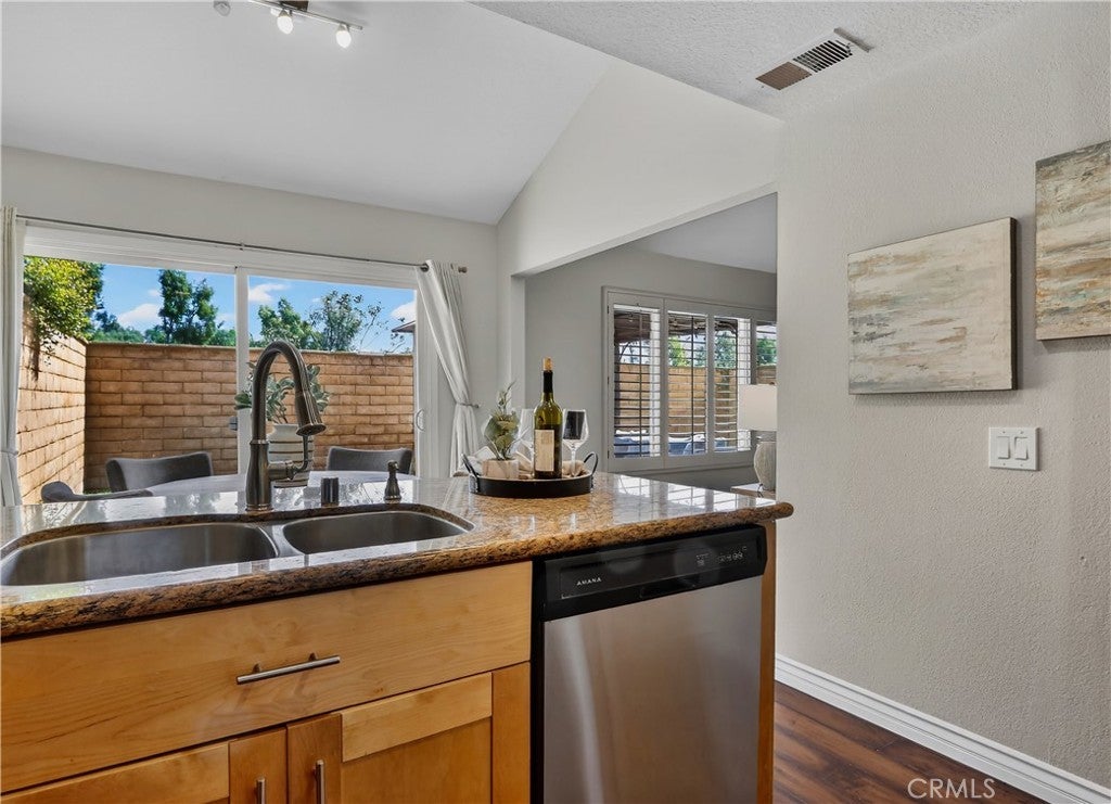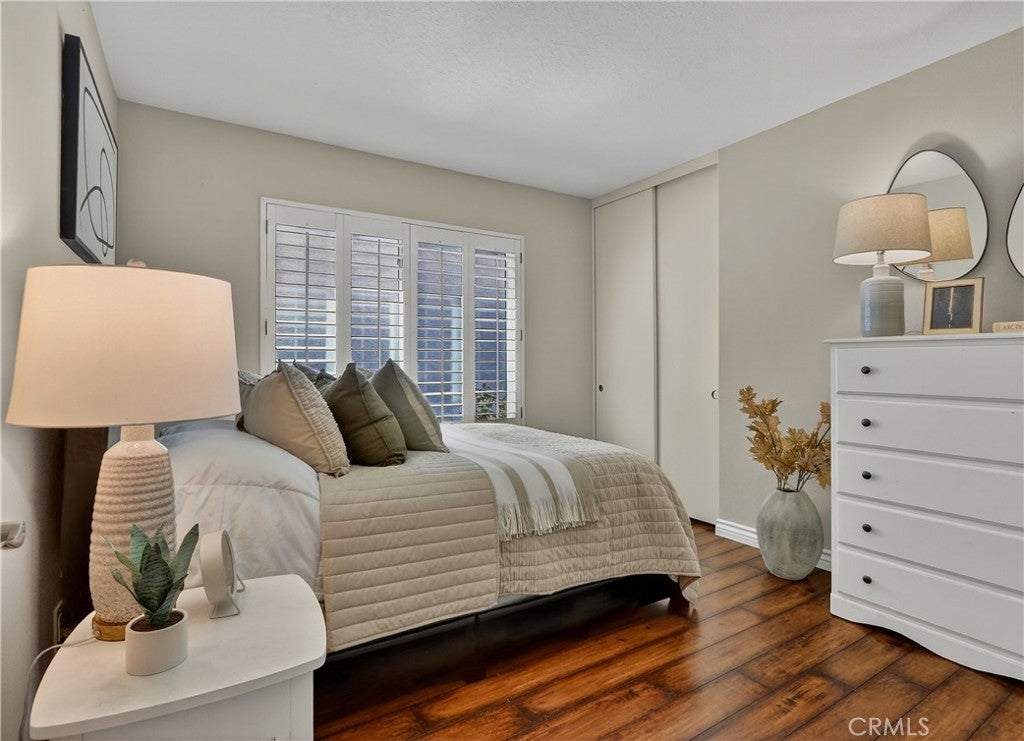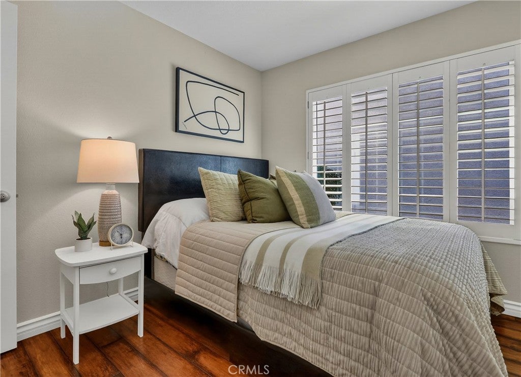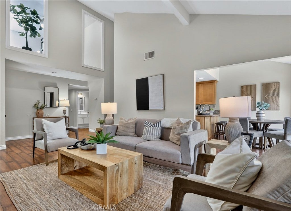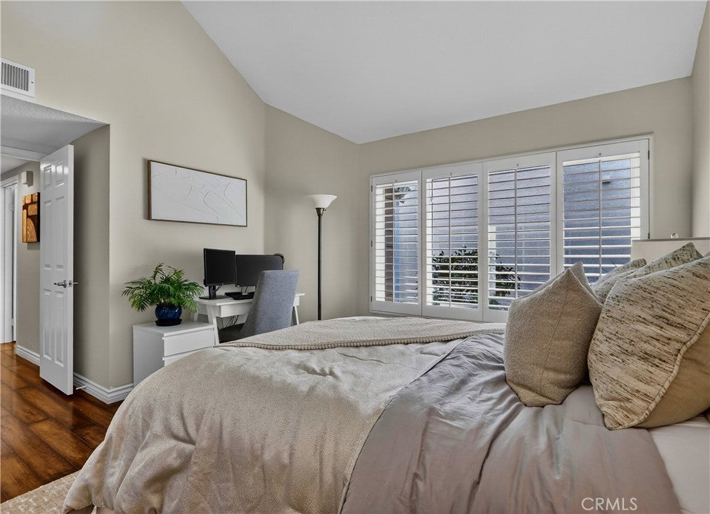Prepare to fall in love with this charming, updated home, ideally located in the sought-after Carriage Hill community located close to local family friendly parks, shopping, and dining. The manicured landscaping, brick exterior features, and the gated front walkway with arched Jasmine trellis creates a welcoming first impression. The private pathway leading to the front door is framed with vibrant landscaping, fragrant rose bushes, and brick-lined patios providing a serene and private front yard setting. Step inside and soak in the light filled interior, soaring two story cathedral ceilings, plantation shutters, and gorgeous wood floors throughout, all setting the stage for an ideal living environment. This well-designed floor plan has 2 full bedrooms and 2 full bathrooms on the main level, including the primary bedroom suite, a dedicated laundry room with full size washer and dryer hookups, linen closet, plus a spacious upstairs bonus space. Fine features and improvements include New PEX Piping, Recently Upgraded Attic Insulation, New Dual Pane Windows, New Water Heater, and Recently Painted Exterior. The spacious living area is blessed with a cozy brick fireplace providing a gracious space for gatherings with friends and family. The dining area is open to the living room and the kitchen, with sliding doors providing direct access to the back patio, creating a superb indoor-outdoor living space for relaxing and entertaining. The warm and inviting kitchen has Granite countertops, gorgeous cabinetry, Stainless-Steel appliances, upgraded faucets and fixtures, recessed lighting, and a prized breakfast bar. The primary bedroom suite is a peaceful retreat with high vaulted ceilings, and a sparkling primary bathroom with dual vanities, framed vanity mirrors, upgraded faucets and fixtures, and a desirable walk-in closet. The spacious and flexible upstairs bonus room is perfect for a 3rd bedroom, Den/Family Room, Executive Home Office, Media Room, or Rec Room. The enclosed backyard is a private oasis with a large patio and grassy lawn, perfect for relaxing and BBQing with loved ones in the amazing OC weather. Well-maintained resort-like community amenities include a sparkling pool and spa, lighted tennis courts and pickleball courts, basketball courts, and a clubhouse with rentable event spaces. Superbly located across the street from Tamarisk Park with serene walking paths, manicured green spaces, playgrounds, sports courts, picnic areas, and playing fields.
