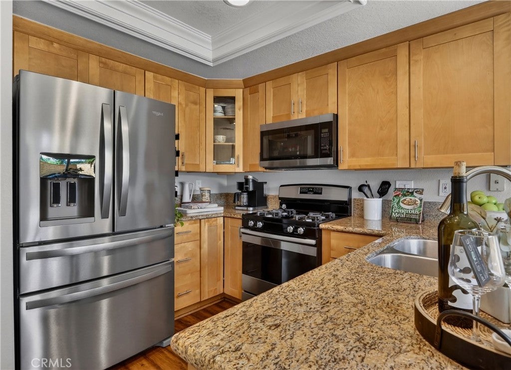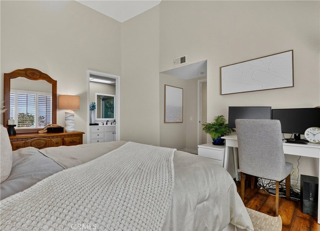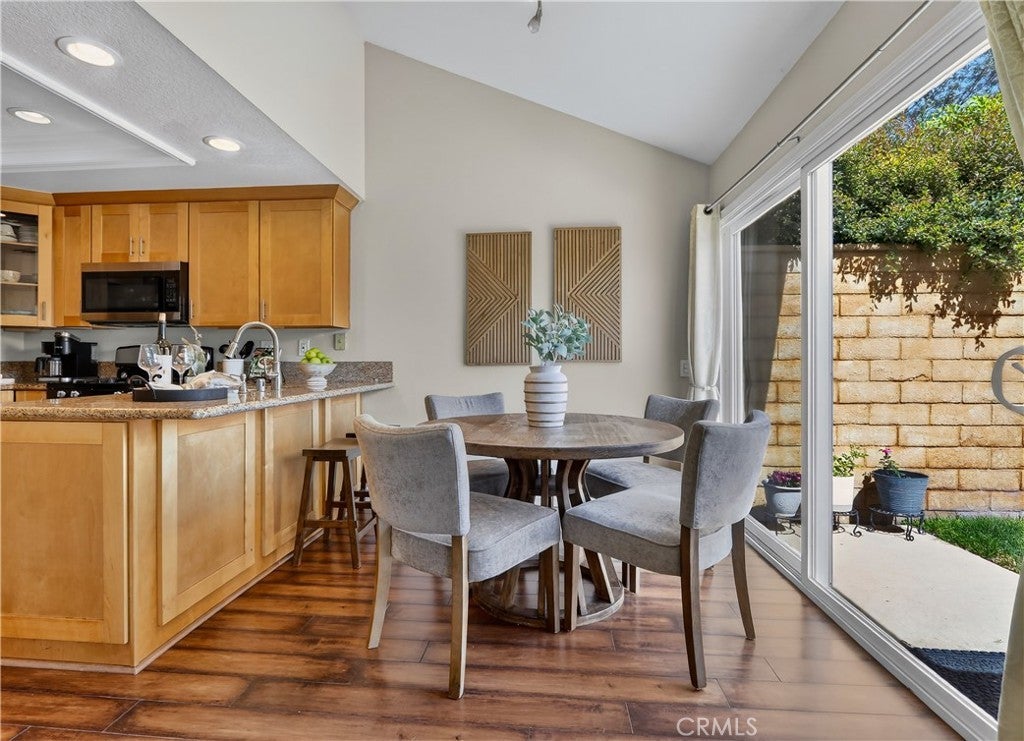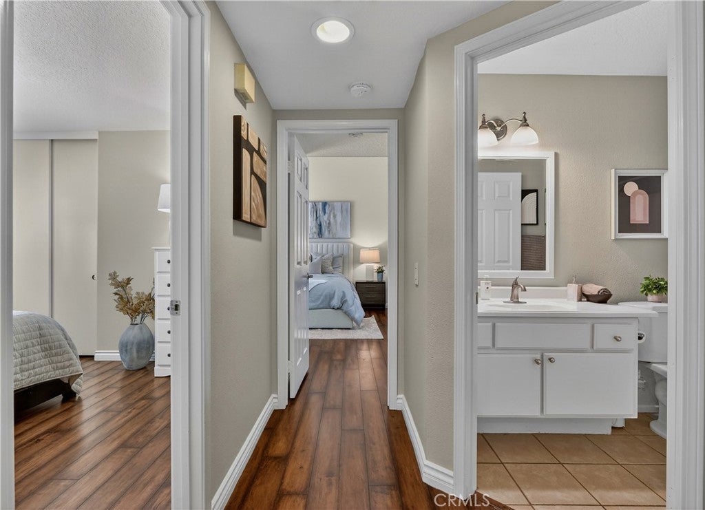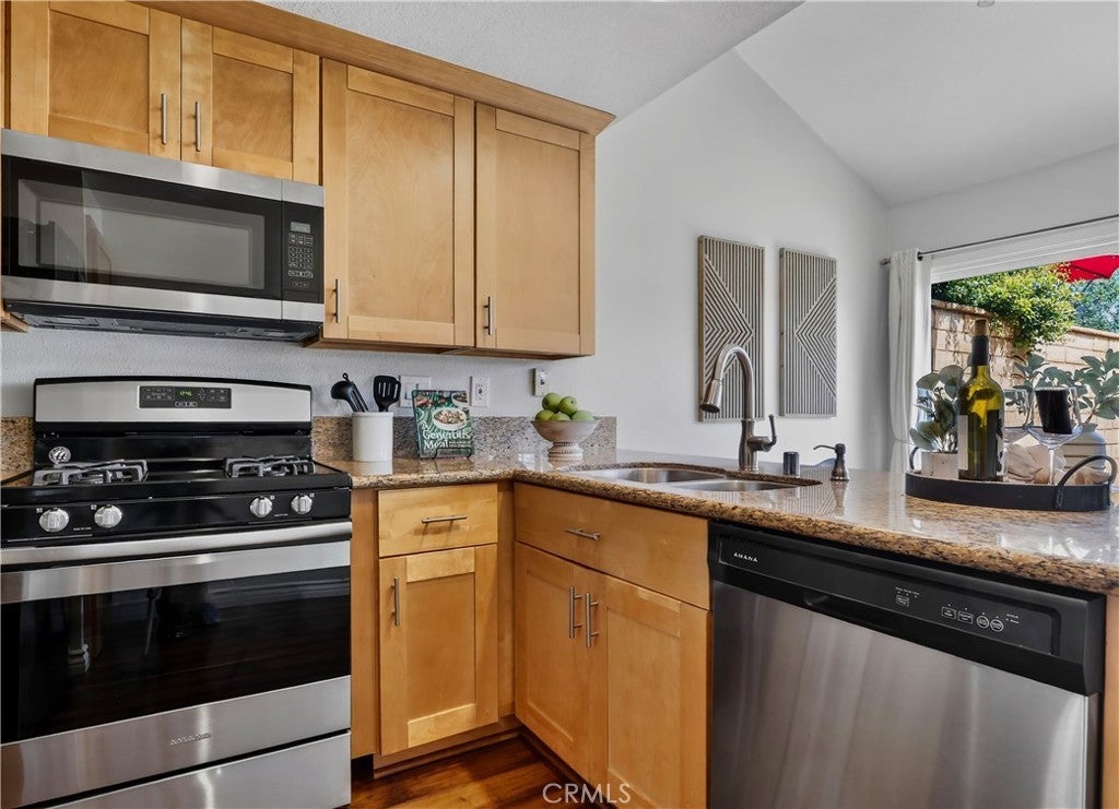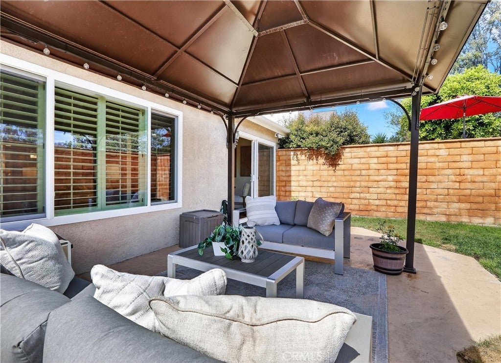 Prepare to fall in love with this charming, updated home, ideally located in the sought-after Carriage Hill community located close to local family friendly parks, shopping, and dining. The manicured landscaping, brick exterior features, and the gated front walkway with arched Jasmine trellis creates a welcoming first impression. The private pathway leading to the front door is framed with vibrant landscaping, fragrant rose bushes, and brick-lined patios providing a serene and private front yard setting. Step inside and soak in the light filled interior, soaring two story cathedral ceilings, plantation shutters, and gorgeous wood floors throughout, all setting the stage for an ideal living environment. This well-designed floor plan has 2 full bedrooms and 2 full bathrooms on the main level, including the primary bedroom suite, a dedicated laundry room with full size washer and dryer hookups, linen closet, plus a spacious upstairs bonus space. Fine features and improvements include New PEX Piping, Recently Upgraded Attic Insulation, New Dual Pane Windows, New Water Heater, and Recently Painted Exterior. The spacious living area is blessed with a cozy brick fireplace providing a gracious space for gatherings with friends and family. The dining area is open to the living room and the kitchen, with sliding doors providing direct access to the back patio, creating a superb indoor-outdoor living space for relaxing and entertaining. The warm and inviting kitchen has Granite countertops, gorgeous cabinetry, Stainless-Steel appliances, upgraded faucets and fixtures, recessed lighting, and a prized breakfast bar. The primary bedroom suite is a peaceful retreat with high vaulted ceilings, and a sparkling primary bathroom with dual vanities, framed vanity mirrors, upgraded faucets and fixtures, and a desirable walk-in closet. The spacious and flexible upstairs bonus room is perfect for a 3rd bedroom, Den/Family Room, Executive Home Office, Media Room, or Rec Room. The enclosed backyard is a private oasis with a large patio and grassy lawn, perfect for relaxing and BBQing with loved ones in the amazing OC weather. Well-maintained resort-like community amenities include a sparkling pool and spa, lighted tennis courts and pickleball courts, basketball courts, and a clubhouse with rentable event spaces. Superbly located across the street from Tamarisk Park with serene walking paths, manicured green spaces, playgrounds, sports courts, picnic areas, and playing fields.
