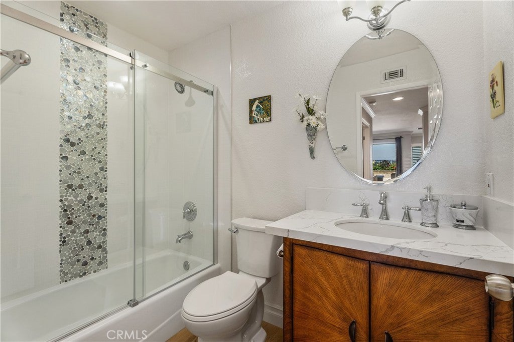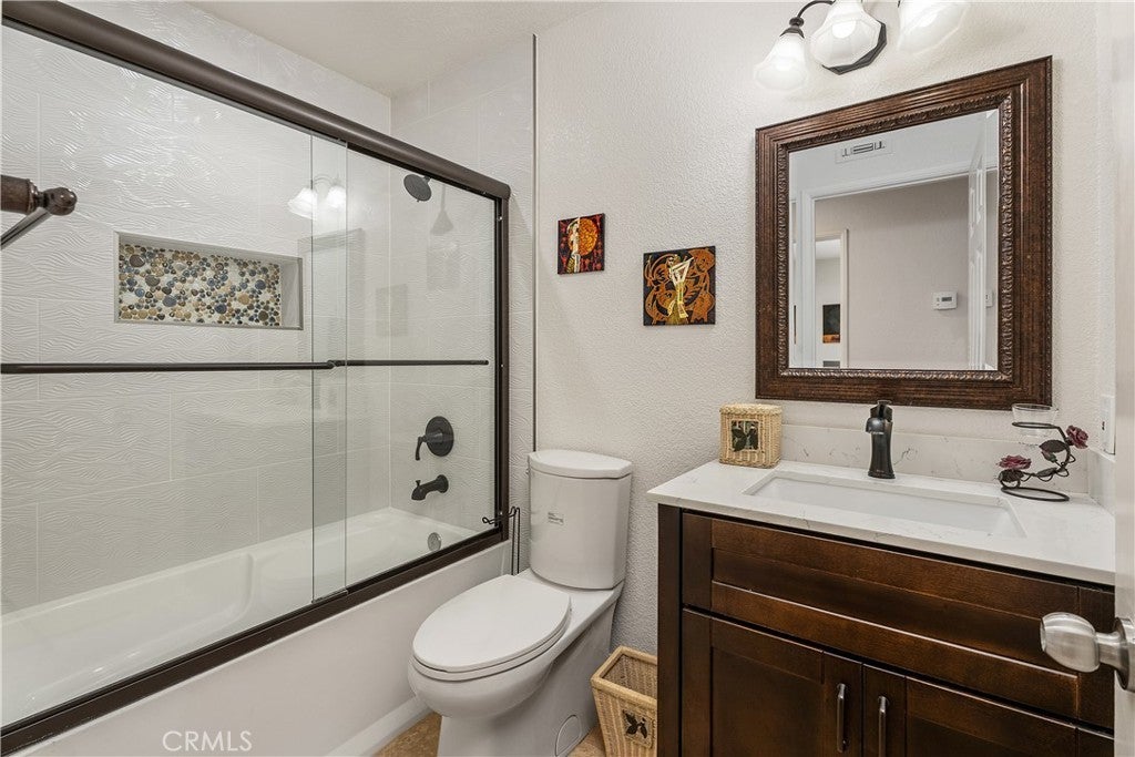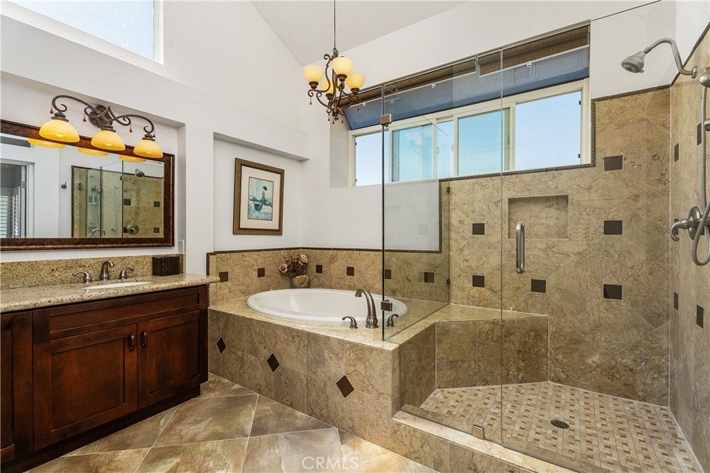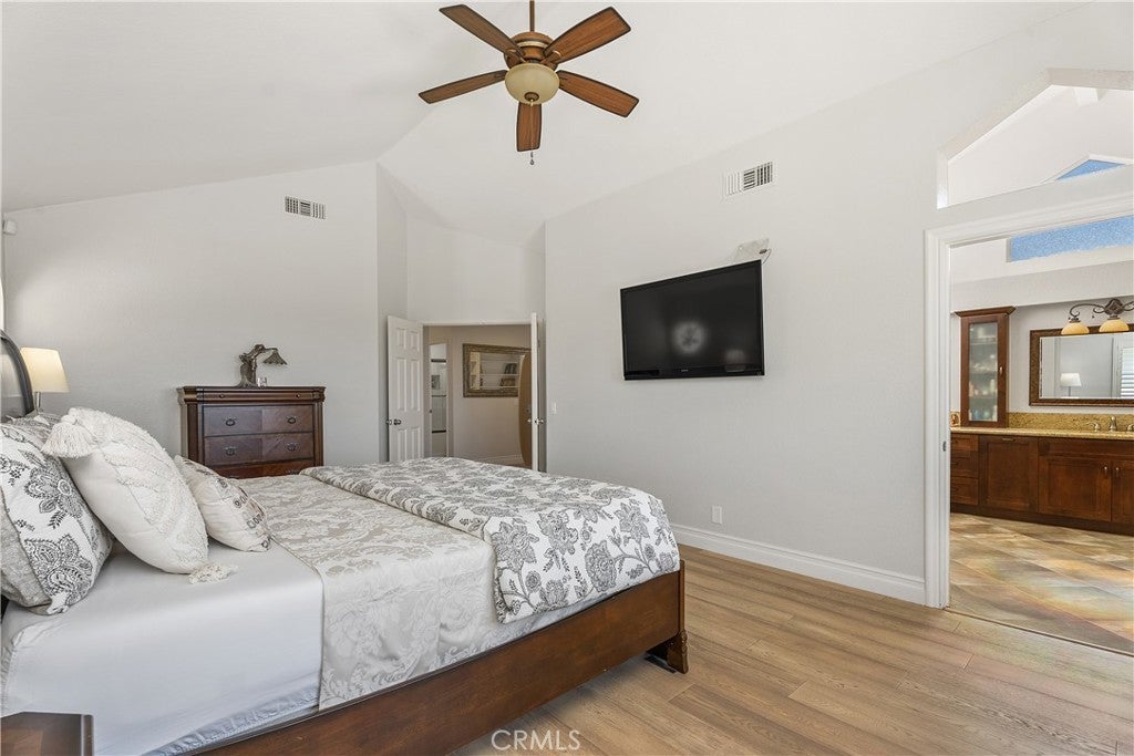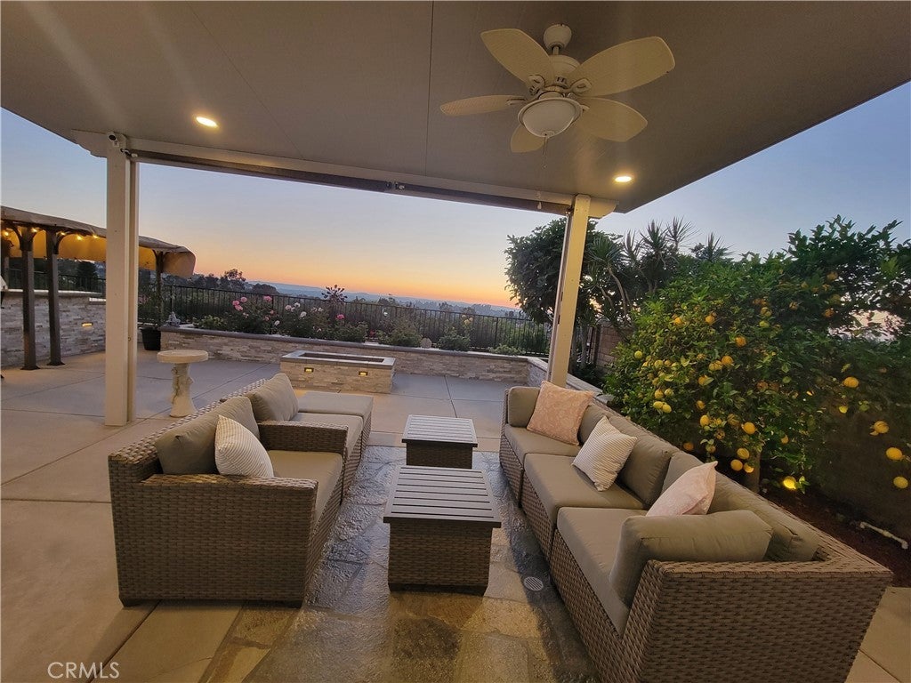 Location, Location, Location. Stunning and Absolute Gem in Prime location of Mission Viejo. Rarely available in most desirable neighborhoods of Belvedere track with paramaniac View of city, mountain and incredible sunset, view of 4th of July fireworks!!! This two-story home located in Single-Loaded Street showcases exceptional detail and a designer touch throughout offers 4 bedrooms plus office/study room on 2nd floor, and 3 full baths – ONE BEDROOM AND FULL BATH DOWNSTAIRS, downstairs bedroom currently used as a home office. Step inside to soaring cathedral ceiling that create a dramatic and airy first impression, every space has been thoughtfully curated with style and comfort in mind. Engineered Wood flooring flows seamlessly throughout, adding timeless elegance and continuity to every room, upgraded Kitchen including custom cabinets function like pantry to maximize storage, Premium stainless steel Appliances, built in Kitchen nook with storage opens to family room and remodeled Gas Fireplace with sparkling fire glass and custom Marble surround. Dual-pane windows complemented by custom built in shutters provide enhanced energy efficiency and comfort year- round. The Primary suite offers dramatic ceiling height, abundant natural light and breathtaking views feel remarkably Spacious and inviting, Primary bathroom includes a glass enclosed walk-in shower and a soothing jetted tub- perfect for unwinding at the end of the day. The custom walk-in closet feature built in organizers to keep everything beautifully in place. 2 other guest bathrooms are Fully upgraded with sleek glass enclosed shower and tub combination offer both style and functionality, freshly painted interior and exterior provide a clean, modern look and true move-in ready appeal. A complete remodeled Front and Backyard with flagstone pavers and concrete block design. Artificial turf, custom flower bed with drought- tolerance shrubs and plants and Fruit trees at front and back yard. Backyard offer entertainer’s dream include Fully built-in outdoor kitchen, inviting firepit, built in 10’ Aluminum Patio cover with recessed lighting and ceiling fan, Breathtaking view of sunset, mountains and sparkling city lights, blending indoor elegance, outdoor living. This home offers the perfect balance of sophistication and relaxation. HOA offers Oso Creek Trail and Lake Mission Viejo HOA membership offers Fishing, Boating, Swimming and Summer concerts are a few of the privileged activities.