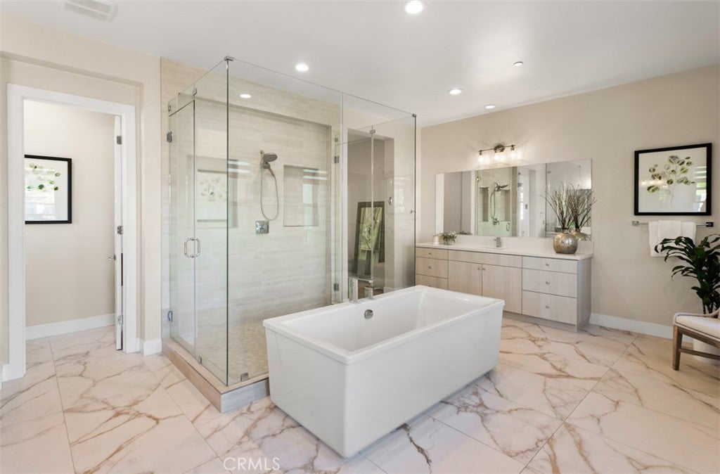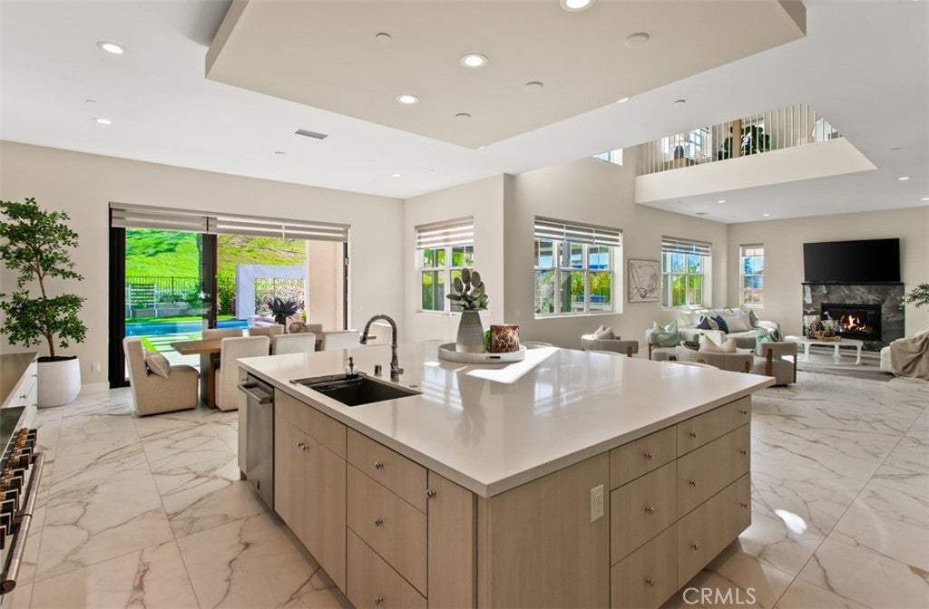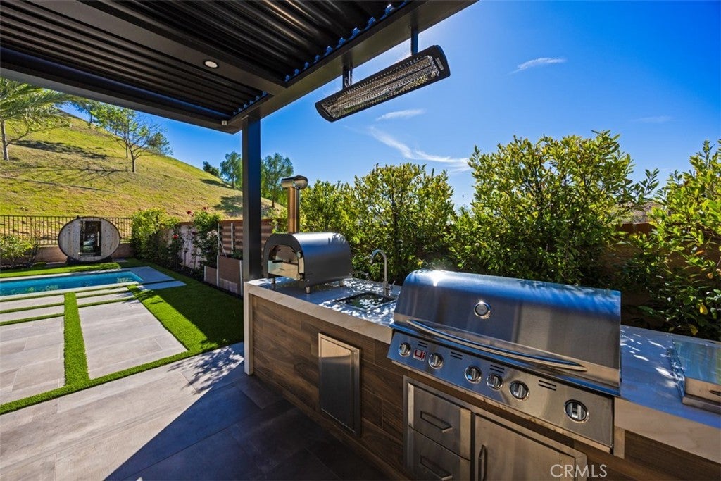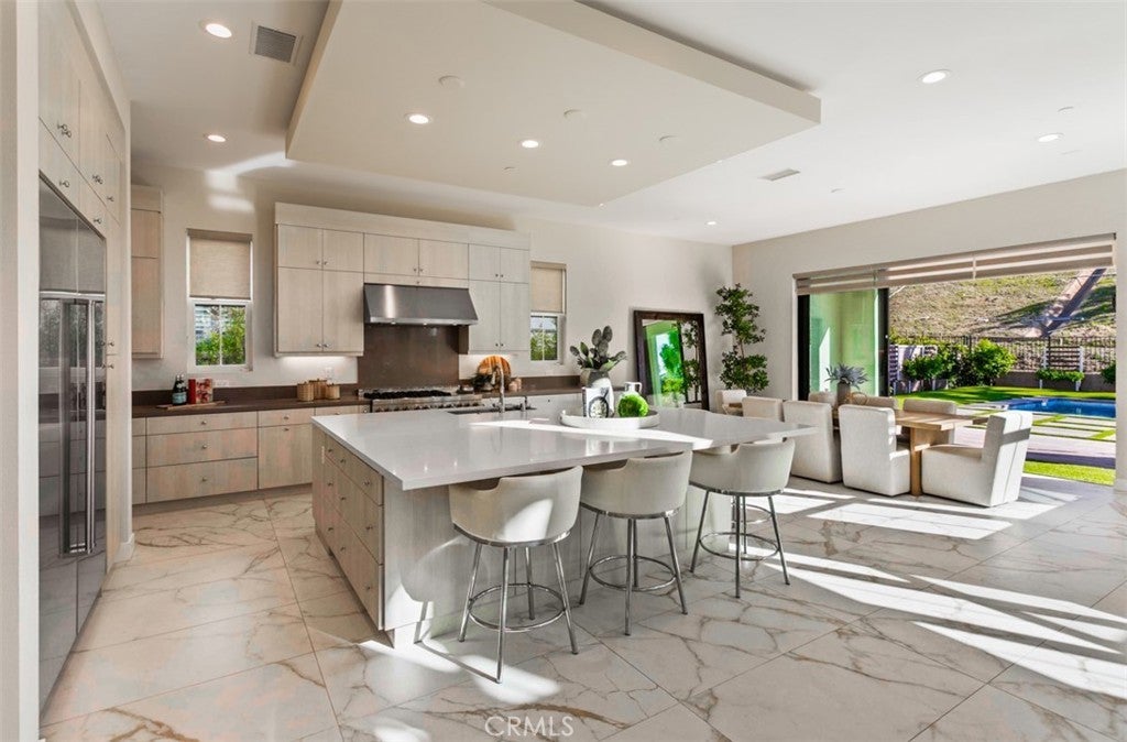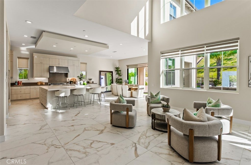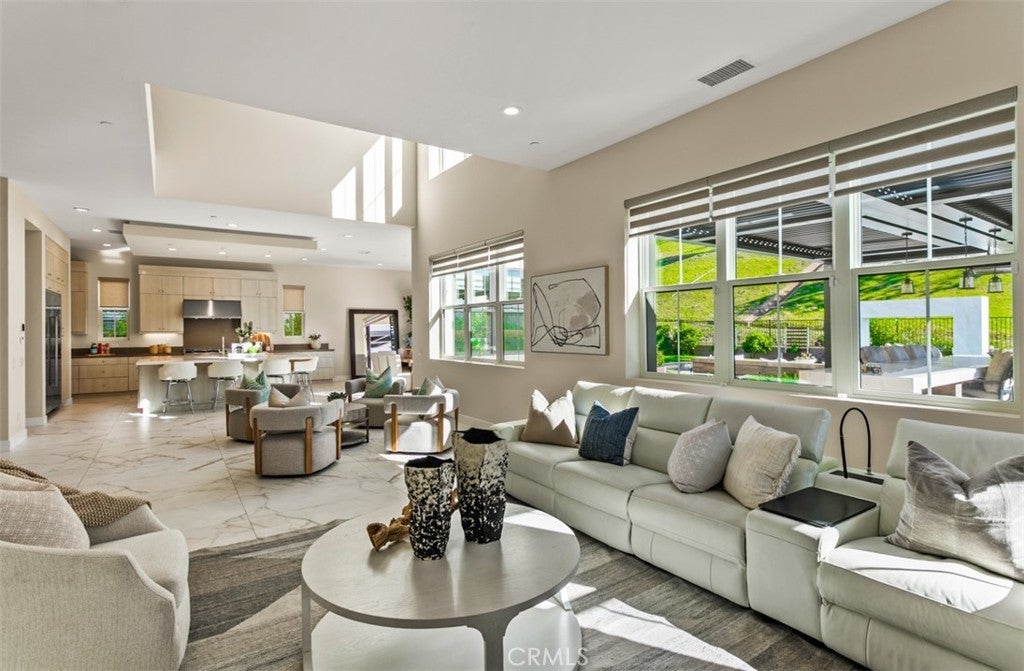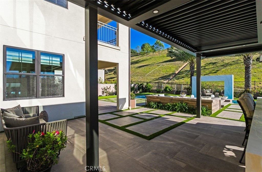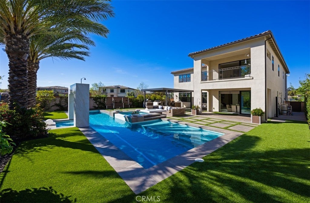Ocean views, a resort-style backyard with pool, spa, sauna, cascading waterfall, fire table, and bar lounging areas create the ultimate setting for luxurious coastal living in Ocean Hills, just minutes from Dana Point Harbor. Ideally positioned with sprawling open space both behind and to the side, this beautifully refreshed residence offers exceptional privacy and a unique serene setting while enjoying access to Ocean Hills’ amenities which include an array of scenic trails along with a community clubhouse with water and entertainment amenities including a fitness center. Inside, the home has been thoughtfully updated with new flooring throughout, showcasing Calacatta Oro matte Italian porcelain tile across the entire main level. Fresh interior paint and a bright modern palette enhance the open-concept great room where expansive living and dining spaces center around views of the backyard oasis. The chef’s kitchen blends style and functionality with soft-close drawers/cabinets, a Sub-Zero refrigerator, JennAir six-burner gas range, under-cabinet lighting and a generous walk-in pantry. The main level offers exceptional flexibility with a private guest suite featuring an ensuite bath, along with a wellness room that can easily serve as a fifth bedroom, fitness studio or home office. Upstairs, a spacious loft landing provides additional living space while the primary suite offers a large private balcony with ocean and sunset views, an oversized walk-in closet and a spa-inspired bath with soaking tub, dual-entry glass shower, separate vanities, and a private balcony to take in the views and enjoy the coastal breeze. The backyard unfolds as a private resort-style retreat, designed for both relaxing and elevated entertaining. A saltwater pool and spa feature two Baja shelf entries and a dramatic waterfall cascading from a sculptural rain-wall arch. Tile blends seamlessly with turf and curated landscaping including fragrant roses, citrus trees and seven raised edible planter boxes. Outdoor entertaining has a fully equipped BBQ kitchen featuring a Fontana pizza oven, refrigerator, sink, and side burner. A spectacular 17-foot sit-up bar anchors the covered pergola with electric control shade, ceiling heaters and built-in lighting for year-round gatherings. Nearby is a gas fire-table lounge with integrated LED lighting. Additional highlights include a Pentair smart pool system, outdoor barrel sauna, epoxy garage flooring, and dual side yard gated access.