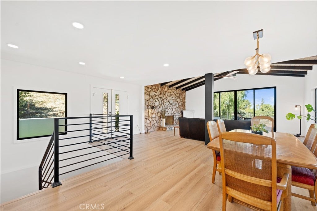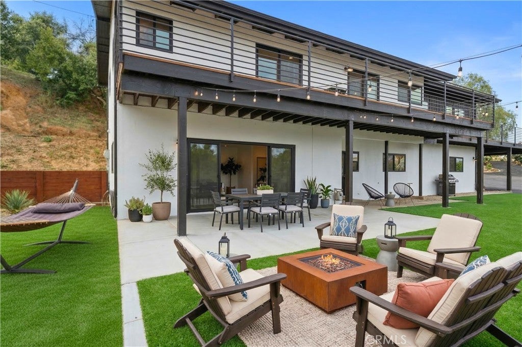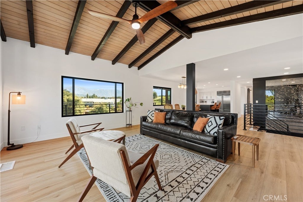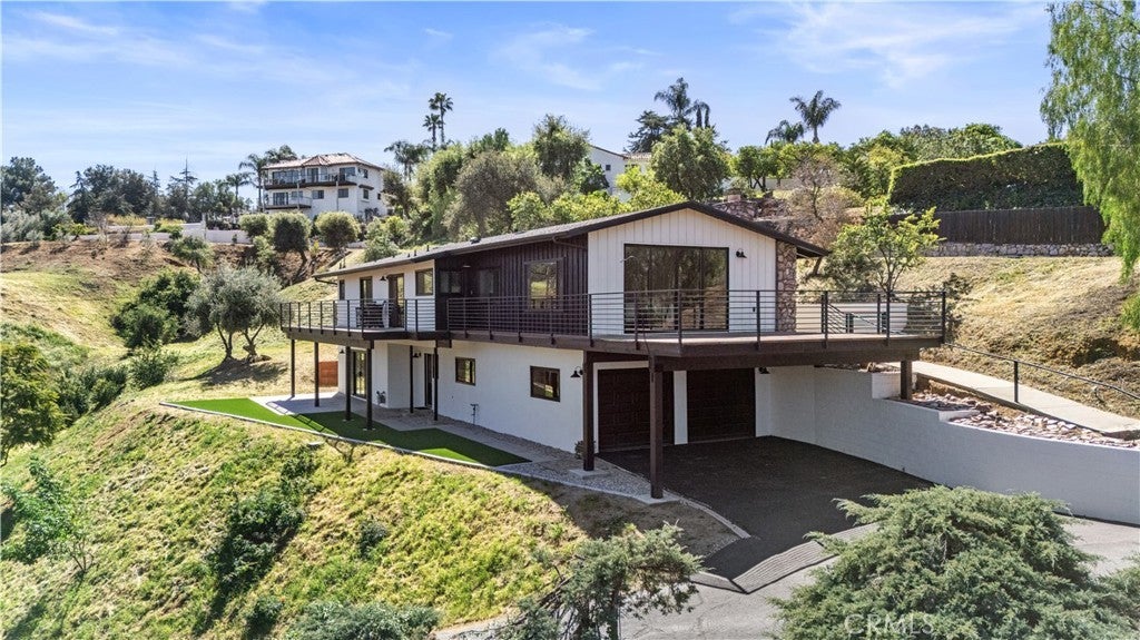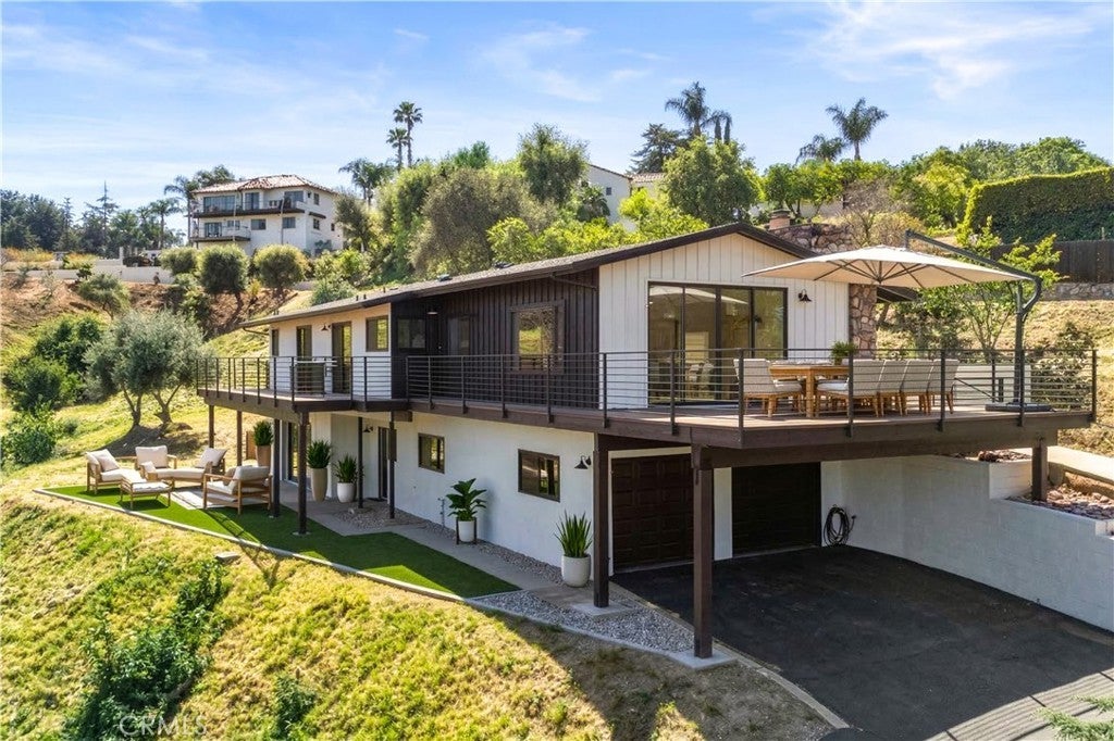 Welcome to this beautifully upgraded mid-century modern home in the heart of South Redlands. As you approach, a long turnaround driveway leads you to a spacious residence designed for one-family living with two individual living areas, offering the perfect balance of comfort and functionality. Inside, the open-concept design with exposed beams invites natural light. Open concept from the entry, to the living room, dining room, and kitchen makes it ideal for both daily living and entertaining. The updated kitchen is equipped with quartz countertops, a Sub-Zero refrigerator, and a Viking professional stove/oven, opening to the dining and living areas. The primary bedroom has stunning views, a luxurious ensuite bathroom with a walk-in shower and dual vanity, and direct access to the outdoor deck. Step outside onto the entertaining front large deck which is perfect for dining and enjoying the 180-degree panoramic views of the surrounding mountains, valley and golf course. With ample space for an ADU, pool, pickleball court or RV parking, the expansive yard is a blank canvas waiting to be personalized to your own taste. The lower level provides a versatile second living area, complete with a private bedroom, bathroom,laundry, and full kitchen—perfect for multi-generational living, long-term guests, gym, theater room or additional rental income. It opens out to your outdoor entertainment space as well. Conveniently located in the highly sought-after South Redlands neighborhood, you're just a short walk or golf cart ride away from Redlands Country Club and close to Loma Linda Medical Center, the University of Redlands, ESRI, shops, restaurants, and top-rated schools. This home offers flexibility to fit your lifestyle while capturing the essence of luxury living with spectacular views. Some pictures have been digitally enhanced to show potential for gym, pool, outdoor entertaining.