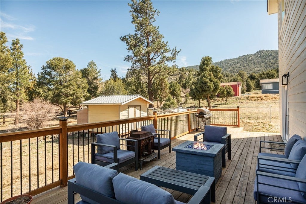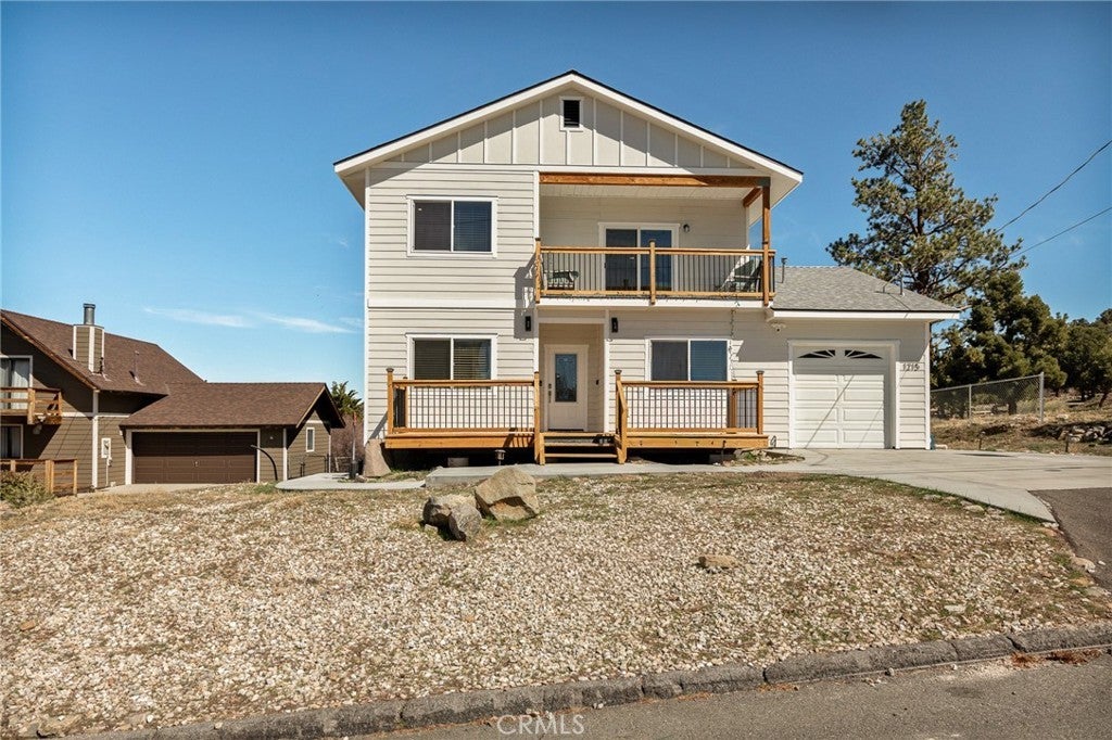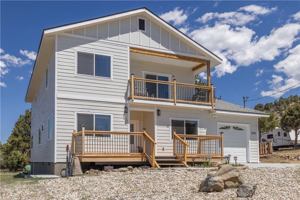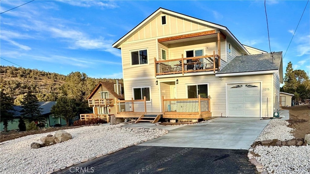 Welcome to your dream mountain retreat designed to comfortably accommodating large groups, making it a perfect gathering place for family and friends after a day of enjoying the lake, slopes, or trails. Nestled in the picturesque landscape of Big Bear, this stunning newer construction (2023) custom home offers tranquility and breathtaking mountain views, with spectacular sunsets painting the sky each evening. Featuring 5 bedrooms which includes an enclosed alcove/loft, at approximately 2379 Sqft with 3.5 baths this home comfortably accommodates large groups and vacation guests, making it an excellent second home or short-term rental investment opportunity. Step inside to discover a spacious and inviting interior filled with natural light and cozy warmth. The open floor plan seamlessly connects the living, dining, and kitchen areas, creating the perfect space for both relaxation and entertaining. Enjoy multiple outdoor living spaces including a front deck, expansive back deck, and upstairs balcony, ideal for taking in the peaceful mountain setting. Additional highlights include a bonus/game room, custom countertops, and furniture included for a turnkey experience, tankless water heater, fire sprinklers and fire-resistant siding for added safety, and an expanded driveway accommodating up to four cars plus a one-car garage. Unwind after a day of adventure in the jacuzzi/spa, perfect after skiing, hiking, or enjoying the lake. With flexible living and multiple sleeping areas, the home is ideal for large family gatherings, shared ownership, or a high-capacity vacation rental that can accommodate 12+ guests. Located in Big Bear City, just minutes from Big Bear Lake, ski resorts, hiking trails, and the Village, this home offers easy access to year-round recreation, from snow trips and lake days to hiking weekends and cozy evenings by the fire. Bonus Opportunity. The adjacent (similar size) lot is also available for purchase for an additional $50,000, offering potential for added privacy, expanded outdoor space, building a second home, or long-term investment. Whether you're looking for a vacation home, mountain retreat, or investment property, this home offers the perfect combination of space, comfort, and flexibility to create unforgettable mountain experiences.
