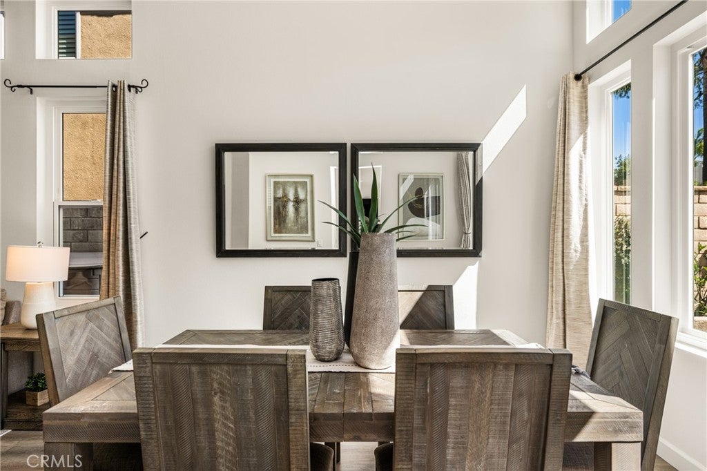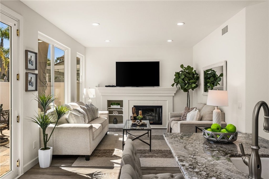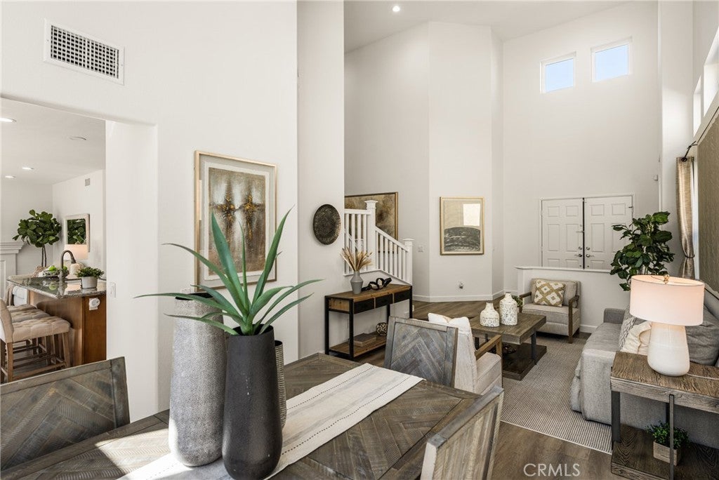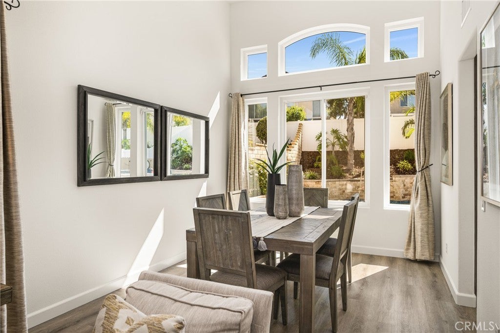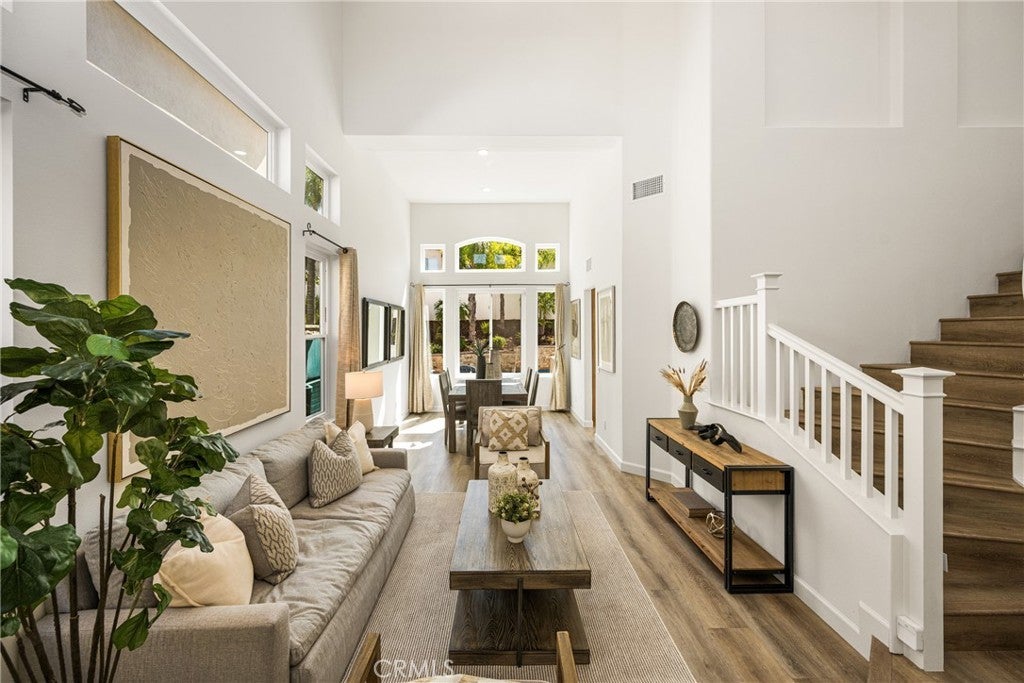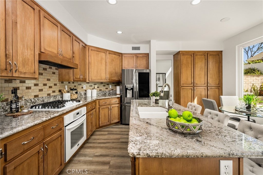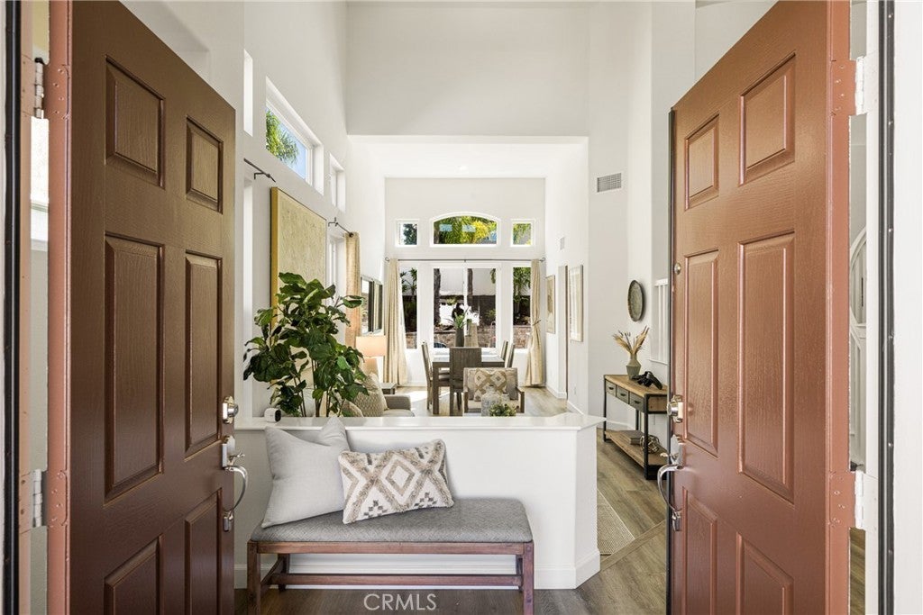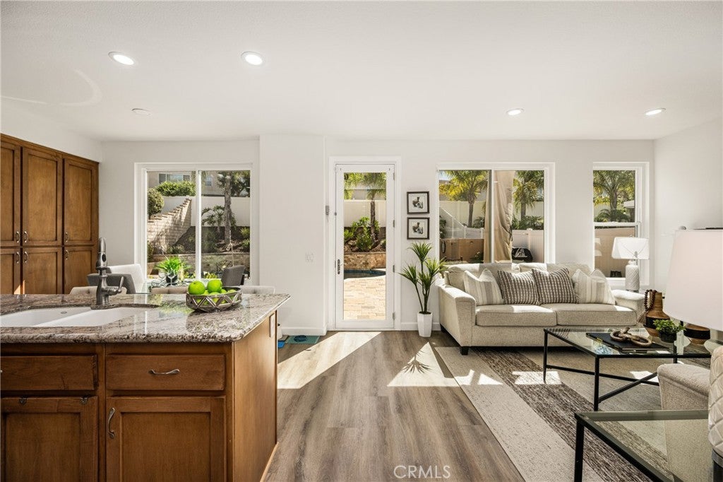 Beautifully upgraded and move-in ready, this Foothill Ranch home offers a flexible and highly desirable floor plan featuring a downstairs bedroom and full bath, ideal for guests, multigenerational living, or a private home office. Step inside to a light-filled living room with soaring ceilings and walls of windows, creating an open and inviting atmosphere. The home has been thoughtfully updated with new luxury vinyl plank flooring (2024), fresh interior paint (2026), updated lighting, and recessed lighting in the family and dining rooms. The remodeled kitchen features custom wood cabinetry, granite countertops, stainless steel appliances, a pantry cabinet, and a center island with seating, along with a functional layout that opens to the family room—perfect for everyday living and entertaining. The adjacent breakfast nook overlooks the resort-style backyard, offering views of the saltwater pool and spa with a polished PebbleTec surface and a beautifully landscaped slope with palm trees and colorful flowers. Upstairs, the primary suite is a relaxing retreat with high ceilings, a ceiling fan, dual vanities, a separate shower, soaking tub, and a spacious walk-in closet with mirrored wardrobes. Two additional bedrooms share a full bathroom with dual vanities, and a convenient upstairs laundry room with sink adds everyday ease. Additional improvements include new HVAC (2023), roof updates (2025), whole house fan, insulated garage doors, and built-in garage storage. The backyard is designed for both entertaining and relaxation, featuring a sparkling pool and spa, brick paver patio, planters, and generous space for dining, lounging, BBQing, and play. Block wall and vinyl fencing provide enhanced privacy, while the deep, wide lot with an elevated slope creates a unique sense of openness. Conveniently located near parks, hiking and biking trails, shopping, dining, and top-rated schools, this home offers the perfect blend of comfort, style, and functionality.