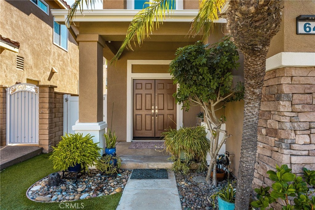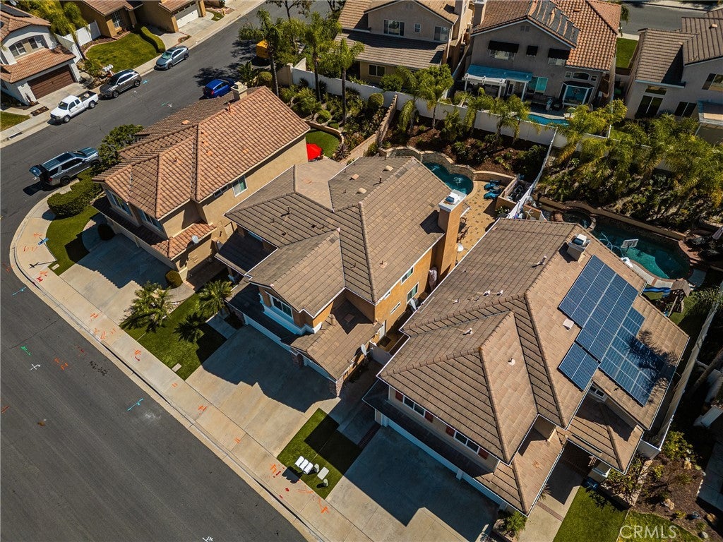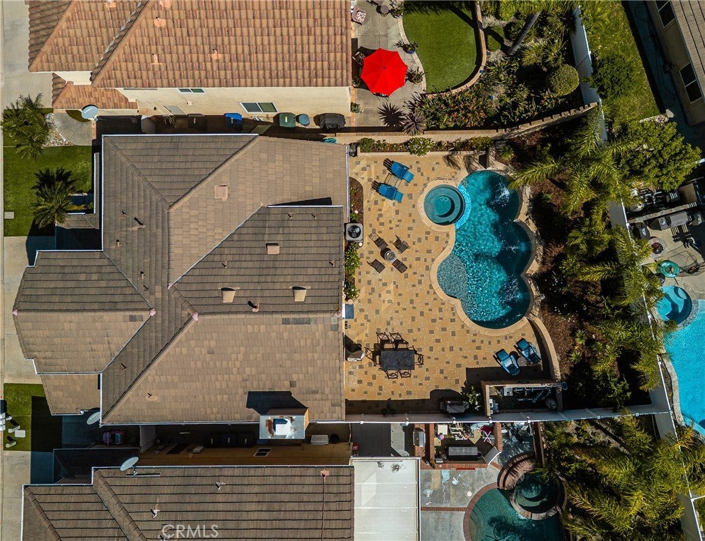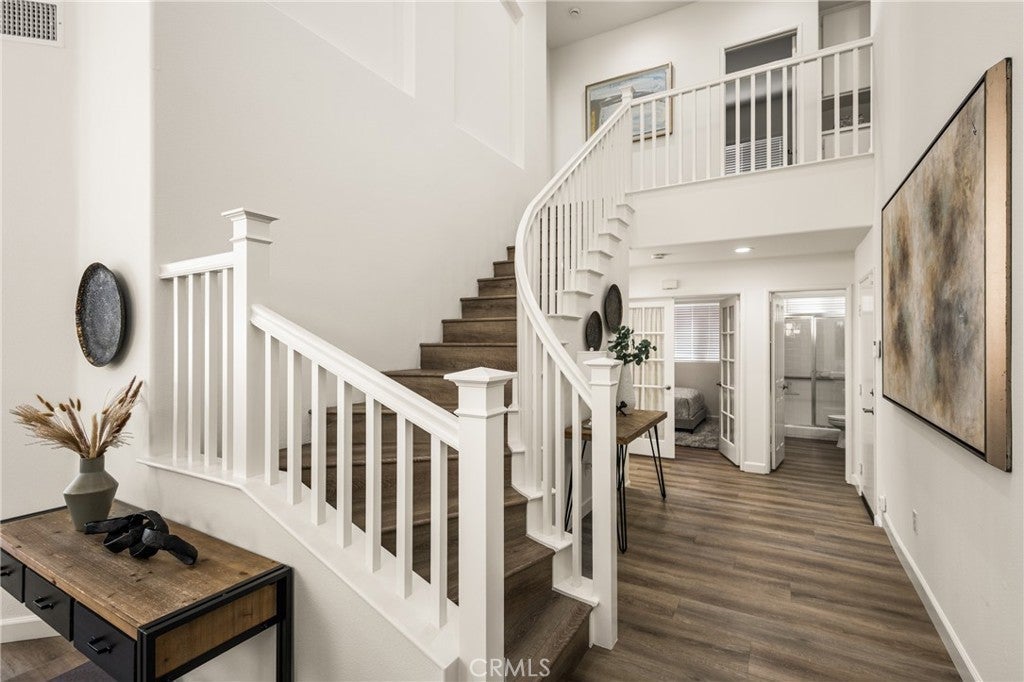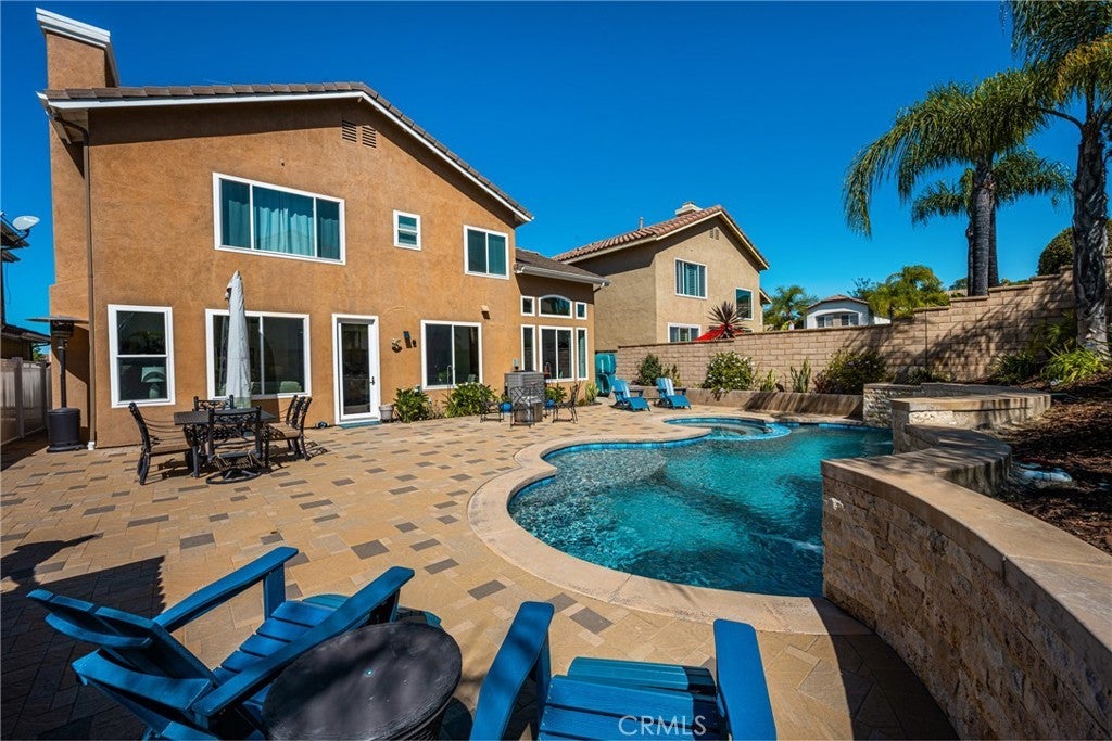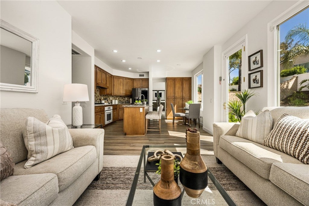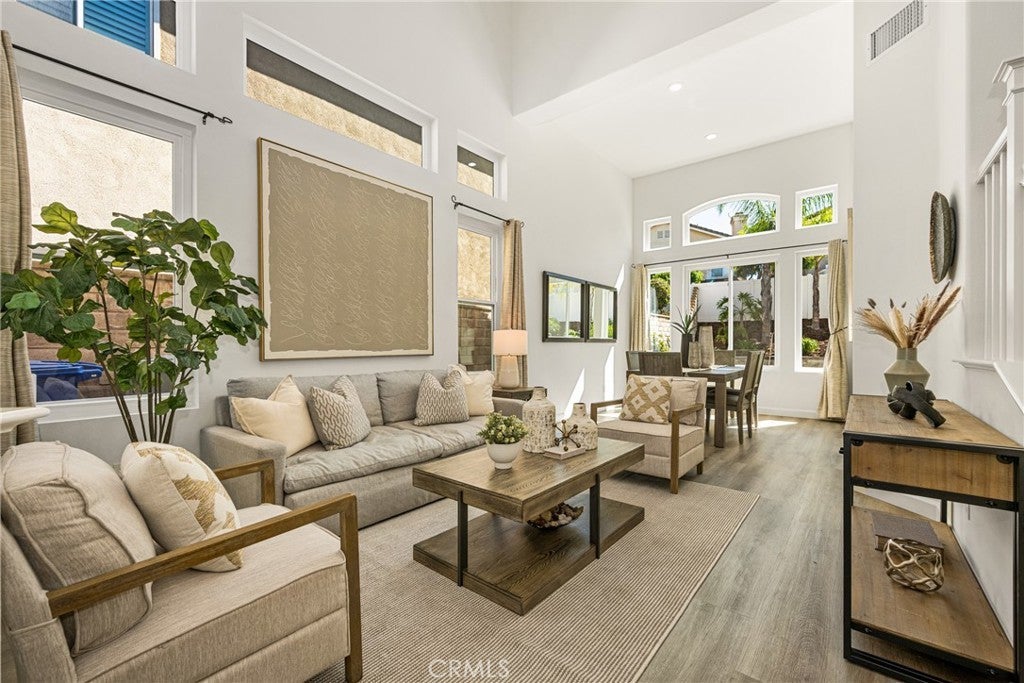 Beautifully upgraded and move-in ready, this Foothill Ranch home offers a flexible and highly desirable floor plan featuring a downstairs bedroom and full bath, ideal for guests, multigenerational living, or a private home office. Step inside to a light-filled living room with soaring ceilings and walls of windows, creating an open and inviting atmosphere. The home has been thoughtfully updated with new luxury vinyl plank flooring (2024), fresh interior paint (2026), updated lighting, and recessed lighting in the family and dining rooms. The remodeled kitchen features custom wood cabinetry, granite countertops, stainless steel appliances, a pantry cabinet, and a center island with seating, along with a functional layout that opens to the family room—perfect for everyday living and entertaining. The adjacent breakfast nook overlooks the resort-style backyard, offering views of the saltwater pool and spa with a polished PebbleTec surface and a beautifully landscaped slope with palm trees and colorful flowers. Upstairs, the primary suite is a relaxing retreat with high ceilings, a ceiling fan, dual vanities, a separate shower, soaking tub, and a spacious walk-in closet with mirrored wardrobes. Two additional bedrooms share a full bathroom with dual vanities, and a convenient upstairs laundry room with sink adds everyday ease. Additional improvements include new HVAC (2023), roof updates (2025), whole house fan, insulated garage doors, and built-in garage storage. The backyard is designed for both entertaining and relaxation, featuring a sparkling pool and spa, brick paver patio, planters, and generous space for dining, lounging, BBQing, and play. Block wall and vinyl fencing provide enhanced privacy, while the deep, wide lot with an elevated slope creates a unique sense of openness. Conveniently located near parks, hiking and biking trails, shopping, dining, and top-rated schools, this home offers the perfect blend of comfort, style, and functionality.