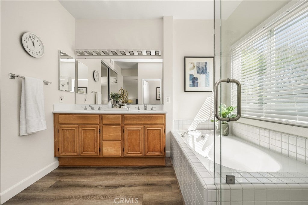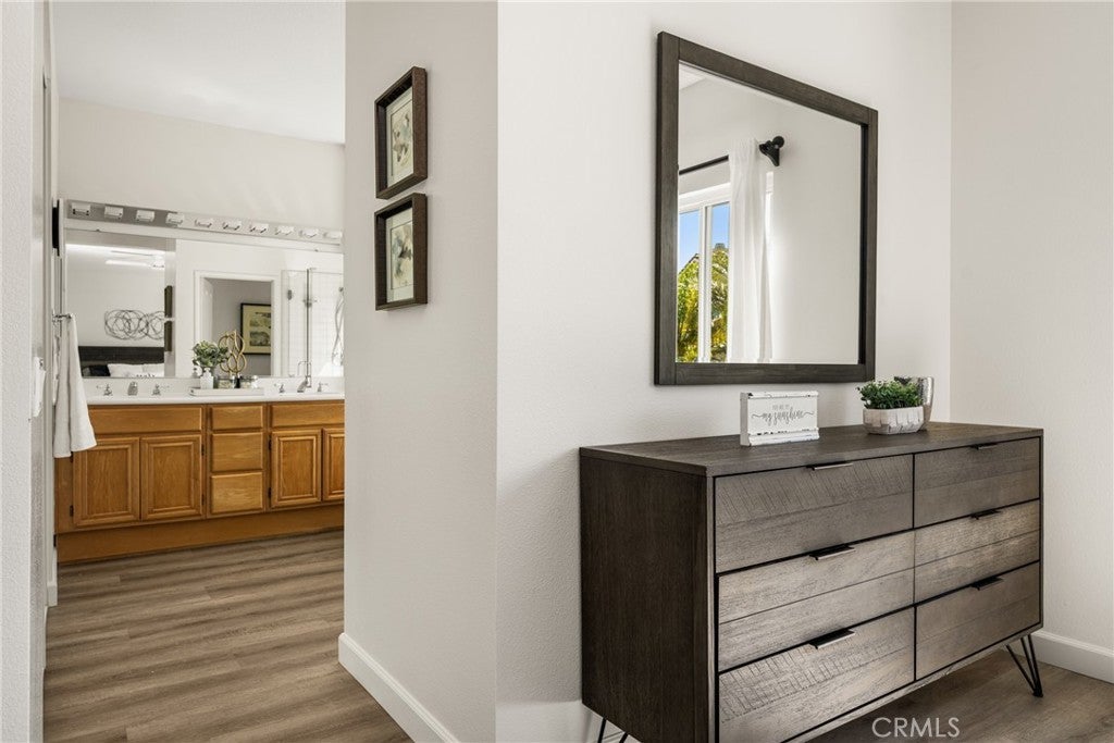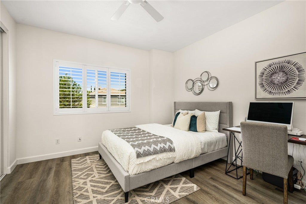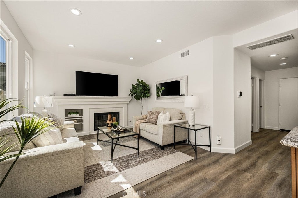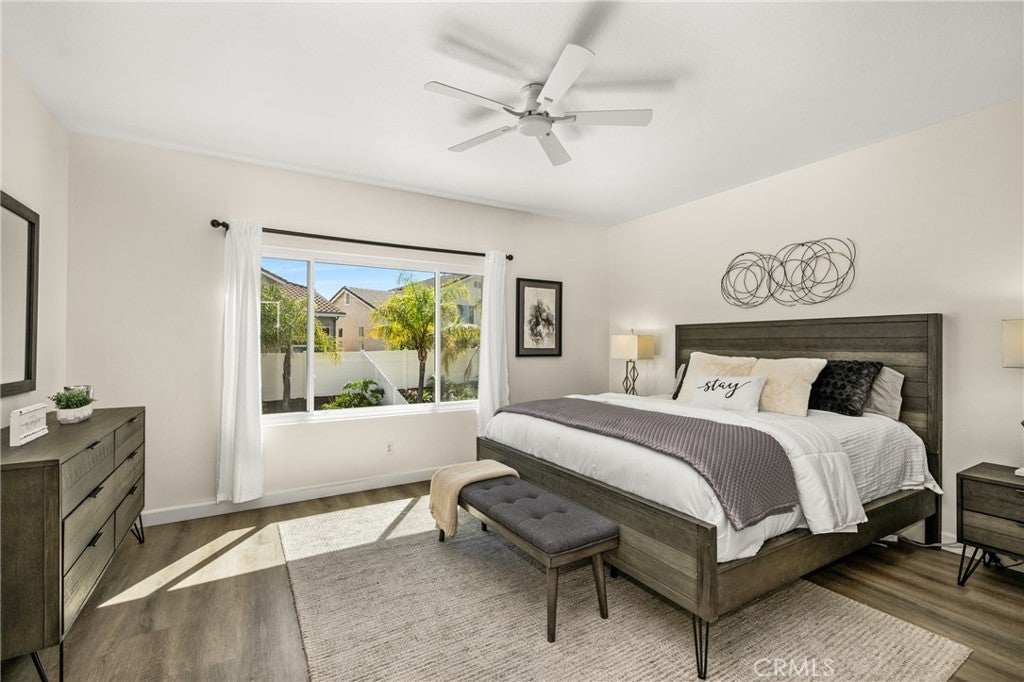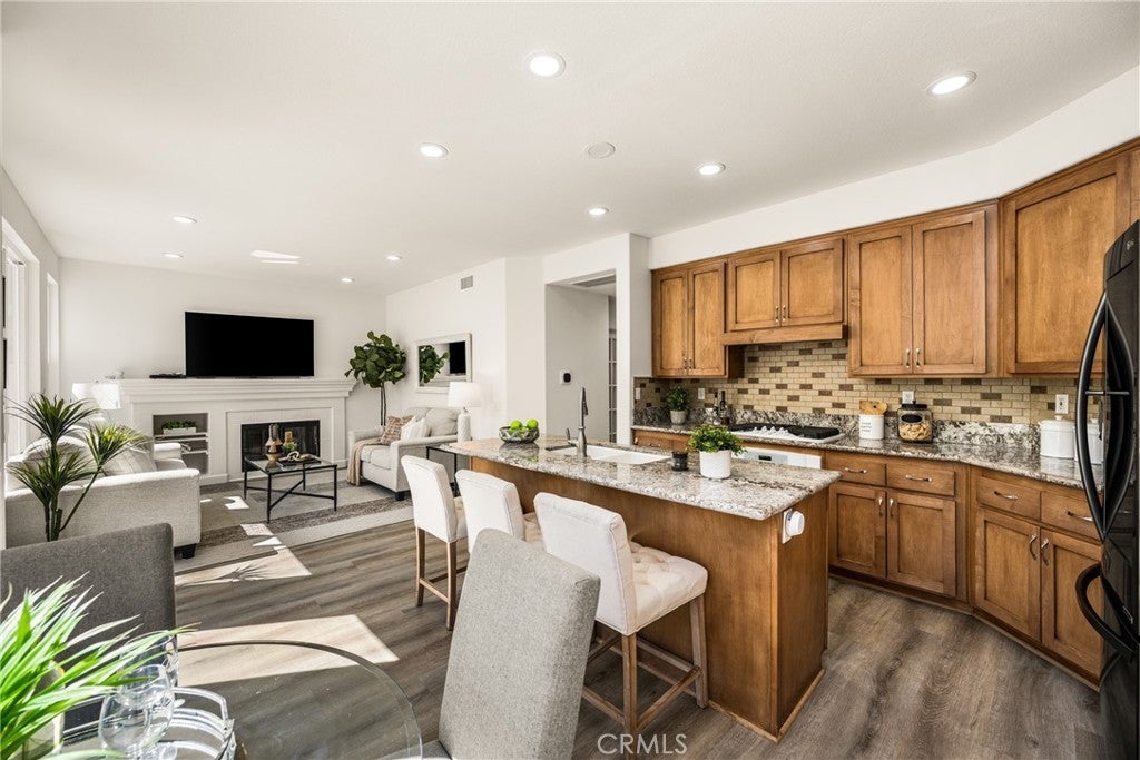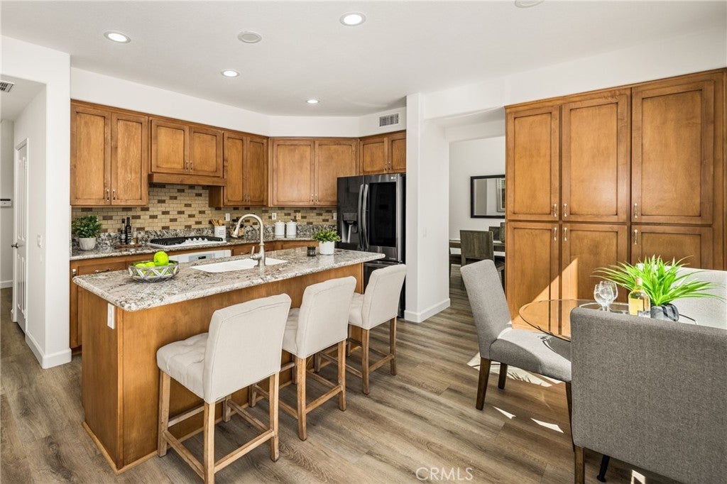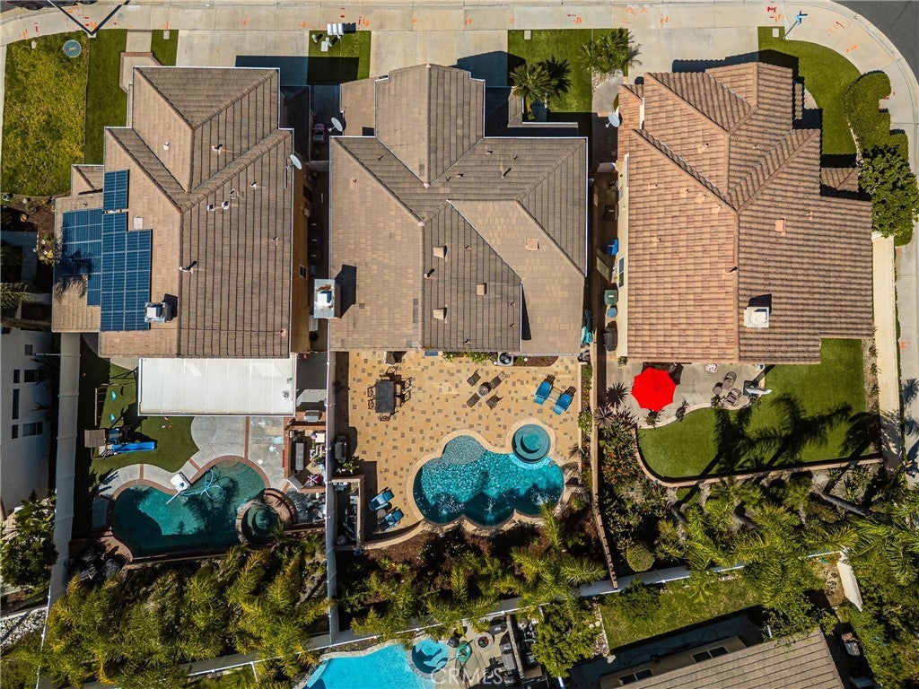 Beautifully upgraded and move-in ready, this Foothill Ranch home offers a flexible and highly desirable floor plan featuring a downstairs bedroom and full bath, ideal for guests, multigenerational living, or a private home office. Step inside to a light-filled living room with soaring ceilings and walls of windows, creating an open and inviting atmosphere. The home has been thoughtfully updated with new luxury vinyl plank flooring (2024), fresh interior paint (2026), updated lighting, and recessed lighting in the family and dining rooms. The remodeled kitchen features custom wood cabinetry, granite countertops, stainless steel appliances, a pantry cabinet, and a center island with seating, along with a functional layout that opens to the family room—perfect for everyday living and entertaining. The adjacent breakfast nook overlooks the resort-style backyard, offering views of the saltwater pool and spa with a polished PebbleTec surface and a beautifully landscaped slope with palm trees and colorful flowers. Upstairs, the primary suite is a relaxing retreat with high ceilings, a ceiling fan, dual vanities, a separate shower, soaking tub, and a spacious walk-in closet with mirrored wardrobes. Two additional bedrooms share a full bathroom with dual vanities, and a convenient upstairs laundry room with sink adds everyday ease. Additional improvements include new HVAC (2023), roof updates (2025), whole house fan, insulated garage doors, and built-in garage storage. The backyard is designed for both entertaining and relaxation, featuring a sparkling pool and spa, brick paver patio, planters, and generous space for dining, lounging, BBQing, and play. Block wall and vinyl fencing provide enhanced privacy, while the deep, wide lot with an elevated slope creates a unique sense of openness. Conveniently located near parks, hiking and biking trails, shopping, dining, and top-rated schools, this home offers the perfect blend of comfort, style, and functionality.