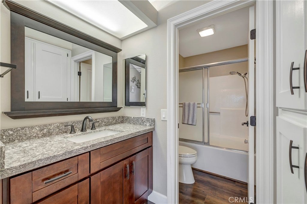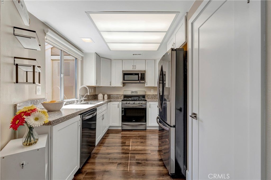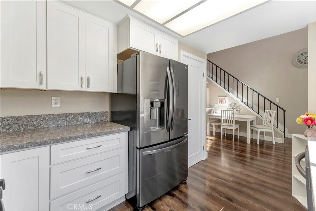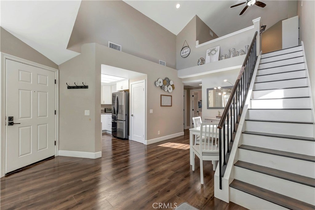 This beautifully appointed, spacious home provides two bedrooms, two bathrooms, and a large loft, a versatile space for an office or additional living area. This home has been completely remodeled. The large kitchen has been thoughtfully designed with custom cabinetry, spacious pantry, plenty of cupboard and countertop space, and newer stainless-steel appliances. Recent upgrades include beautiful vinyl flooring throughout, remodeled bathrooms, complete PEX re-pipe, LED lighting, ceiling fans in the bedrooms and loft, fresh paint, indoor laundry with washer and dryer included. The primary bedroom is an ensuite with private bathroom and walk-in closet. The secondary bedroom is spacious. The open design of this floor plan is perfect for comfortable living and entertaining. The private patio is wonderful for enjoying the sunshine and potting plants for your home-grown veggies. The one car garage is situated directly below the home providing easy access and extra storage space. You will love the secluded feeling with mature trees surrounding the home. The community pool is across the way, a wonderful place to relax after a dip in the pool. Close to everything yet with that country feel! Enjoy the Lake Forest Sports Park, hiking and biking trails, restaurants and shopping, the toll roads, all within minutes of your new home! Race to this one, you will delight in what you see!