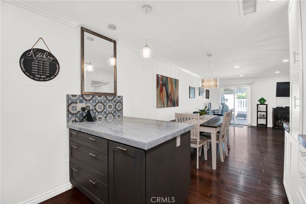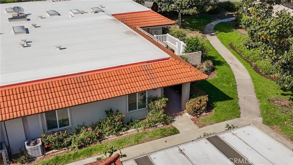 WHEN ONLY THE BEST WILL DO! This end unit, 2 bedroom, 2 remodeled baths, Ventura model, shows like a model. Beautiful, large living room & dining room with crown moldings to Accent the smooth ceilings. Dual pane windows, indirect lighting throughout and hardwood floors. TOTALLY REDESIGNED KITCHEN! Every conceivable upgrade! Stainless steel appliances, quartz countertops with a dynamic backsplash! pendant lighting! And much more! sliding glass door opens to the large patio with newer tile flooring & an awning for shade. Relax & enjoy entertaining & relaxing. This is an end unit with none above or below. Central Air Conditioning & full sized wash dryer closet. Laguna Woods offers a 27 hole golf course with a beautiful restaurant to enjoy! Driving range, tennis courts, pickleball courts, volleyball, 2 fitness centers, lawn bowling, equestrian center, library, state of the art theater, 5 pools & over 200 clubs! hurry, this one won't last