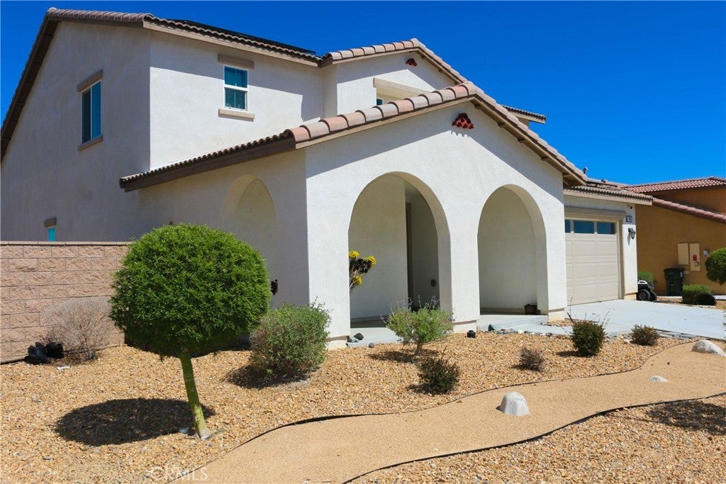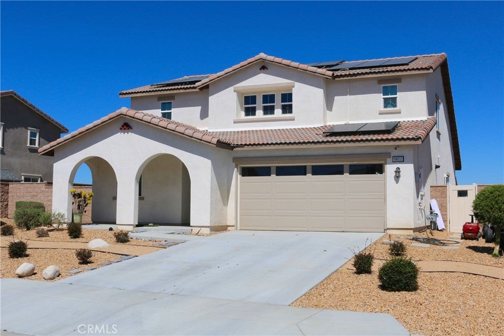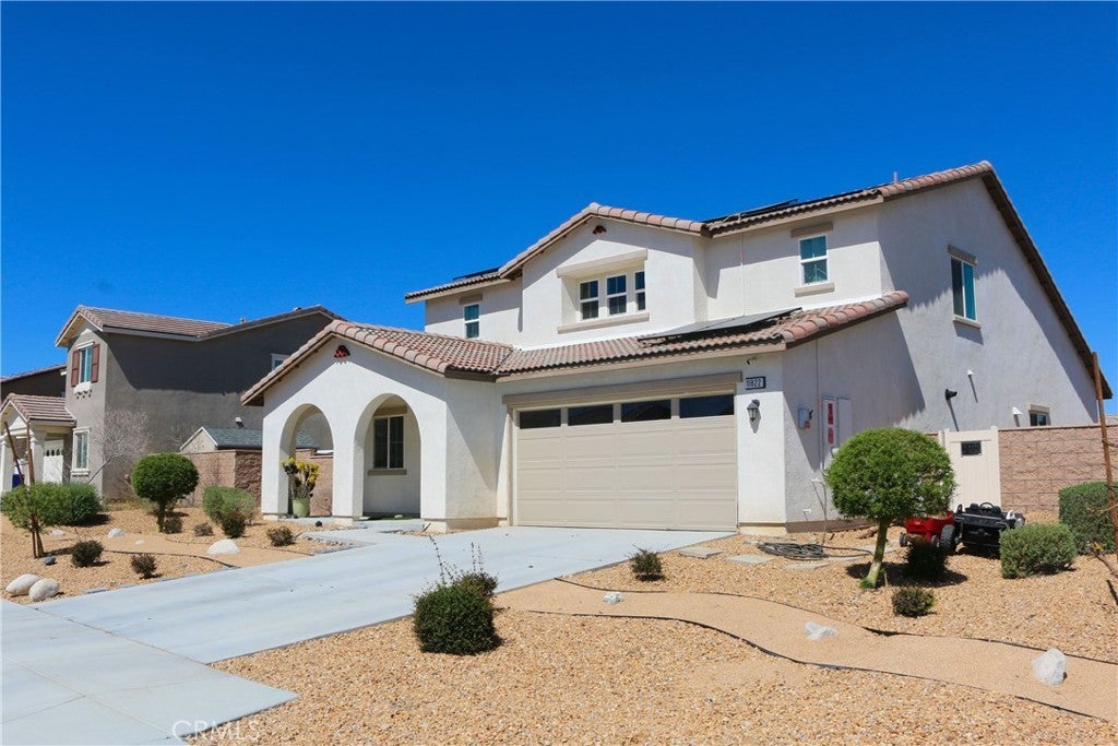 Spacious 4-bedroom, 3-bathroom two-story home in Victorville, located within the highly sought-after Snowline Joint Unified School District. This home features a functional and hard-to-find layout with a primary suite downstairs, plus an additional bedroom and full bath—ideal for multi-generational living, guests, or flexible use. Upstairs offers three additional bedrooms along with a versatile loft, perfect for a second living space, home office, or playroom. The open-concept kitchen and living area offers ample cabinetry, generous counter space, and abundant natural light—creating a comfortable space for both everyday living and entertaining. Built in 2020 by D.R. Horton, this newer construction includes modern design, central HVAC, and an attached 2-car garage. A solar system is already in place with a hybrid setup (partially paid off and partially leased), offering potential energy savings. The exterior features low-maintenance desert landscaping, a welcoming covered entry, and a clean, well-kept streetscape that enhances curb appeal. The interior shows normal everyday use, with minor cosmetic updates to paint and flooring presenting an opportunity for a buyer to personalize and add value over time. A strong combination of layout, size, and value in this price range.
