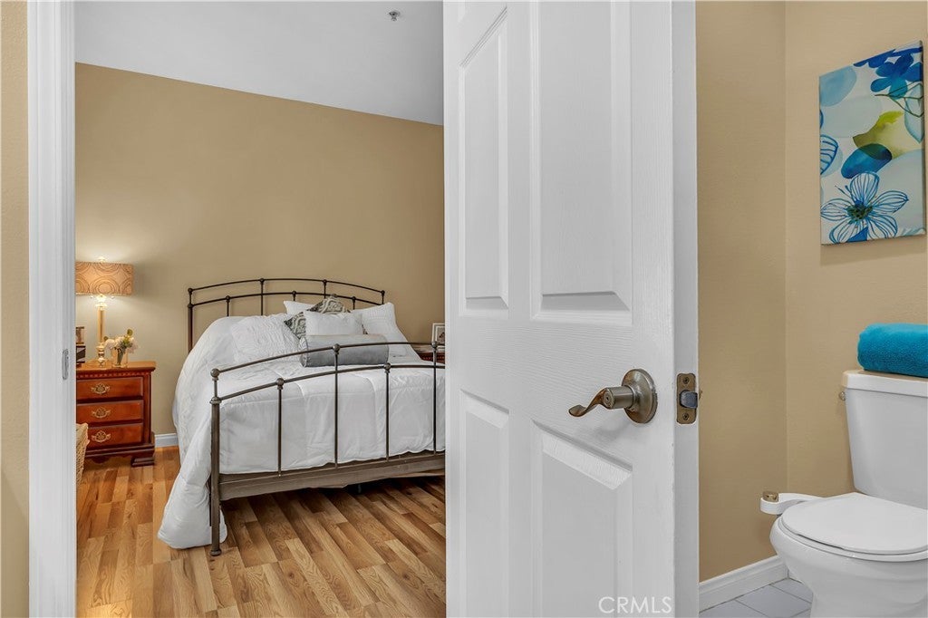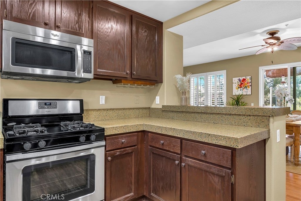 Welcome to this inviting Ground Level with No Stairs, two-bedroom, two-bathroom home in the beautiful California Court community of Mission Viejo. This charming residence offers comfort, style, and convenience in one desirable package. Relax on your private patio with a view, perfect for morning coffee or evening unwinding. Inside, the open-concept living area features high ceilings and a cozy fireplace, creating a bright and welcoming atmosphere. The tastefully updated kitchen showcases quartz countertops, recessed lighting, a convenient breakfast bar, rich espresso cabinetry, and stainless steel appliances included with the home. Additional highlights include newer Low-E double-pane windows and sliding door, laminate flooring, and elegant wood shutters throughout. The spacious primary suite features an en-suite bathroom with a glass-enclosed soaking tub. A lovely second bedroom or office and an additional full bathroom are located just down the hall. Enjoy the convenience of a direct-access garage with a laundry area, complete with front-loading washer and dryer included. Residents of California Court enjoy access to community amenities including a sparkling pool and spa, tot lot playground, and BBQ area. HOA membership also includes access to Mission Viejo Lake, offering a private beach, boating, summer concerts, and fireworks. Ideally located just minutes from shopping, dining, theaters, and the 241 Toll Road, this home offers the perfect blend of lifestyle and location.