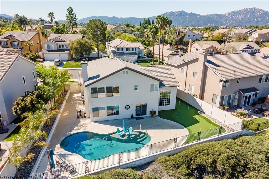 Perched high above Vail Ranch Park, this exceptional pool home offers one of Temecula’s most sought-after panoramic “forever” views—with no rooftop obstructions and no noisy streets behind. Both levels of the home and the entire backyard enjoy sweeping vistas of the valley, city lights, rolling hills, and iconic peaks including Mount San Jacinto, San Gorgonio Mountain, Mount Baldy, and the San Bernardino Mountains, plus hot air balloons and snow-capped mountains in winter. The private backyard is an entertainer’s dream featuring a completely remodeled pebble-finish heated pool with Baja shelf, expansive patio, and a 6-hole putting green. Inside offers an open floorplan with gracious rooms, soaring ceilings, 4 bedrooms plus optional 5th/bonus room, 3 baths, including a main-floor bedroom and bath, primary suite has an enormous walk-in closet, dual sinks, water closet, separate shower and soaking tub with dreamy views and a 3-car direct-access garage with storage racks. Extensively upgraded within the past 4.5 years: professional interior/exterior paint, LVP flooring, luxurious carpet, baseboards, custom window coverings, shutters, LED lighting, remote control ceiling fans, refreshed cabinetry with new paint & hardware, and more. Additional highlights include vinyl fencing, front courtyard with pavers and stucco wall, new landscape, new pool heater, newer water heater with recirculating pump, and 220V prewire for future spa. Quiet location near Redhawk Golf Club, Butterfield Ranch Shopping Center, and top-rated Temecula Valley schools including Great Oak High. A rare opportunity to own a truly unobstructed view property with NO HOA, low property tax rate and NO Mello-Roos.