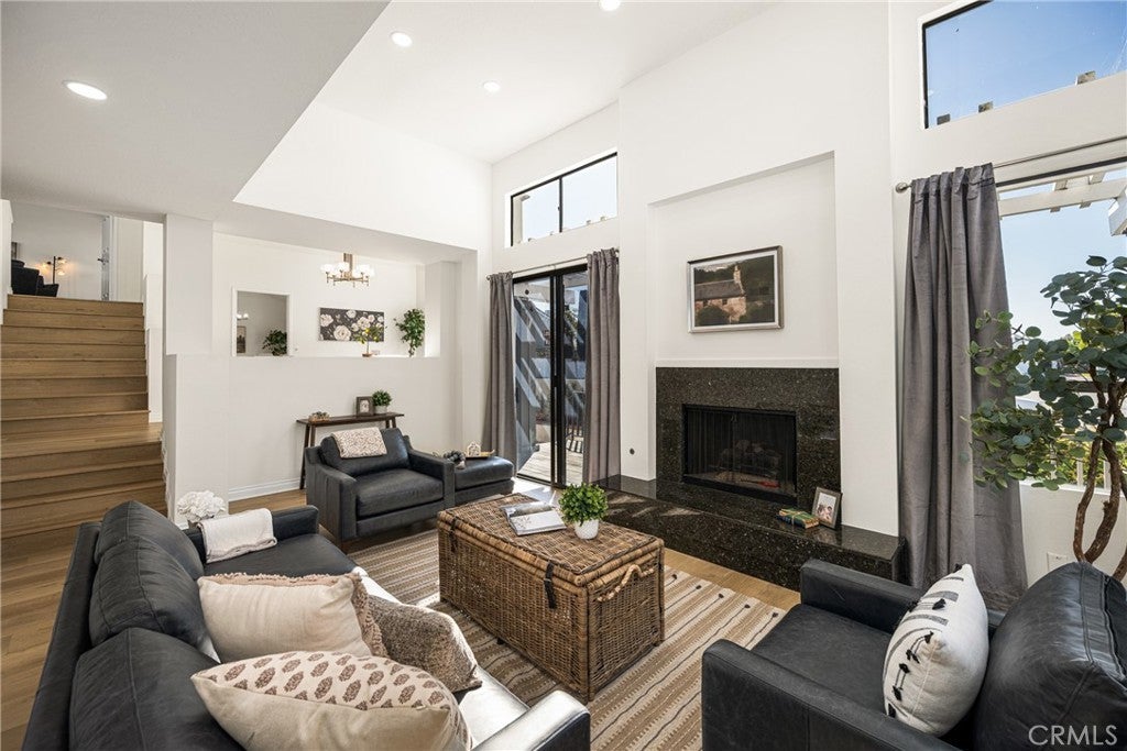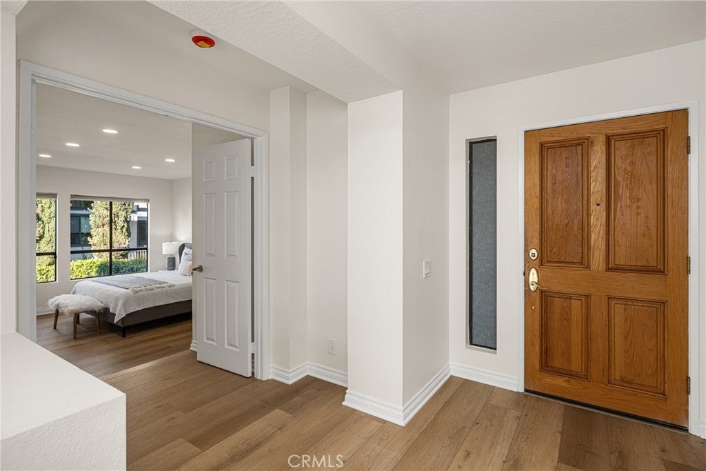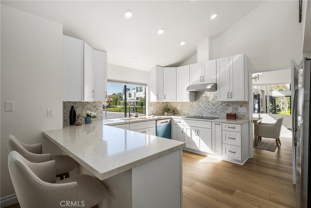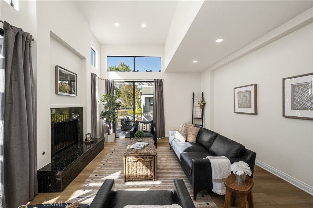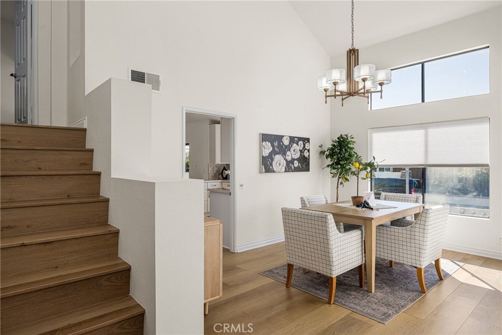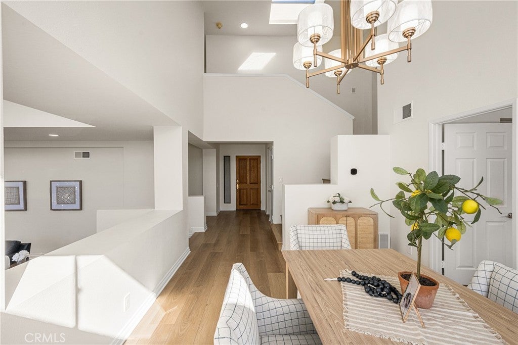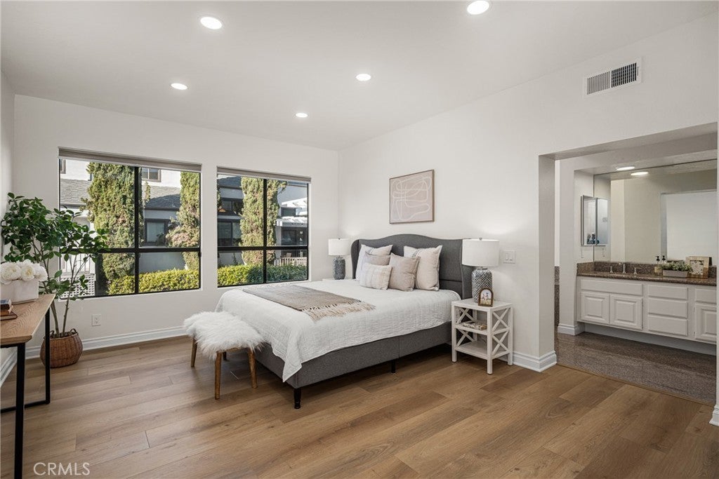 Beautifully updated home in Irvine’s highly desirable Woodbridge community, offering a spacious freshly painted multi-level layout with excellent separation of living spaces. This 4-bedroom, 3-bath residence features a highly sought-after DOWNSTAIRS PRIMARY SUITE, with three secondary bedrooms upstairs, ideal for privacy and flexible living. Luxury vinyl plank flooring with upgraded baseboards runs throughout with no carpet, creating a clean, cohesive look. The living room and family room each feature a fireplace, while soaring ceilings and expansive windows bring in abundant natural light. The multi-level design adds architectural interest and openness, while still providing defined spaces for everyday living and entertaining. A new HVAC unit has just been installed. The kitchen features a breakfast counter-bar, white shaker cabinetry, quartz countertops, a contrasting full backsplash, and brand new stainless steel appliances. It opens to the dining room and living area and offers ample cabinetry, counter space, and storage. An upper-level family room provides flexible use as a home office, media space, or additional lounge area. Upstairs also includes three well-proportioned bedrooms, a bathroom with dual vanities and granite countertops, and a convenient laundry closet. The downstairs primary suite offers a private setting with generous space, large windows, and an en-suite bathroom featuring dual vanities, and a soaking tub. Outdoor space includes a private deck with lagoon views and a patio cover, providing a comfortable area to relax or entertain. Additional features include a direct-access 2-car garage and good storage throughout. Woodbridge residents enjoy access to two lakes, beach lagoons, pools, parks, tennis and pickleball courts, volleyball courts, and scenic walking trails. The home is conveniently located near Meadow Park Elementary, South Lake Middle School, and Woodbridge High School, all within the Irvine Unified School District. Nearby shopping and dining options include Woodbridge Village Center and Alton Square, offering restaurants, a movie theater, and everyday conveniences. Low tax rate and NO MELLO-ROOS.