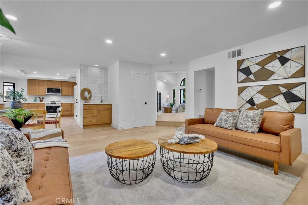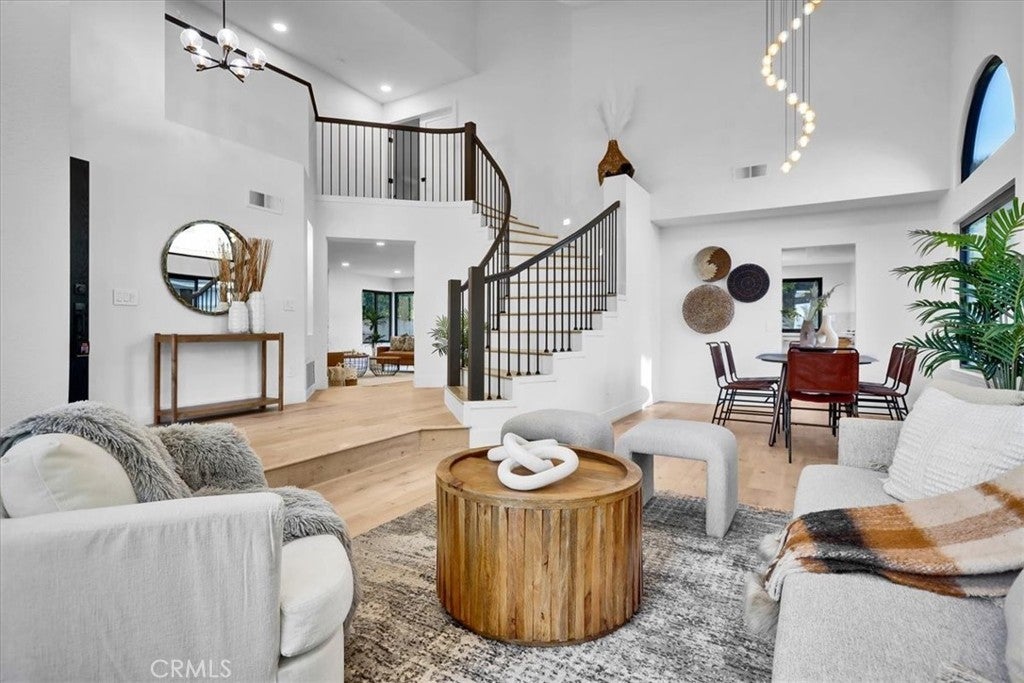 Situated on a spacious lot within a quiet cul-de-sac, this thoughtfully updated residence blends elevated curb appeal with cohesive design. Slightly set above street level, the home makes a strong first impression with a brick-accented driveway and walkway that complement the Spanish tile roof and freshly painted white exterior with contrasting black trim. Manicured landscaping, turf areas, and two usable side yards frame the property, while a prepaid solar lease through 2030 adds long-term efficiency. Double entry doors open to soaring ceilings and a spiral staircase that immediately establish scale. Light wood flooring and recessed lighting unify the main living spaces, where a formal living and dining area sit just off the entry, anchored by a statement chandelier and an open, connected layout. The fully remodeled kitchen flows naturally into a breakfast nook and a secondary living room featuring a fireplace and wet bar. New windows throughout invite abundant natural light, and sliding doors extend the living space outdoors. A half bathroom with a smart toilet and a dedicated laundry room with direct garage access complete the main level. Upstairs, the expansive primary suite offers a true retreat with dual closets and a generously sized en-suite bathroom featuring dual vanities and an oversized walk-in shower with an integrated soaking tub. Three additional well-proportioned bedrooms share a fully updated bathroom. Nearly every interior element has been modernized, from bathrooms and fixtures to windows and smart features, reinforcing the home’s cohesive renovation. An attic space accessed via pull-down ladder provides an additional bonus area for flexible use. Outdoors, the backyard continues the home’s balance of function and lifestyle, centered around a pool and spa. Two side yards add further versatility, while the epoxy-finished garage completes the property’s polished presentation. Designed with both scale and livability in mind, this residence delivers a fully updated interior, purposeful layout, and seamless indoor-outdoor flow in the well-established Walnut neighborhood.
