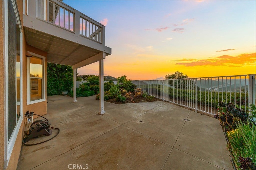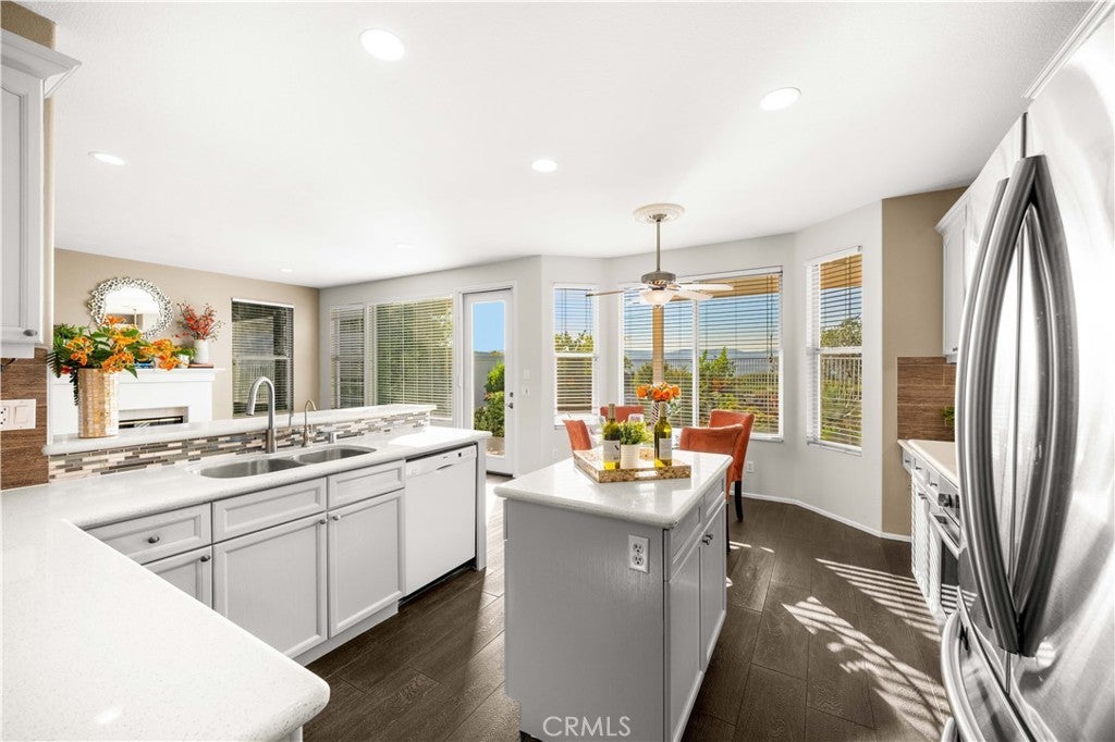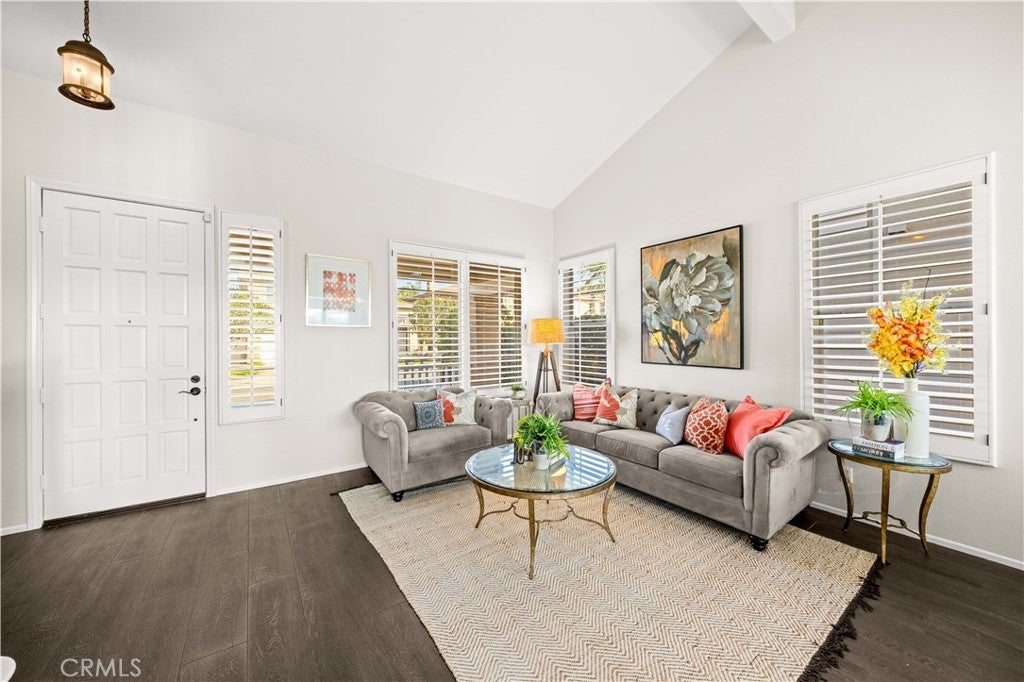 Welcome to 7 Hollyleaf in the Canyon Vistas community of Aliso Viejo. Recently updated with fresh paint and featuring wood-grain porcelain tile flooring throughout, this home offers a spacious, open floor plan. The entry opens into a formal living and dining area defined by two-story ceilings, a central chandelier, and plantation shutters. Toward the back of the home, the kitchen includes a center island with a raised bar, ample cabinetry, and a breakfast nook detailed with a ceiling fan. This space flows directly into the family room, which features a fireplace, LED recessed lighting, bay windows, and a glass door leading outside. A convenient main-floor bedroom and an adjacent full bathroom complete this level. Upstairs, the primary suite is situated to maximize the canyon and city light views. It features a walk-in closet and an en-suite bathroom with dual vanities, a separate oval soaking tub, a bidet, and a glass-enclosed shower. The suite also includes a large retreat area with dimmable recessed lighting, which can easily be converted into a fifth bedroom. The second floor is completed with the remaining two bedrooms, a generously sized secondary bathroom offering dual sinks and a tub/shower enclosed with glass doors and a dedicated laundry room. Transitioning outside, the backyard is thoughtfully designed to capture the property’s expansive canyon, sunset, and city light views, stretching as far as the Saddleback Mountains. The grounds feature low-maintenance xeriscape landscaping, mature citrus trees, and fragrant roses. A newly added second-floor patio deck provides an elevated vantage point to take in the scenery, while motion-sensor floodlights add convenience and security to both the backyard and driveway. Located within an award-winning school district, the home is walking distance to Canyon View Park's playground, sand volleyball courts, and hiking trails. It also provides easy access to Aliso Viejo Town Center, the 73 Toll Road, and Laguna Beach via Route 133.