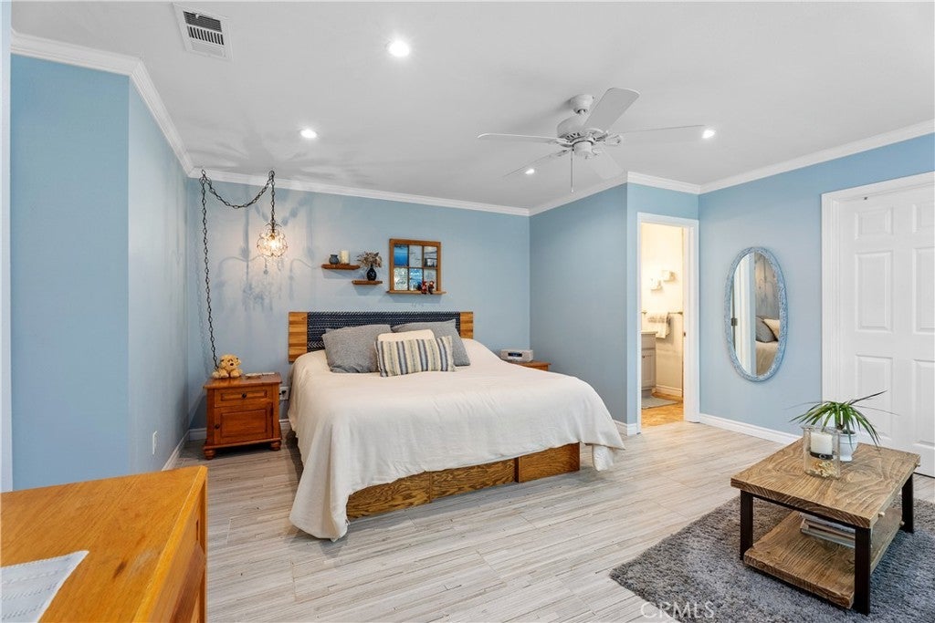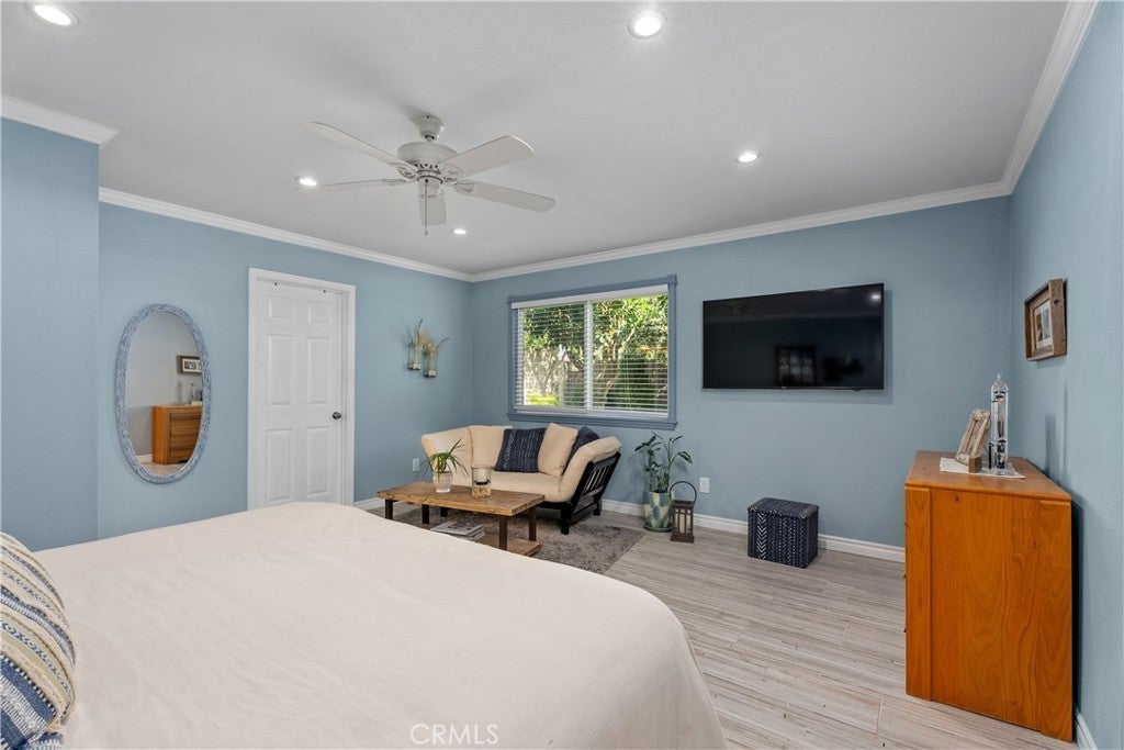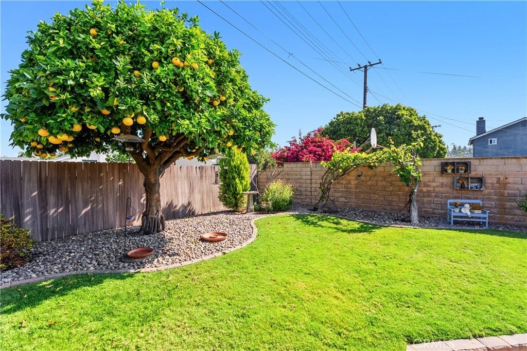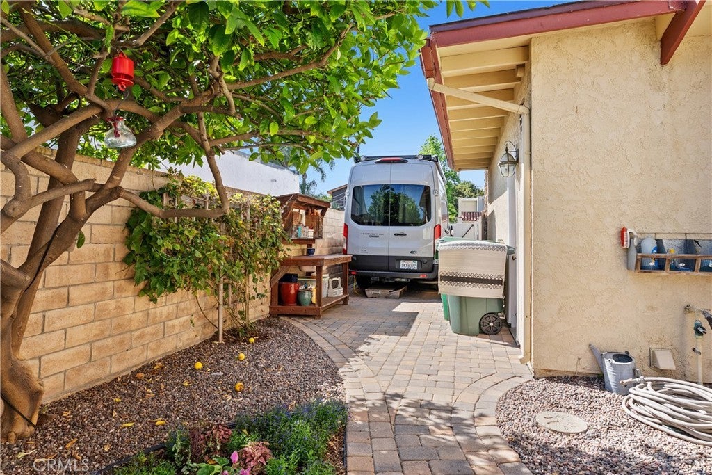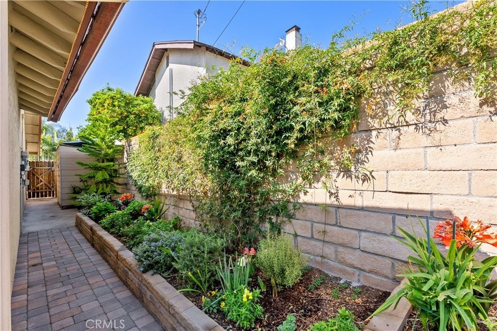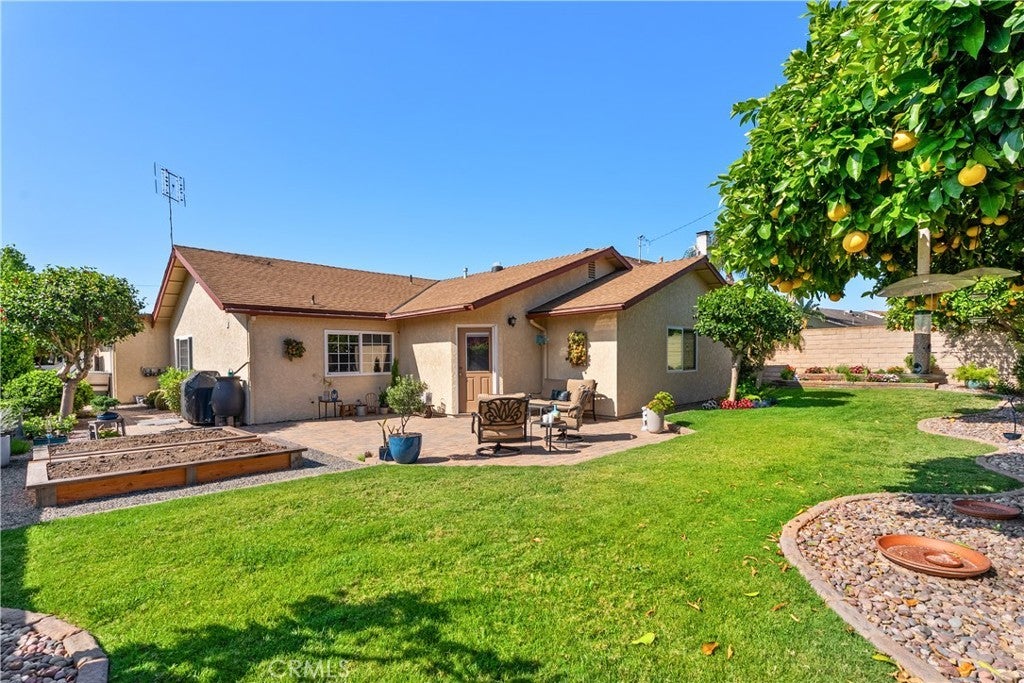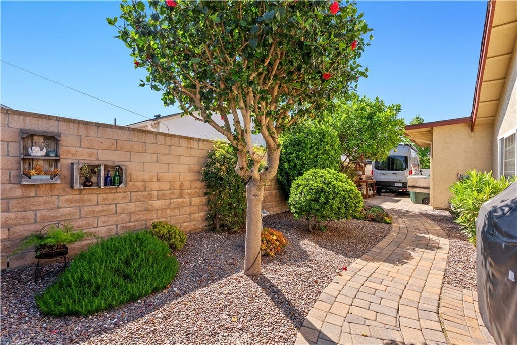 Meticulously maintained single-level, 4-bedroom, 3-bath home. This well-appointed home has been remodeled throughout. Bright, open living room features, porcelain tile, recessed lighting, and crown molding. The kitchen offers plenty of cabinet space, undermount cabinet lighting, Samsung kitchen appliance package, and a stainless steel sink. Entertain in style with a built-in coffee and wine bar complete with a compact wine refrigerator, perfect for hosting friends and family. Spacious primary suite with sitting area, a dual-sink vanity with elegant countertops, and a walk-in tile shower with a generous walk-in closet. All bedrooms are on the main floor, including a main bedroom with mirror closet doors, a private bath with a skylight and a walk-in shower, while two additional bedrooms share a beautifully appointed bathroom with granite countertops and a bathtub. This home is perfect for entertaining family and friends with a thoughtfully designed low-maintenance backyard. Enjoy summer evenings relaxing by a gas fire pit. The drought-tolerant yard is a showcase of color and low-maintenance landscaping, complemented by mature fruit trees and raised garden beds for a touch of charm. Additional highlights include a newer roof, whole-house fan, solar, EV charging port, gated Class B RV/boat parking, and a storage shed with a potting bench. This home is the perfect combination of modern convenience, energy efficiency, and Southern California lifestyle.