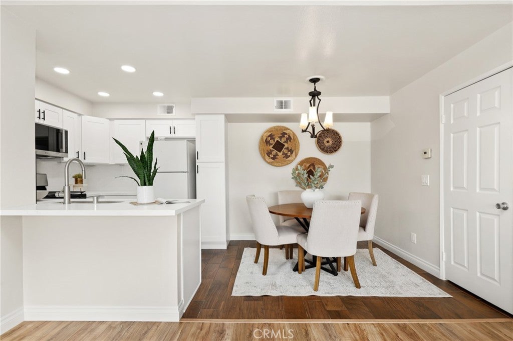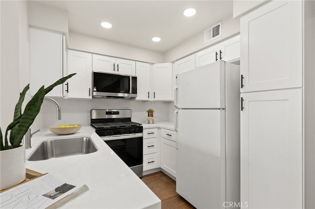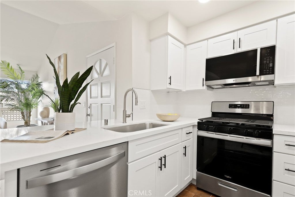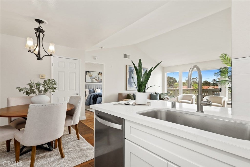 Perched on the top floor in the desirable Harbor Walk community, this beautifully upgraded 1-bedroom, 1-bath residence offers approximately 700 square feet of light-filled living space with a fresh, modern feel throughout. Soaring cathedral ceilings enhance the open layout, while fresh interior paint and updated flooring create a clean, move-in-ready environment. The inviting living room flows seamlessly into a charming dining area and extends to a full-length private balcony —perfect for relaxing or entertaining. The remodeled kitchen is a standout feature, showcasing rich quartz countertops, white cabinetry, and ample workspace for both everyday living and hosting. The serene primary suite features vaulted ceilings, a spacious closet, and a well-appointed en-suite bathroom with quartz surfaces and a mirrored vanity. Additional highlights include an assigned parking spot and guest parking along with access to the community pool. Ideally located just about a mile from the beach, with quick access to the 5 Freeway and surrounded by an abundance of shopping and dining options, this home offers an exceptional blend of comfort, style, and coastal convenience.