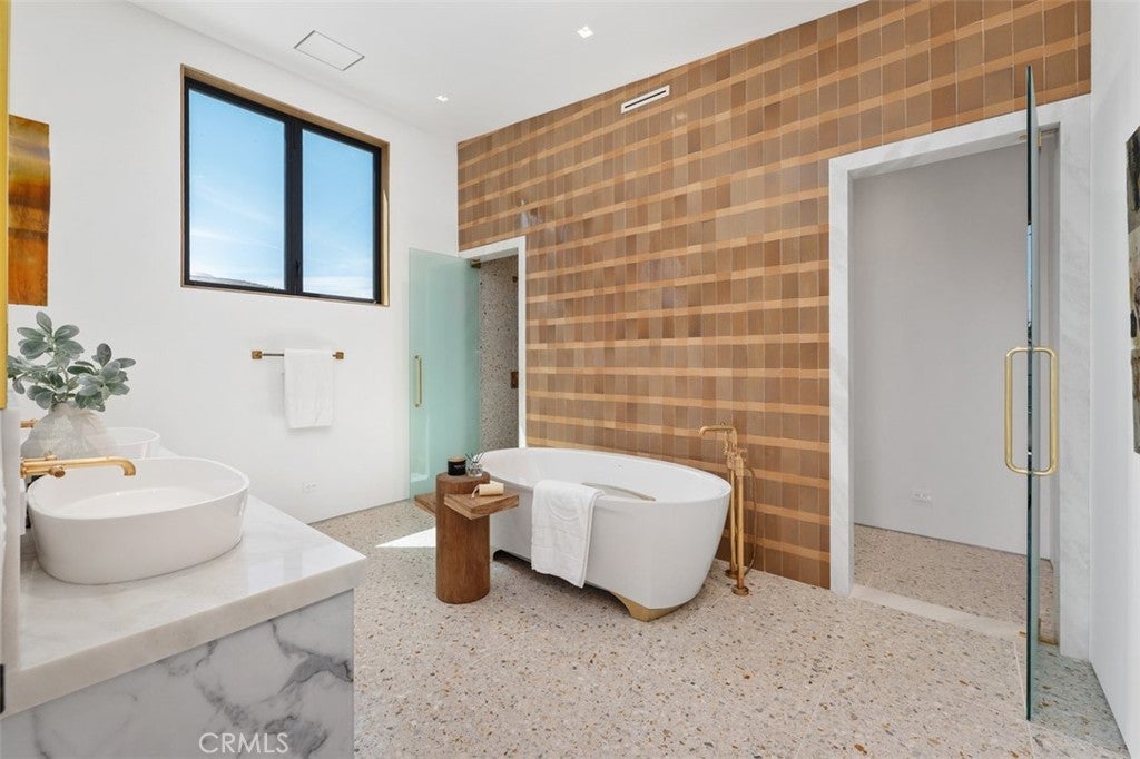 Upper Back Bay meets luxury. This stunning newly built, smart home was thoughtfully designed to bring the elements of the Back Bay indoors while offering modern amenities. Every aspect of its construction and superb design embraces the natural beauty of the Back Bay and honors Native American history. This care is represented in the use of natural materials like wood and stone, earth tones, and shades of green. Each thoughtfully curated detail embraces the beauty of the Back Bay. As you enter the home you are greeted by soaring ceilings, a large open space filled with natural light and serenity. Each detail is intentional, from the custom natural wood beams shaped like an arrow pointing to where the sun sets in the home; to the Terrazzo flooring with seashell specs.The open concept design allows for effortless indoor/outdoor living. The gourmet kitchen, a central part of the home boasts custom walnut cabinetry, a beautiful, oversized island with a bespoke Italian marble countertop in perfect shades of green, and Hestan appliances. The spacious dining area has a built in Miele coffee station and a built-in wine cooler for added convenience. The grand room features a bespoke fireplace with automated sliding door for seamless indoor-outdoor living. The main level includes 3 bedrooms with en-suites plus a guest bathroom, all finished with custom cabinetry, lighting, and Italian marble/ tile. A beautiful oak wood staircase with custom, handrails hand wrapped in luxurious, tan leather leads to the second level. Upstairs offers two spacious primary suites, walk in closets with one fit for a true fashionista, equipped with a laundry chute; expansive en-suites with luxury details including brass fixtures, handmade Italian tile/marble, soaking tub, steam shower. The multiple outdoor spaces can be accessed effortlessly. The focal point is the pool with a Zen waterfall. Adjacent to the pool you will find a built-in seating area with an outdoor fireplace, outdoor shower, and an entertainer's dream outdoor kitchen. Additional design features include a sound system, a three-car garage with epoxy flooring, a security system, and all windows and sliding doors are prewired for retractable shades. This spectacular home situated in an oversized corner lot is a short walk to the Upper Back Bay where you can enjoy hike/walk trails, cycling and a short distance to world renowned shopping and dining. This is not just a home but a sanctuary where nature is reveled and embraced.