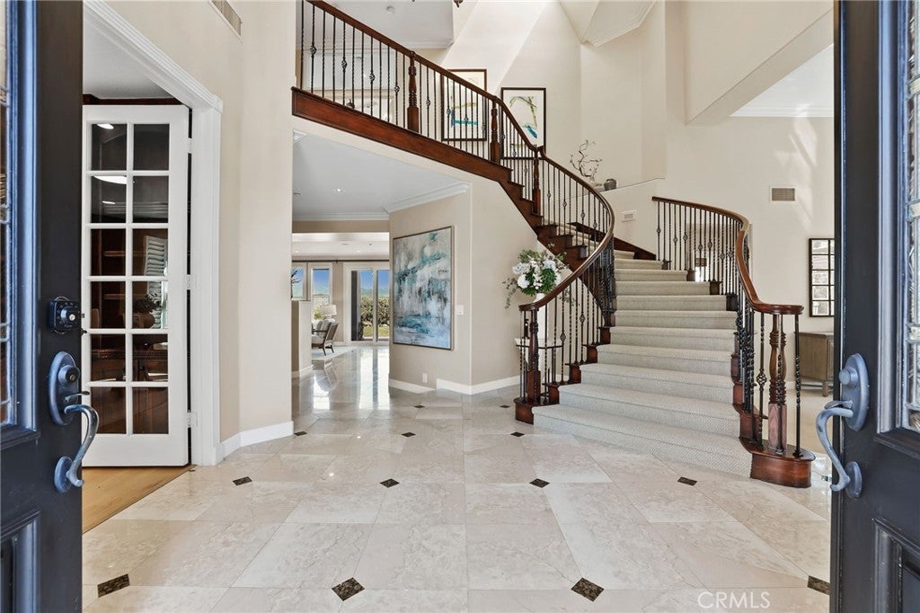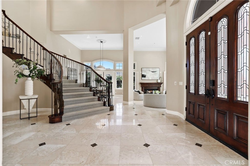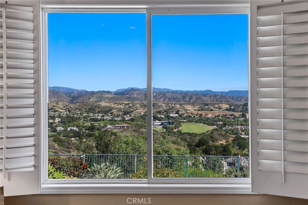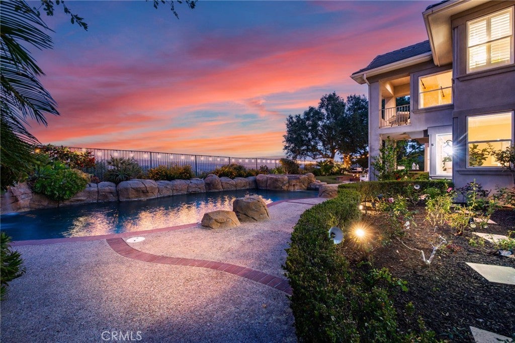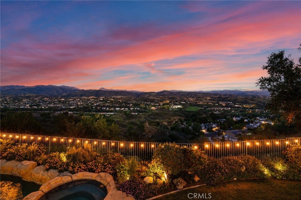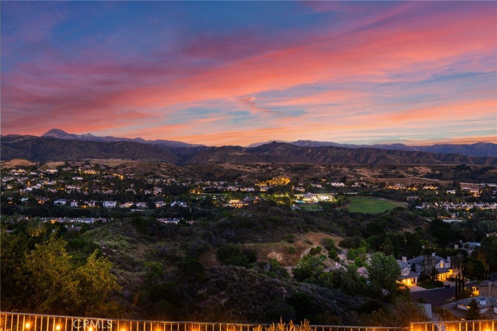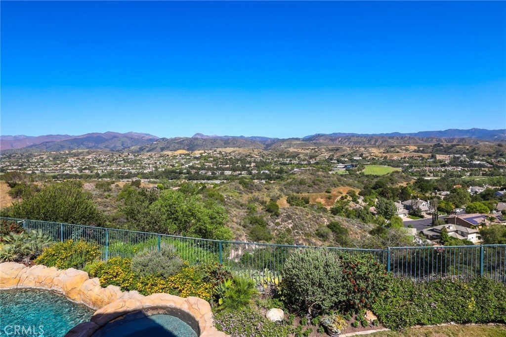 A panoramic masterpiece positioned near the highest elevations of the prestigious guard-gated community of Coto de Caza. Located toward the end of a quiet single-loaded street, this home offers exceptional privacy along with sweeping views of the golf course, rolling hills, and surrounding mountains. Recent improvements include a brand new roof, oakwood-color engineered flooring throughout both levels, a new pool pump, and fresh interior paint, creating a bright, cohesive, and updated interior. Interior features include rich wood detailing, plantation shutters, and stone flooring. The home is also equipped with a whole house water filtration system and soft water system. Spanning approximately 5,000 square feet on an expansive 0.45-acre lot, this home offers 6 bedrooms, 5 bathrooms, plus a dedicated office, thoughtfully designed for both functionality and comfort. Enter through double doors into a grand foyer with soaring ceilings and a skylight that fills the space with natural light. The living and dining areas are seamlessly connected, while expansive windows frame lush greenery and scenic views. The main level includes a private executive office with built-ins and a guest suite with ensuite bath, ideally positioned with views of the backyard garden, pool, and mountains, along with convenient access to the outdoor space. The chef’s gourmet kitchen is equipped with stainless steel appliances, a 6-burner Viking Professional gas range, microwave, warming oven, center island, beverage refrigerator, and abundant cabinetry. A walk-in pantry has been converted into a wine storage area with custom wooden racks and a wrought iron door. Upstairs, the expansive primary suite offers panoramic views of the Coto de Caza Valley, a double-sided fireplace, and a spa-inspired bathroom with dual vanities, vanity area, and a large walk-in closet. Four additional bedrooms provide flexibility for guest rooms, bonus room, gym, or office. Step outside into an entertainer’s dream backyard featuring a pool and spa, BBQ island with counter seating, fire pit, lawn area, and multiple patio spaces. Surrounded by blooming flowers and mature landscaping, the garden creates a peaceful setting with unobstructed mountain and valley views. Offering a rare blend of space, privacy, and breathtaking views, this home presents an exceptional opportunity to experience the finest of Coto de Caza living.