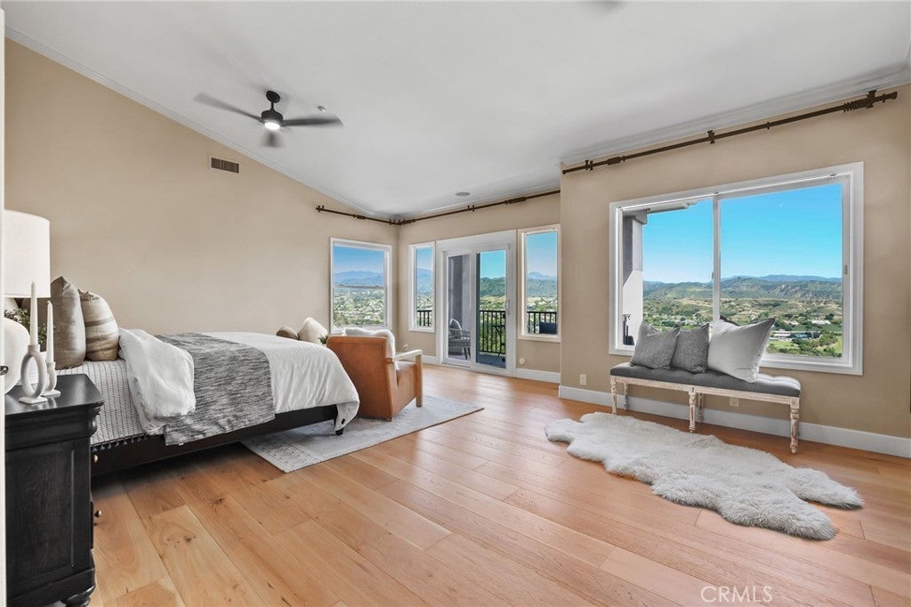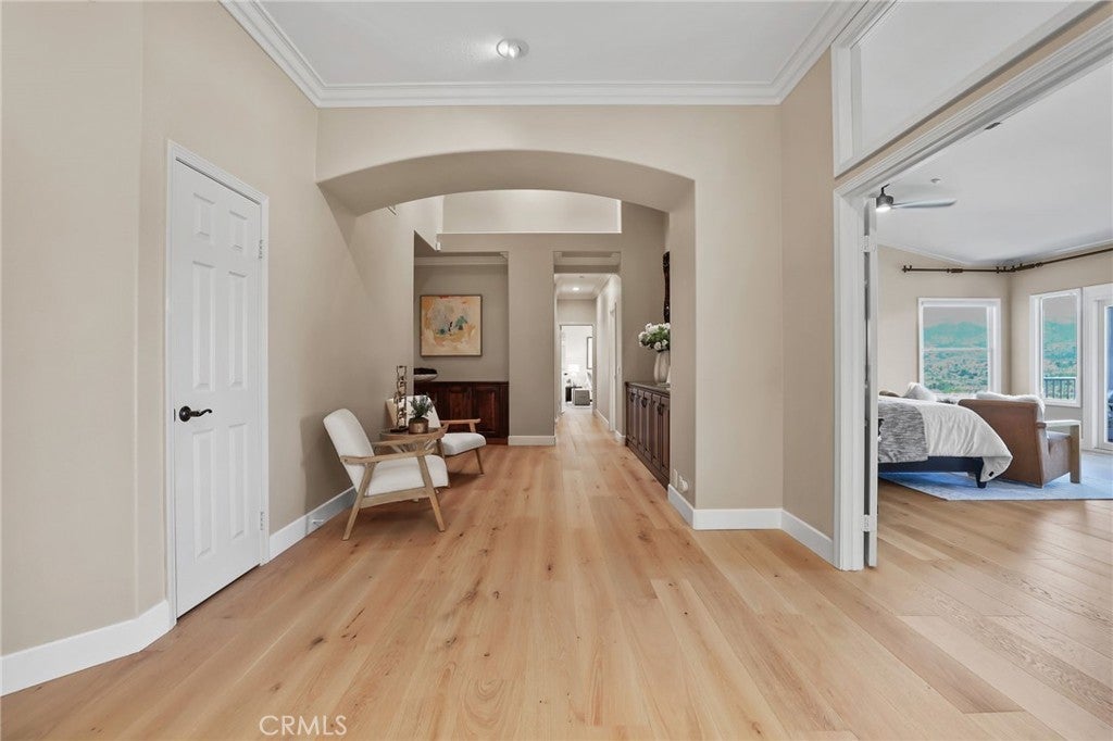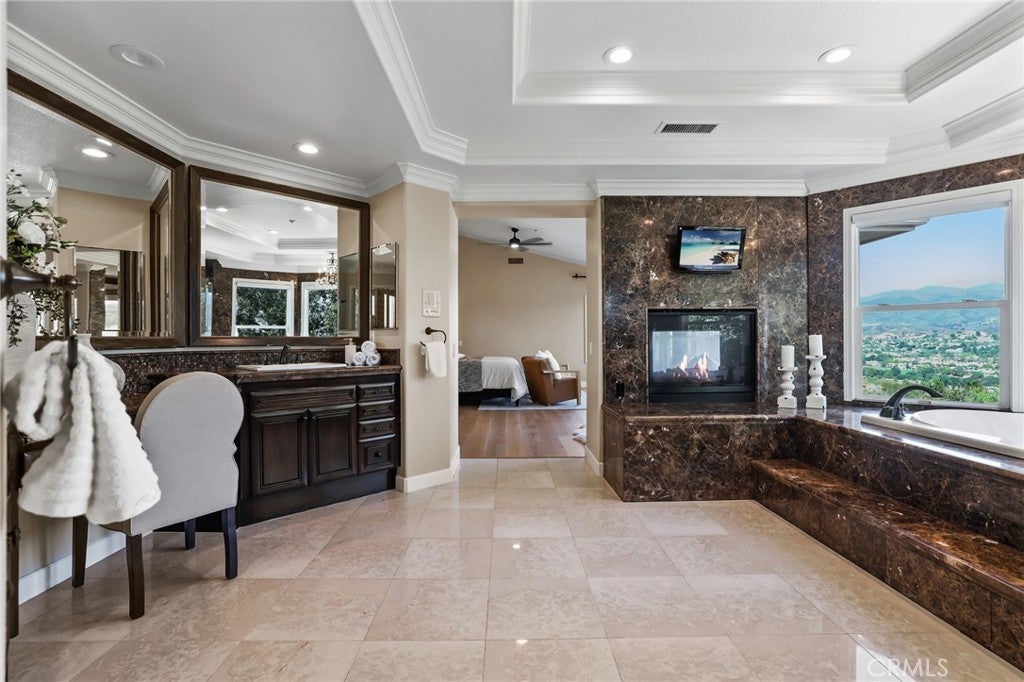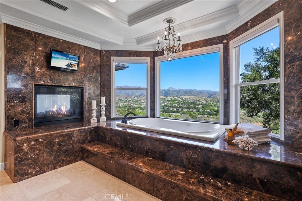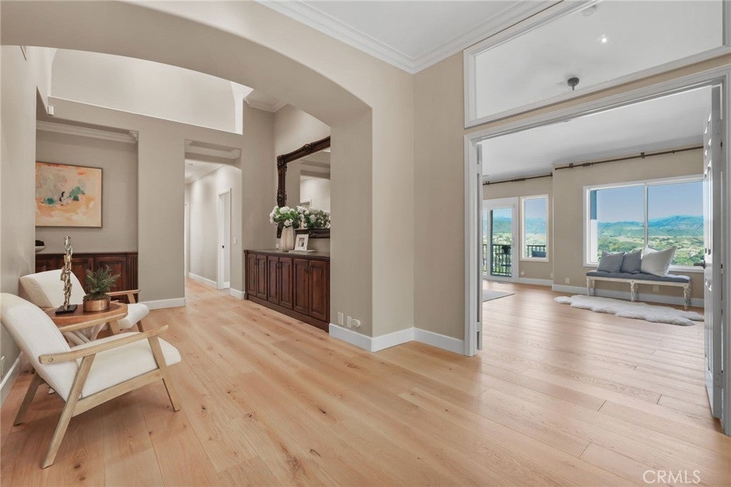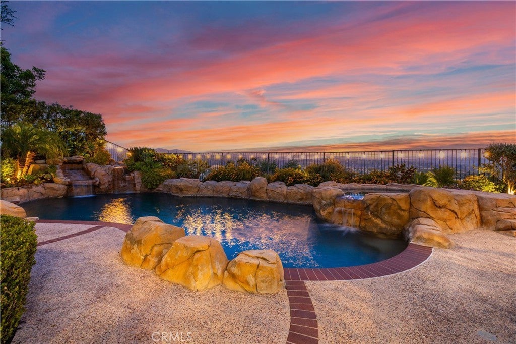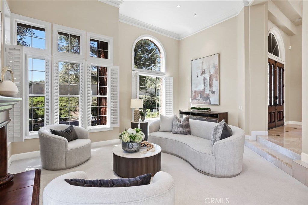A panoramic masterpiece positioned near the highest elevations of the prestigious guard-gated community of Coto de Caza. Located toward the end of a quiet single-loaded street, this home offers exceptional privacy along with sweeping views of the golf course, rolling hills, and surrounding mountains. Recent improvements include a brand new roof, oakwood-color engineered flooring throughout both levels, a new pool pump, and fresh interior paint, creating a bright, cohesive, and updated interior. Interior features include rich wood detailing, plantation shutters, and stone flooring. The home is also equipped with a whole house water filtration system and soft water system. Spanning approximately 5,000 square feet on an expansive 0.45-acre lot, this home offers 6 bedrooms, 5 bathrooms, plus a dedicated office, thoughtfully designed for both functionality and comfort. Enter through double doors into a grand foyer with soaring ceilings and a skylight that fills the space with natural light. The living and dining areas are seamlessly connected, while expansive windows frame lush greenery and scenic views. The main level includes a private executive office with built-ins and a guest suite with ensuite bath, ideally positioned with views of the backyard garden, pool, and mountains, along with convenient access to the outdoor space. The chef’s gourmet kitchen is equipped with stainless steel appliances, a 6-burner Viking Professional gas range, microwave, warming oven, center island, beverage refrigerator, and abundant cabinetry. A walk-in pantry has been converted into a wine storage area with custom wooden racks and a wrought iron door. Upstairs, the expansive primary suite offers panoramic views of the Coto de Caza Valley, a double-sided fireplace, and a spa-inspired bathroom with dual vanities, vanity area, and a large walk-in closet. Four additional bedrooms provide flexibility for guest rooms, bonus room, gym, or office. Step outside into an entertainer’s dream backyard featuring a pool and spa, BBQ island with counter seating, fire pit, lawn area, and multiple patio spaces. Surrounded by blooming flowers and mature landscaping, the garden creates a peaceful setting with unobstructed mountain and valley views. Offering a rare blend of space, privacy, and breathtaking views, this home presents an exceptional opportunity to experience the finest of Coto de Caza living.