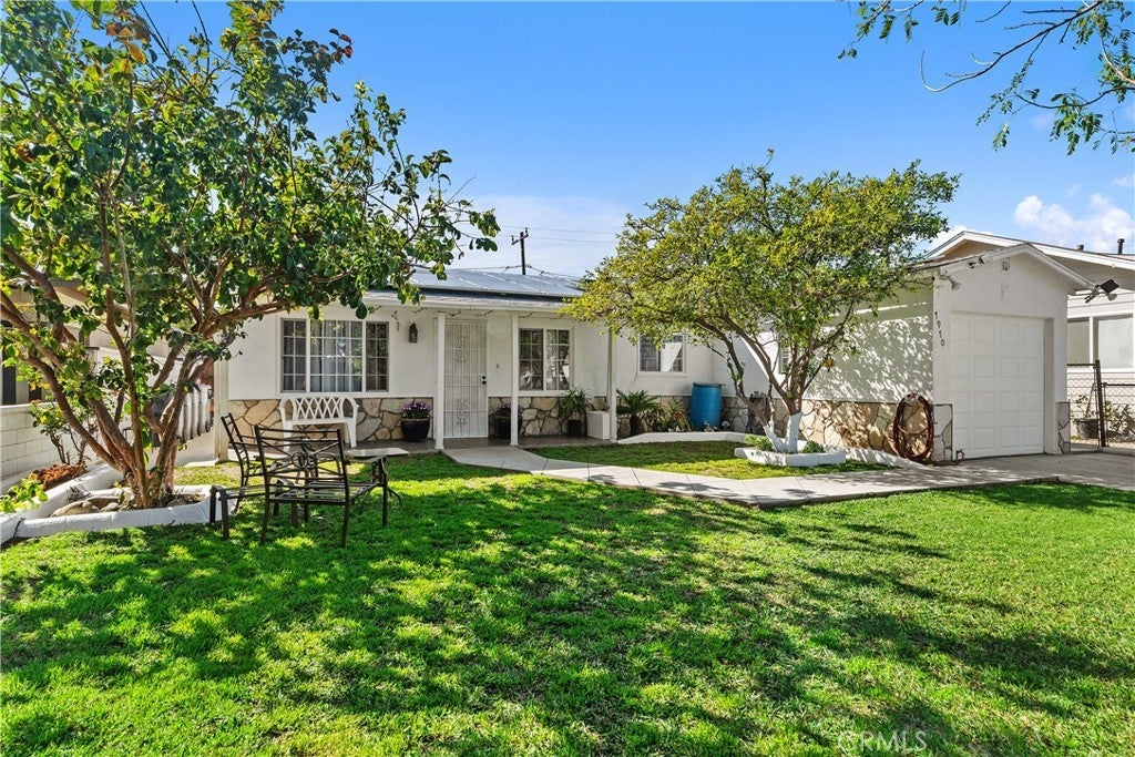 Charming single-story home featuring 3 bedrooms and 1 bathroom, perfect for comfortable living. This inviting residence boasts an open floor plan that seamlessly connects the living, dining, and kitchen areas, creating a bright and spacious atmosphere ideal for both relaxing and entertaining. Enjoy enhanced efficiency with installed solar panels, providing clean, renewable energy while helping reduce your monthly utility costs. Step outside to your private backyard oasis complete with a refreshing pool, complemented by two cover patio that provide shaded spaces for lounging or entertaining. The home also includes a water softener system for enhanced water quality throughout. The beautifully landscaped front yard enhances curb appeal and provides a welcoming first impression. A wonderful opportunity to own a cozy yet functional home with great indoor-outdoor living.
