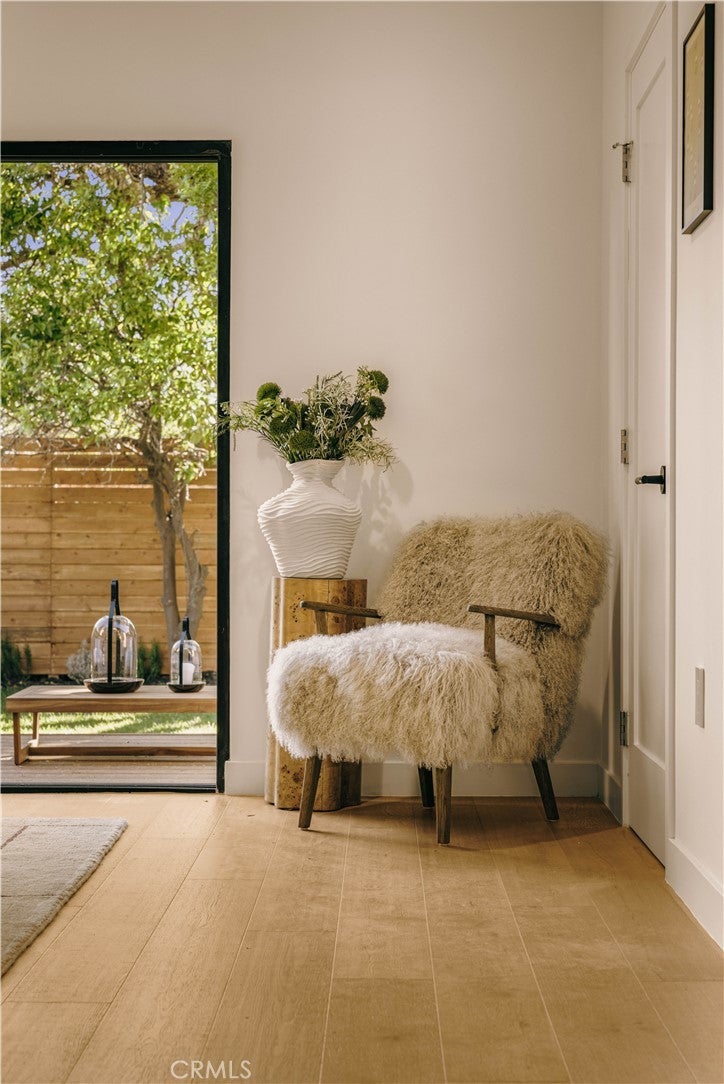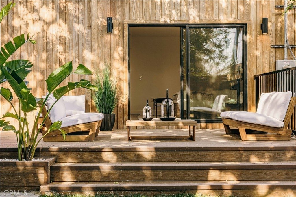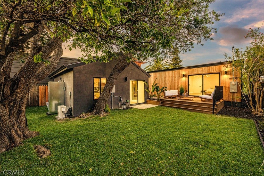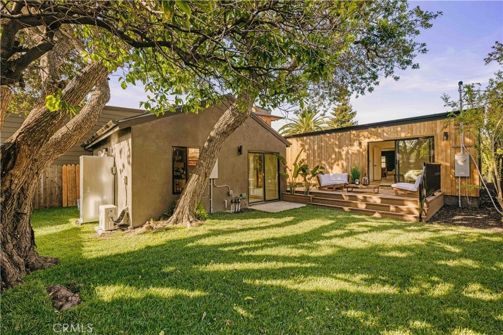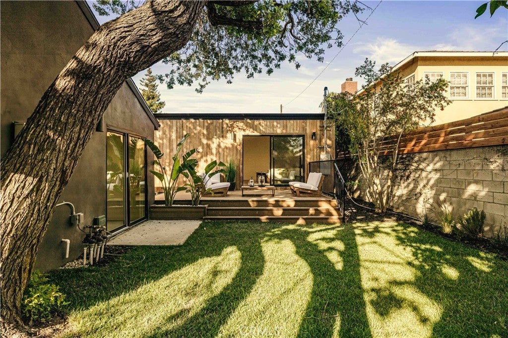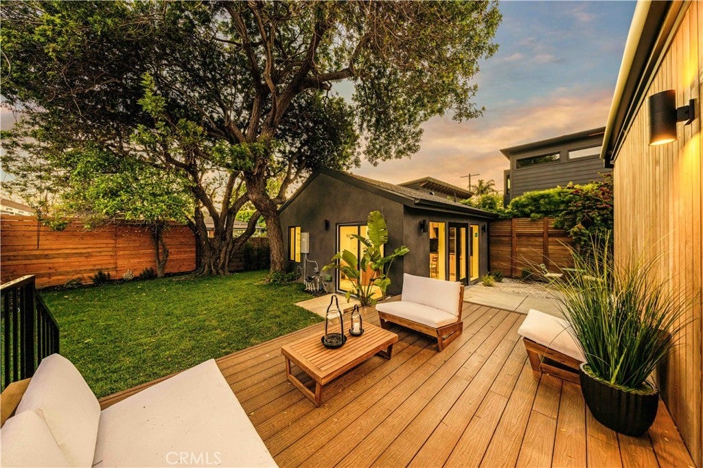Privately tucked behind a fully fenced and hedged perimeter on a quiet, tree-lined street, this single-level Scandinavian-inspired residence is a masterclass in modern organic design. Thoughtfully reimagined with elevated finishes throughout, the open-concept floor plan is grounded by wide-plank white oak floors, soft neutral tones, and curated industrial lighting that create a warm yet sophisticated atmosphere. At the heart of the home, the chef’s kitchen is a true textural showpiece, featuring rift-sawn white oak cabinetry, honed dark countertops, sleek black appliances, and a striking black Zellige tile backsplash. The living and dining spaces flow effortlessly, anchored by an earthy olive-green accent wall, custom built-ins, and a dramatic Calacatta fireplace that serves as the focal point of the space. Two well-appointed guest bedrooms share a beautifully designed bathroom finished with white Zellige tile, chic textured wallpaper, and elegant gold fixtures. Privately positioned at the rear of the home, the primary suite offers a tranquil retreat complete with a walk-in closet and a spa-inspired bath featuring warm natural finishes and an oversized walk-in shower. The main residence offers 3 bedrooms and 2 bathrooms. Step outside to an expansive wood deck and a lushly landscaped backyard designed for effortless indoor-outdoor living. Two majestic mature trees provide abundant shade, natural cooling breezes, and an exceptional sense of privacy, creating the perfect setting for al fresco dining, entertaining, or peaceful relaxation. Beyond the backyard sits a beautifully finished 355 SF detached ADU, thoughtfully designed to mirror the main residence’s elevated aesthetic, complete with a matching kitchenette, full bath, and private laundry. With a total of 1,837 SF of living space, this versatile property is ideal for guests, a private office, creative studio, or additional rental income. Perfectly located just moments from Bluey’s, Rockenwagner, and Pitfire Pizza, with convenient access to the beach and the Westside’s best dining and lifestyle amenities, this is a rare opportunity to own a design-forward, low-maintenance home that is truly move-in ready.