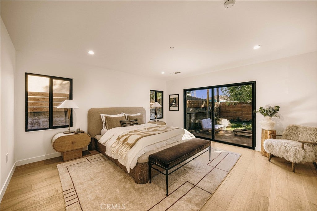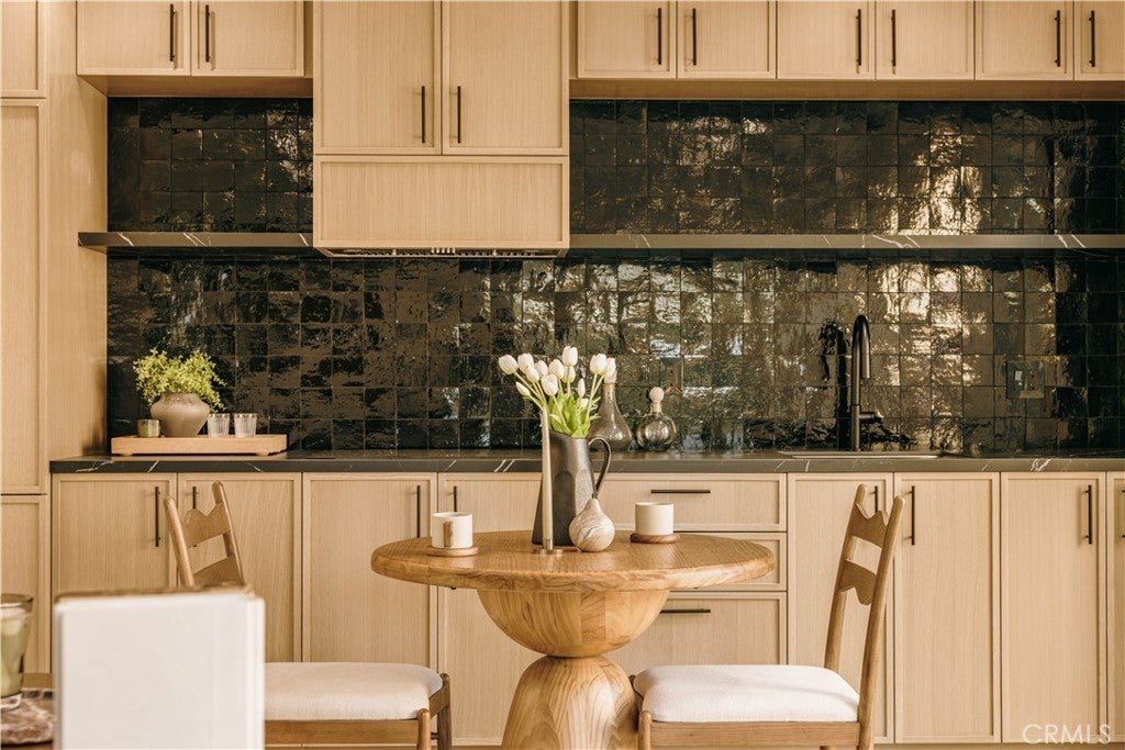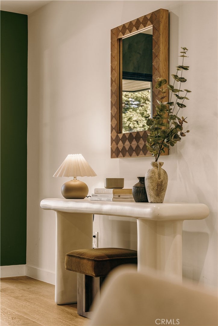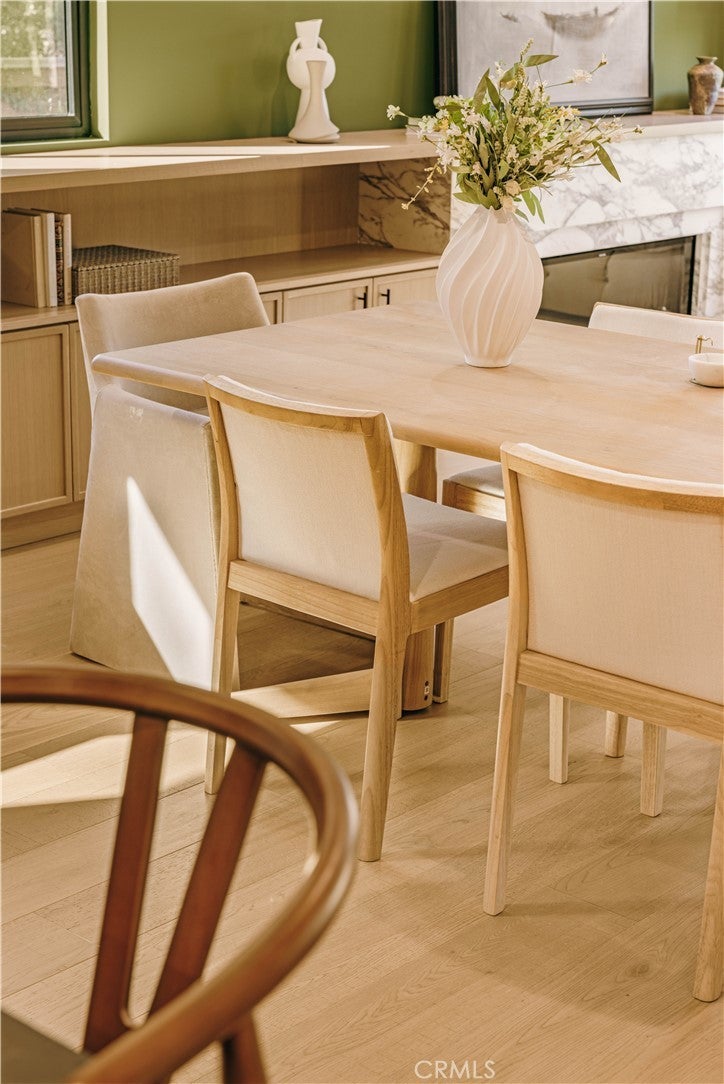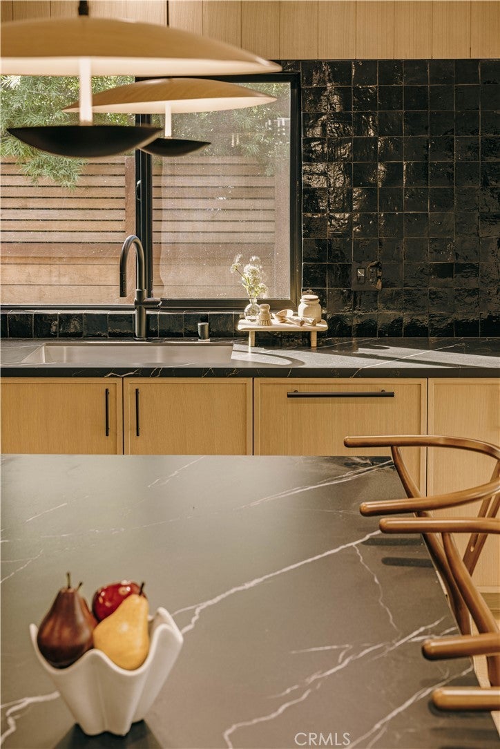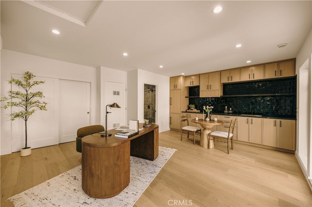 Privately tucked behind a fully fenced and hedged perimeter on a quiet, tree-lined street, this single-level Scandinavian-inspired residence is a masterclass in modern organic design. Thoughtfully reimagined with elevated finishes throughout, the open-concept floor plan is grounded by wide-plank white oak floors, soft neutral tones, and curated industrial lighting that create a warm yet sophisticated atmosphere. At the heart of the home, the chef’s kitchen is a true textural showpiece, featuring rift-sawn white oak cabinetry, honed dark countertops, sleek black appliances, and a striking black Zellige tile backsplash. The living and dining spaces flow effortlessly, anchored by an earthy olive-green accent wall, custom built-ins, and a dramatic Calacatta fireplace that serves as the focal point of the space. Two well-appointed guest bedrooms share a beautifully designed bathroom finished with white Zellige tile, chic textured wallpaper, and elegant gold fixtures. Privately positioned at the rear of the home, the primary suite offers a tranquil retreat complete with a walk-in closet and a spa-inspired bath featuring warm natural finishes and an oversized walk-in shower. The main residence offers 3 bedrooms and 2 bathrooms. Step outside to an expansive wood deck and a lushly landscaped backyard designed for effortless indoor-outdoor living. Two majestic mature trees provide abundant shade, natural cooling breezes, and an exceptional sense of privacy, creating the perfect setting for al fresco dining, entertaining, or peaceful relaxation. Beyond the backyard sits a beautifully finished 355 SF detached ADU, thoughtfully designed to mirror the main residence’s elevated aesthetic, complete with a matching kitchenette, full bath, and private laundry. With a total of 1,837 SF of living space, this versatile property is ideal for guests, a private office, creative studio, or additional rental income. Perfectly located just moments from Bluey’s, Rockenwagner, and Pitfire Pizza, with convenient access to the beach and the Westside’s best dining and lifestyle amenities, this is a rare opportunity to own a design-forward, low-maintenance home that is truly move-in ready.