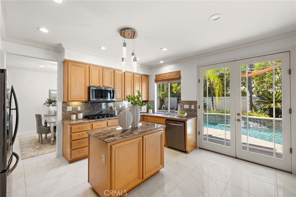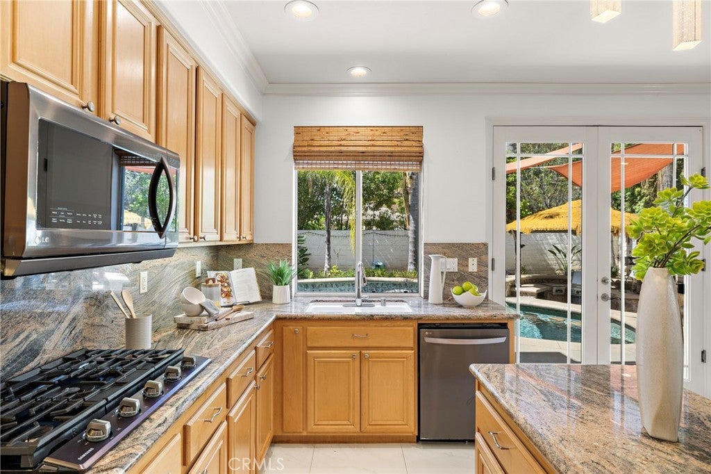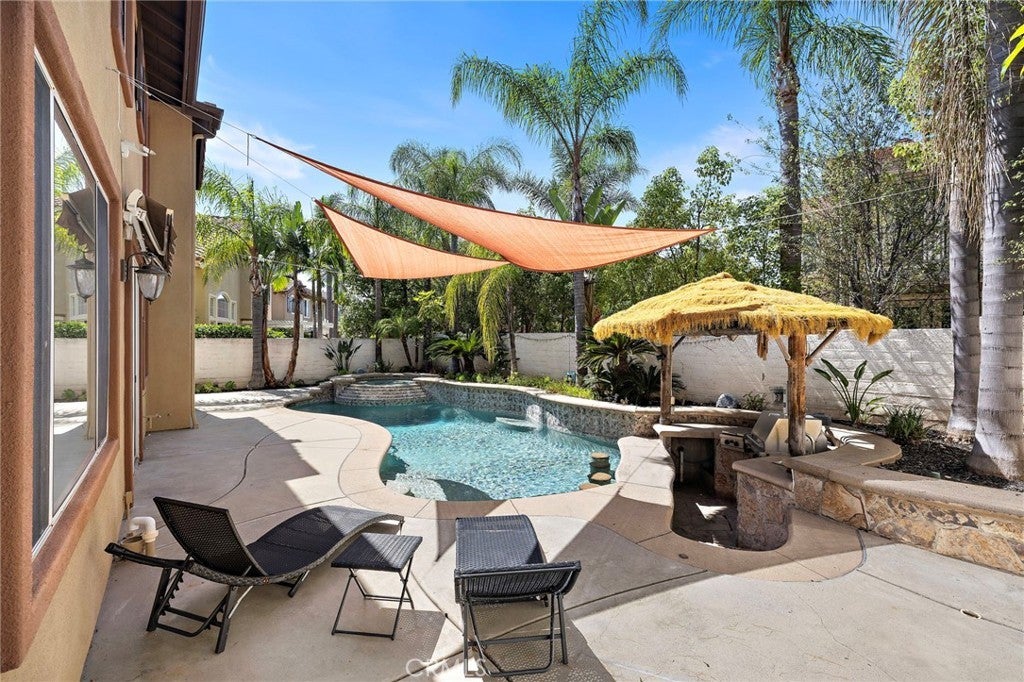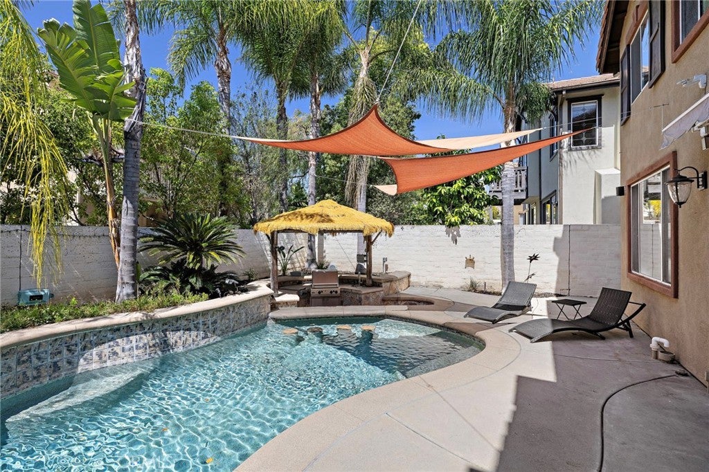 Welcome to 11625 Allen Avenue — a beautifully appointed home in the prestigious gated community of Columbia Westmont in Tustin Ranch, offering nearly 2,900 square feet of thoughtfully designed living space, including a permitted loft conversion that gives this home rare versatility you simply won't find elsewhere. Tax records reflect 5 bedrooms. The current owner converted two adjoining rooms into one generous oversized suite — creating an exceptional primary retreat or multi-generational space. The wall can easily be restored, returning the home to its original 5-bedroom configuration. Buyers get the best of both worlds. The main level impresses with large-format white porcelain tile in a stunning Calacatta marble look, plantation shutters, and a granite kitchen designed for both everyday living and effortless entertaining. Upstairs, the stairway and bedrooms are finished with warm, durable vinyl flooring throughout. The permitted loft — nearly 260 square feet — is a true bonus space, ideal as a media room, game room, home office, or second living area. A 3-car garage and low HOA complete the practical highlights. But the backyard is where this home truly shines. A pebble-tech pool with waterfall features invites you to swim up to a built-in bar with submerged stools — all beneath a gorgeous palapa-covered outdoor kitchen with built-in barbecue and spa. This is not just a backyard. It is a private resort. Only two owners since new. Zoned for award-winning Tustin Unified — walking distance to Peters Canyon Elementary and Pioneer Middle, feeding into the highly desirable Beckman High School. Minutes to the 241/261 toll roads, 5/55 interchange, Citrus Ranch Park, Peter's Canyon Regional Park, and Tustin Ranch's best dining and shopping. This is the one you have been waiting for.