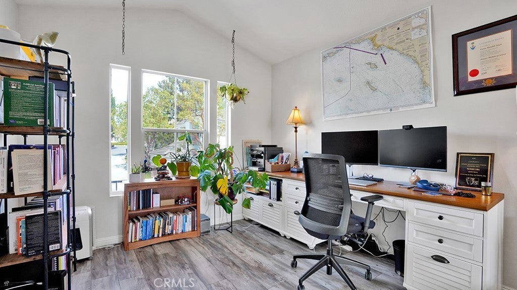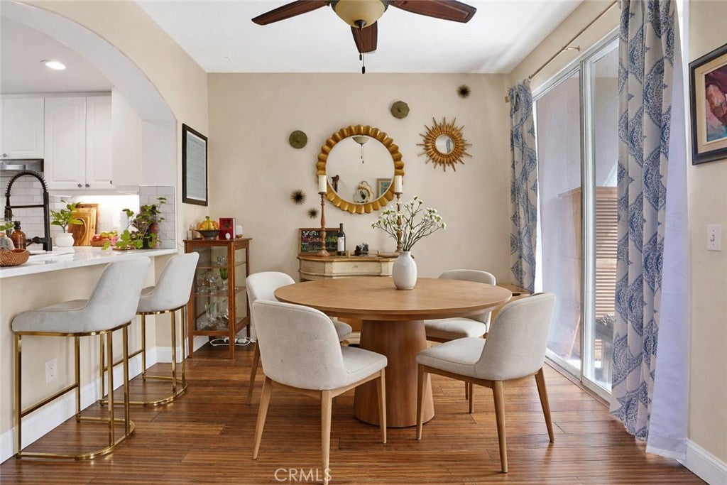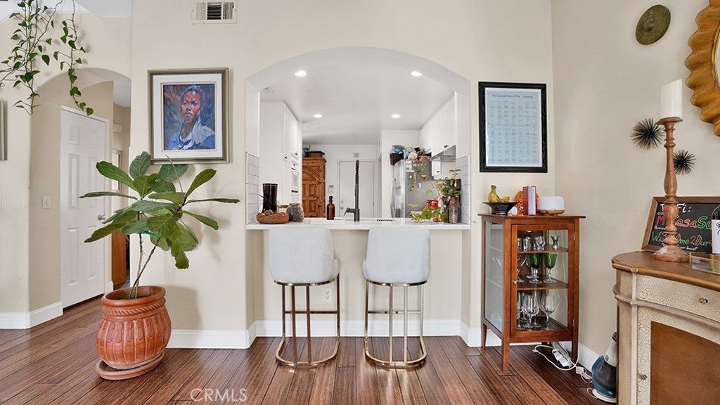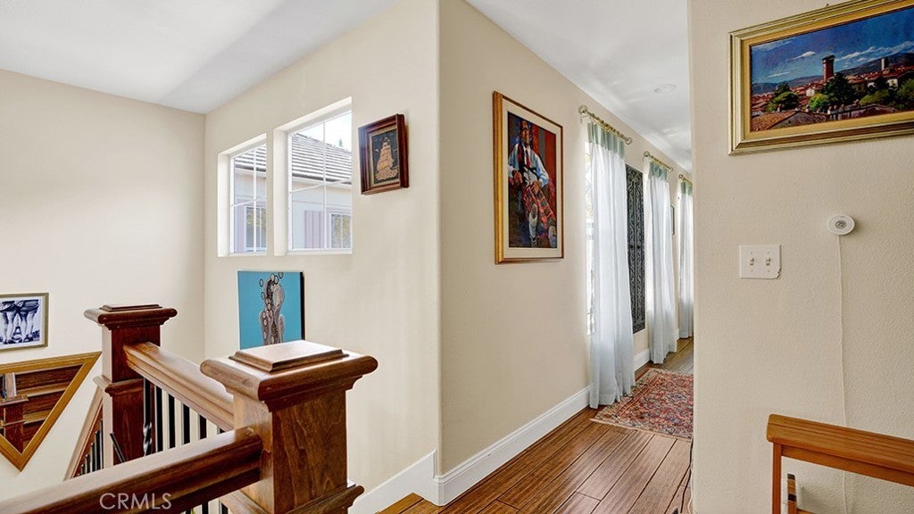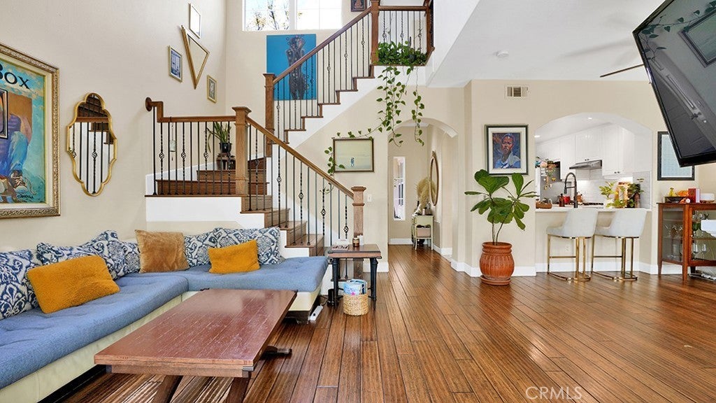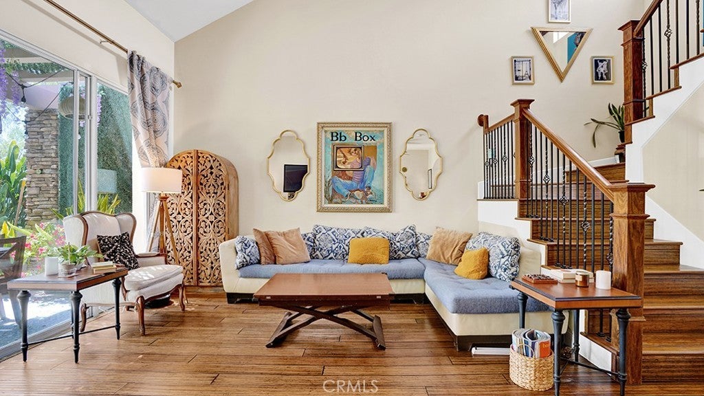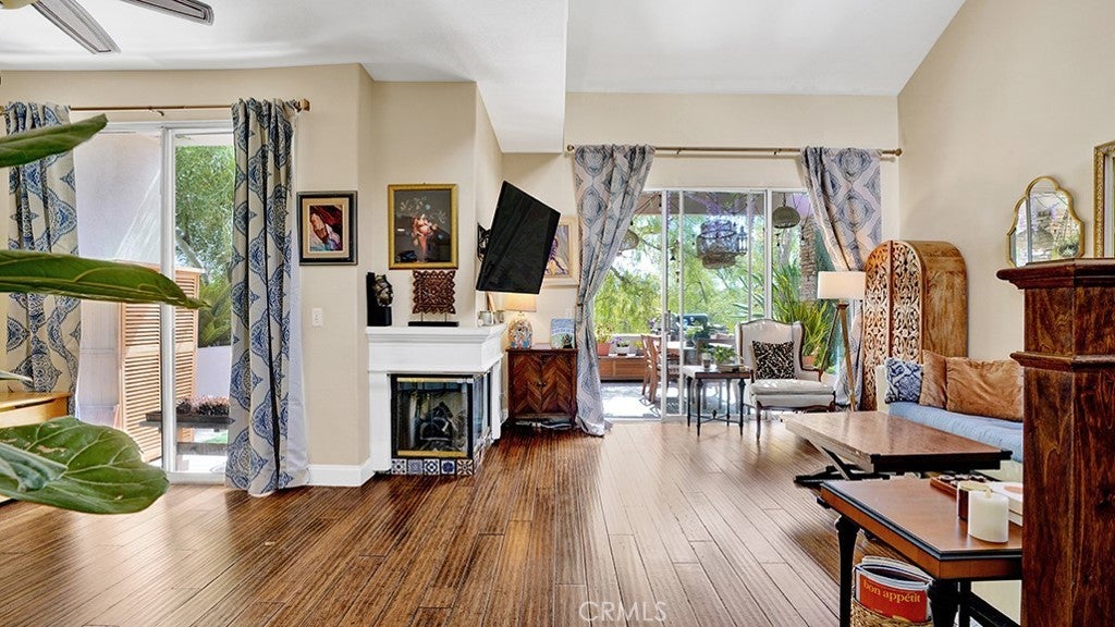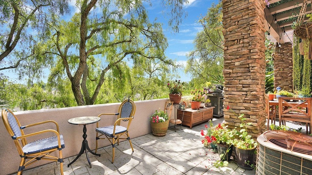 This renovated 3-bedroom, 2.5-bath townhome is nestled in the La Mirage community - just across from Soka University and steps from the trails of Aliso & Wood Canyons Wilderness Park. Inside, the open-concept main level makes an immediate impression — wide-plank hardwood floors flow throughout, anchored by a custom wrought iron staircase. The kitchen has been thoughtfully reimagined with a with a generous farmhouse sink and crisp subway tile backsplash. It opens seamlessly into the dining area and living room, creating a natural gathering space that extends through two sets of sliding doors to a large, private enclosed patio with peaceful mountain views framed by mature trees — an ideal spot for morning coffee or evening unwinding. Upstairs, the primary suite is a proper retreat: vaulted ceilings, dual closets, and a well-appointed en-suite bathroom. Two additional bedrooms and a full bath offer flexibility for family, guests, or a dedicated home office. Outfitted with a full suite of smart home technology including Ecobee Smart Thermostat with temperature sensors throughout the home, Flair Smart Vents, Aqara Smart Video Doorbell, Philips Wiz Multicolor Smart Lights at the entrance and various rooms, and Schlage Smart Lock on the front door. The attached two-car garage with direct interior access adds everyday convenience. It is also EV-ready, featuring a dedicated 240V outlet for Level 2 charging. Ample guest parking makes hosting seamless. La Mirage is a well-maintained community offering a pool, spa, tennis courts, and a clubhouse, with easy access to the 73 Toll Road, Aliso Viejo Town Center, and top-rated Capistrano Unified schools. Hiking and biking trails, beaches, and the energy of coastal Orange County are all within easy reach.